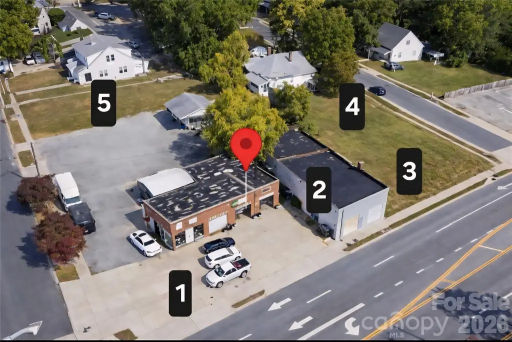 This commercial development package features five lots and two buildings situated in a growing area of Gastonia. The property offers frontage on three sides: 224.32 feet on W Franklin Blvd, 215.73 feet on S Firestone, and 127 feet on S Dalton, totaling 567.05 feet across 0.89 acres. The two buildings provide a total of 4656 square feet, with one building measuring 1872 square feet and the other 2784 square feet. Ceiling heights range from 9 to 12 feet. The property includes four bays and garage doors ranging from 8 to 11 feet in height. It is located within walking distance of the FUSE district and faces the historic Loray Mill complex, offering accessibility, visibility, and convenience. The five lots have the following PIDs: 106167, 106166, 106170, 106171, and 106165, corresponding to 1108 W Franklin, 1104 Dalton, 110 S Firestone, and Lot-Dalton.