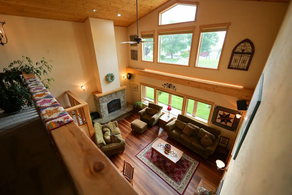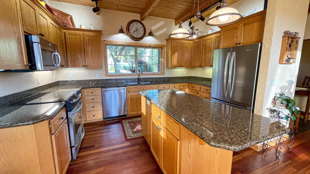 - Built-in Features, Ceiling Fan(s), Double Vanity, Enclosed Toilet(s), Fiberglass Stall Shower, Granite Counters, Kitchen Island, Linen Closet, Open Floorplan, Primary Downstairs, Shower/Tub Combo, Smart Thermostat, Soaking Tub, Tile Counters, Vaulted Ceiling(s), Walk-In Closet(s), Wired for Data, Wired for Sound