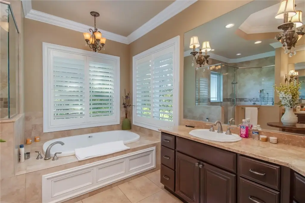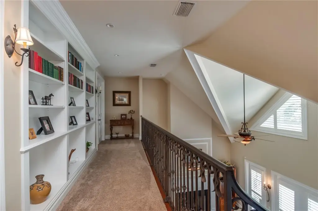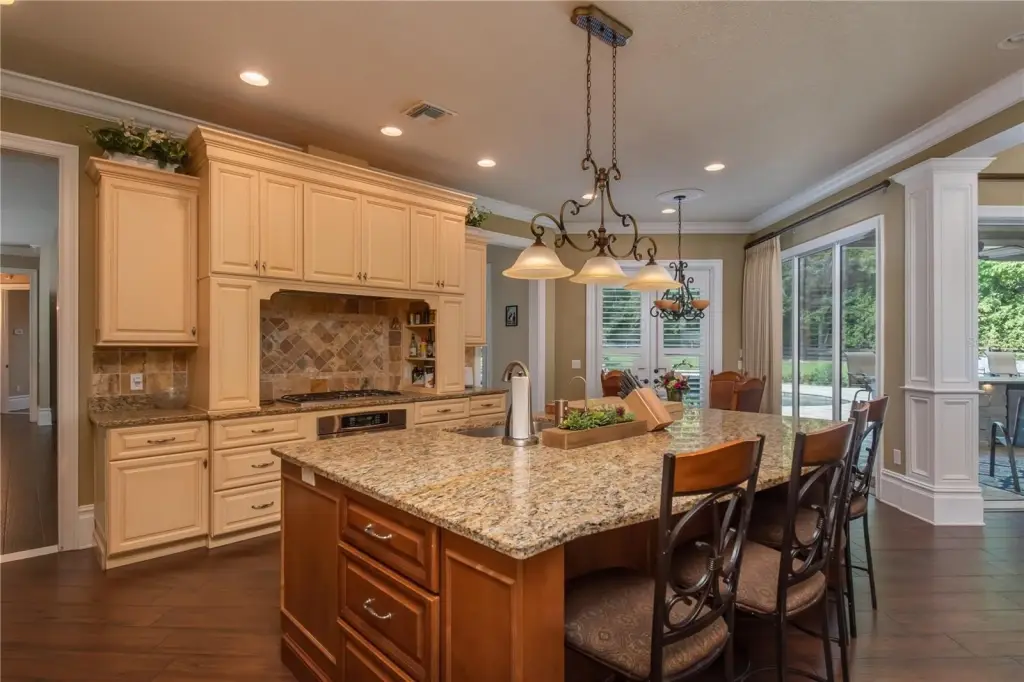 - Built-in Features, Ceiling Fans(s), Chair Rail, Coffered Ceiling(s), Crown Molding, Eat-in Kitchen, High Ceilings, Kitchen/Family Room Combo, Solid Surface Counters, Solid Wood Cabinets, Tray Ceiling(s), Walk-in Closet(s), Window Treatments