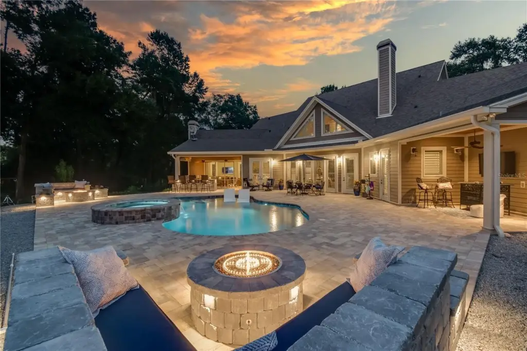 - Fencing, French Doors, Lighting, Outdoor Grill, Outdoor Kitchen, Rain Gutters, Sliding Doors, Pool