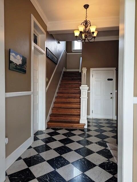 - Ceiling Fan(s), Chandelier, Crown Molding, High Ceilings