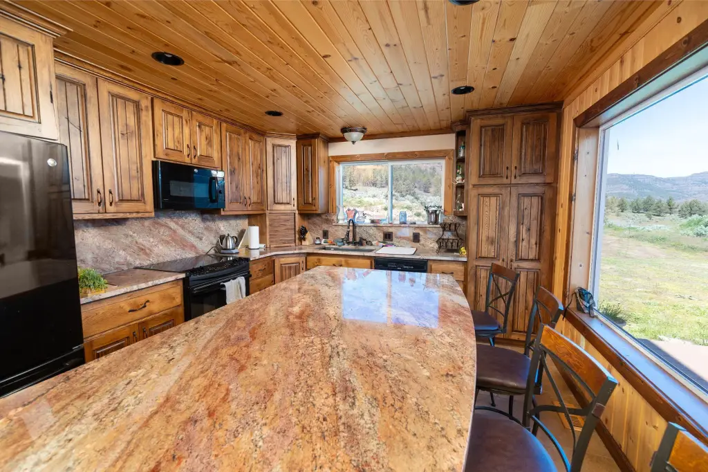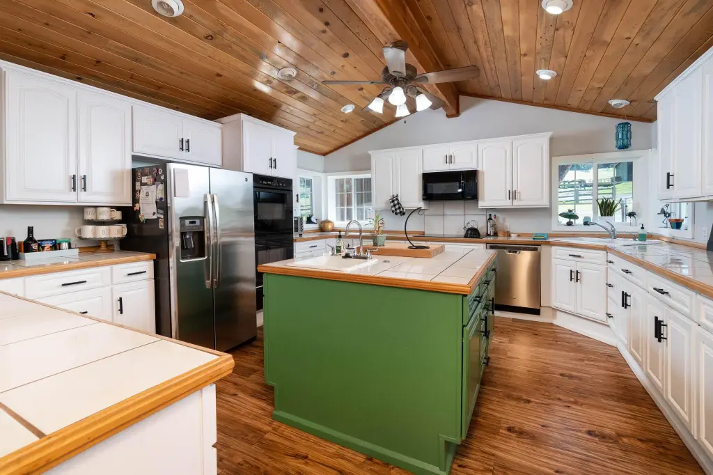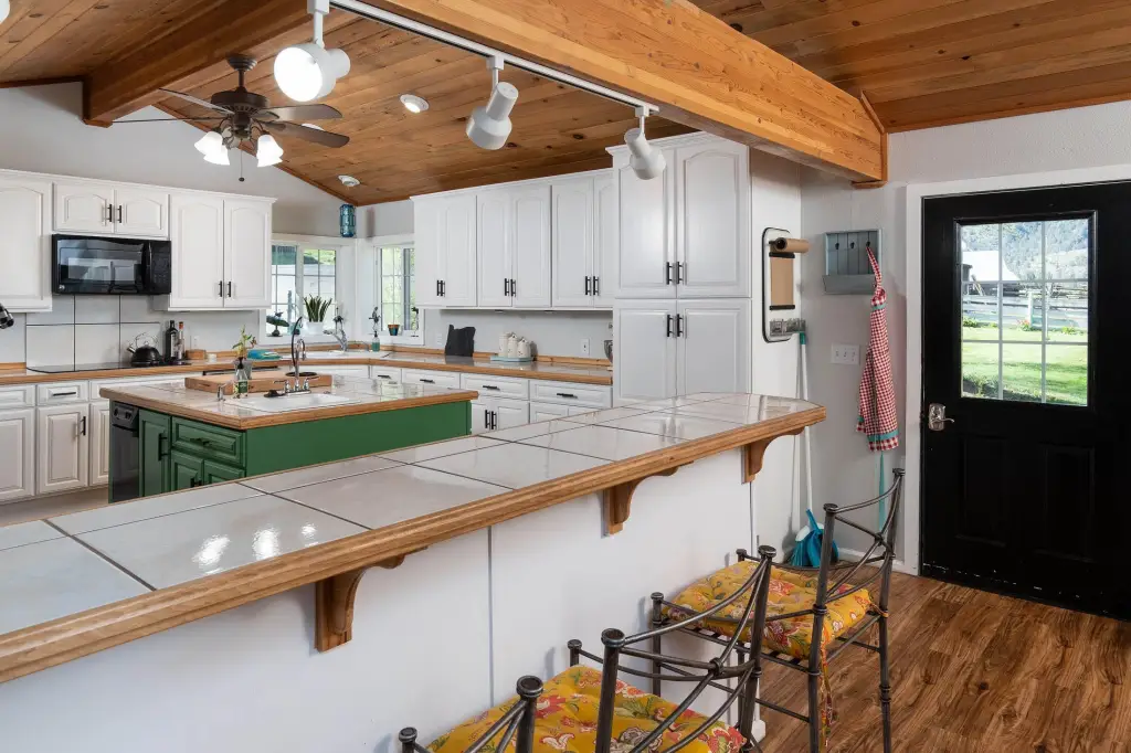 - Breakfast Bar, Ceiling Fan(s), Kitchen Island, Open Floorplan, Pantry, Primary Downstairs, Shower/Tub Combo, Soaking Tub, Spa/Hot Tub, Tile Counters, Tile Shower, Vaulted Ceiling(s)