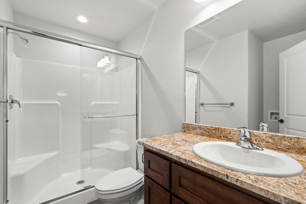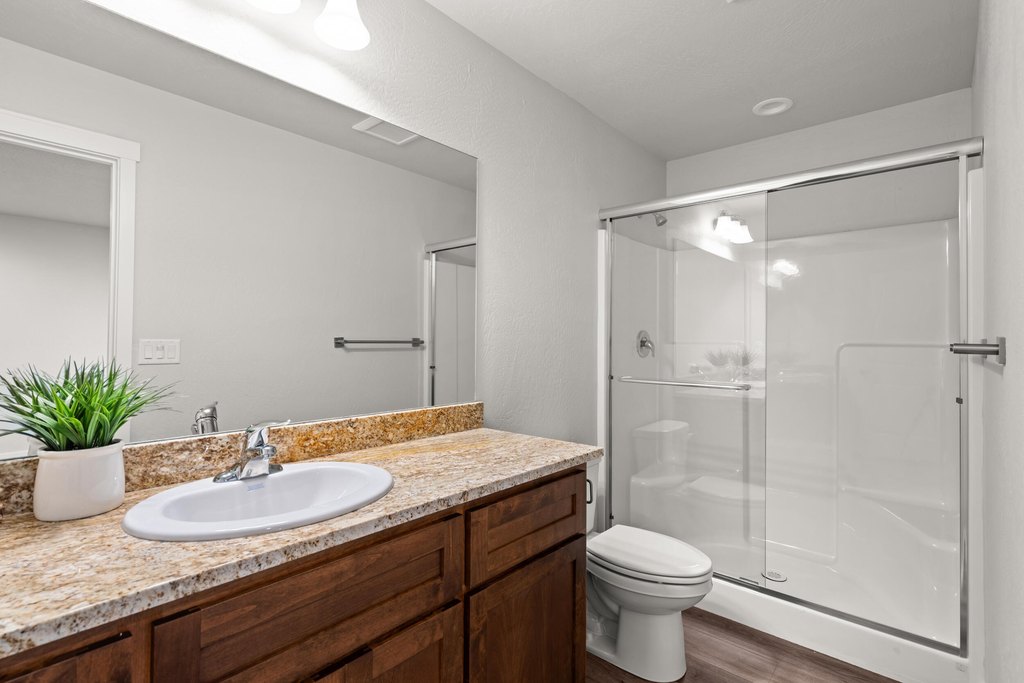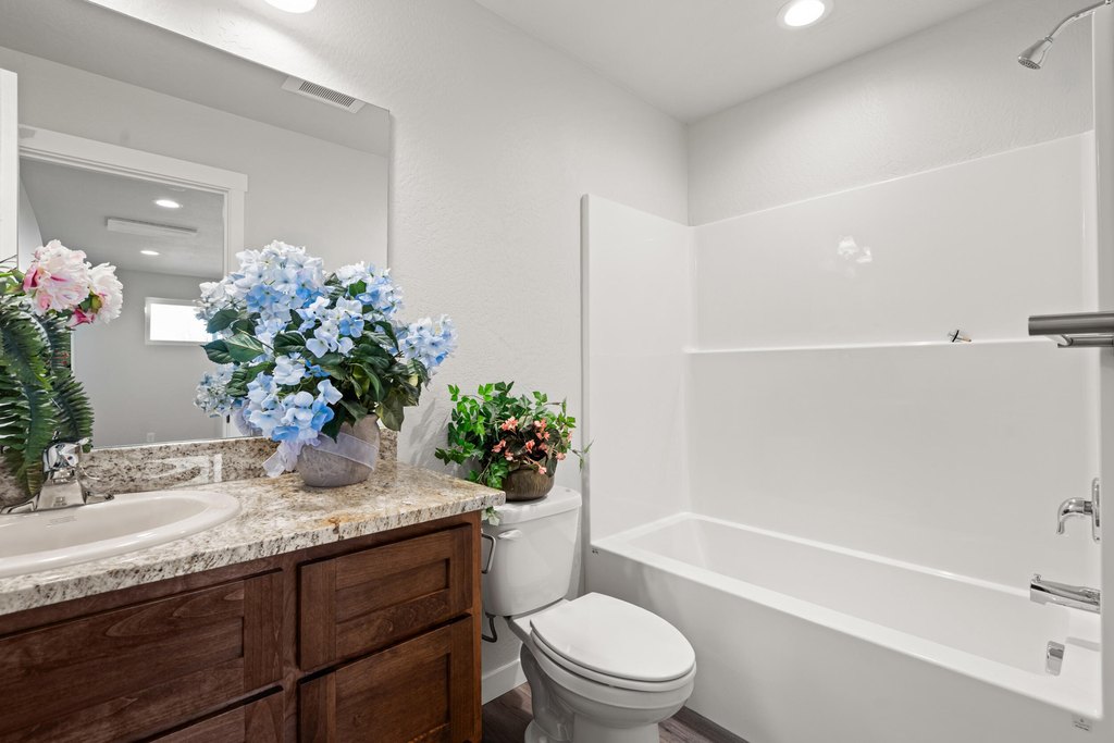 - Breakfast Bar, Ceiling Fan(s), Granite Counters, Open Floorplan, Primary Downstairs, Shower/Tub Combo, Solid Surface Counters, Stone Counters, Walk-In Closet(s)