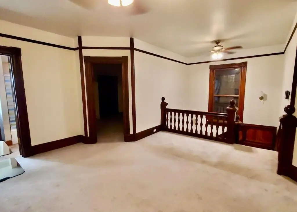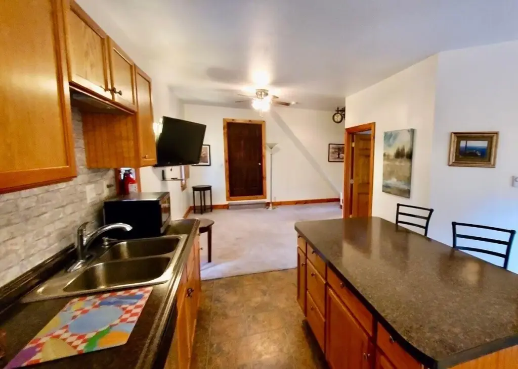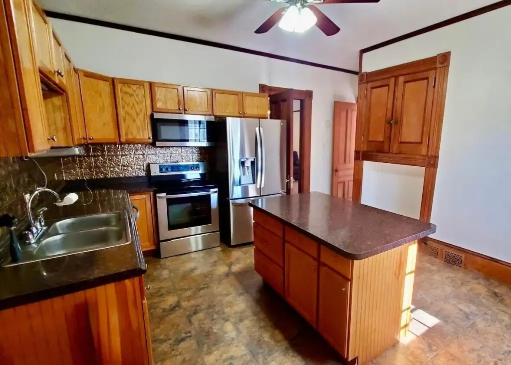 - Stone Counters, Apartment, Built-in Features, Ceiling Fan(s), Crown Molding, Kitchen Island, Natural Woodwork