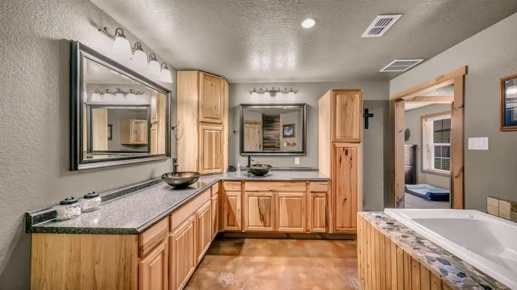 - Decorative Lighting, Double Vanity, Eat-in Kitchen, Granite Counters, Kitchen Island, Natural Woodwork, Open Floorplan, Pantry, Walk-in Closet(s)
