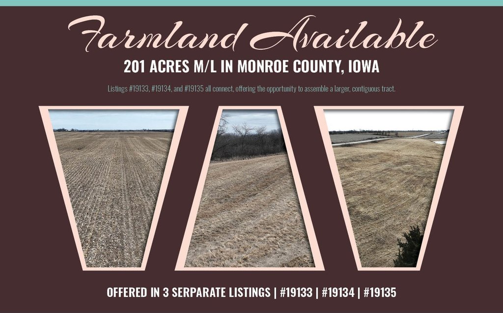 This 141.00 acre farm, located in Monroe County, Iowa, features 130.41 acres of tillable farmland. The property has an overall CSR2 rating of 79.1, supported by Otley and Mahaska silty clay loam soils, known for their consistency and yield potential. The farm has undergone land cleanup, along with the installation of terraces and tile drainage, improving water management, erosion control, and overall field efficiency. These conservation improvements enhance farmability and help protect long-term soil productivity while maximizing usable acres. The property presents an opportunity for operators or investors seeking dependable row-crop production and long-term value appreciation. Listings #19133, #19134, and #19135 all connect, offering the opportunity to assemble a larger, contiguous tract.