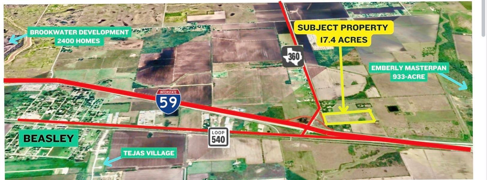 The property is located near FM 360 in Beasley, Texas. Traveling from Rosenberg, take I-69/US-59 South towards Beasley and exit onto FM 360. The property is situated along the northbound feeder road near the FM 360 intersection in Fort Bend County.