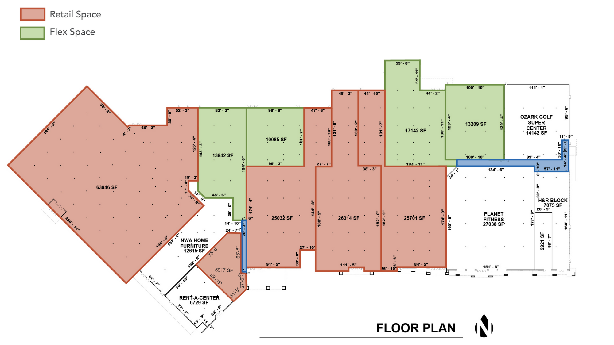 Prime retail location with flexible sizing, parking, and dock.