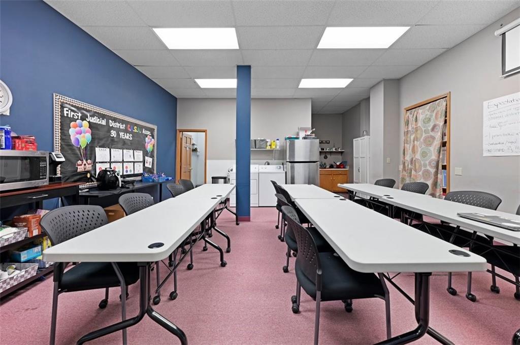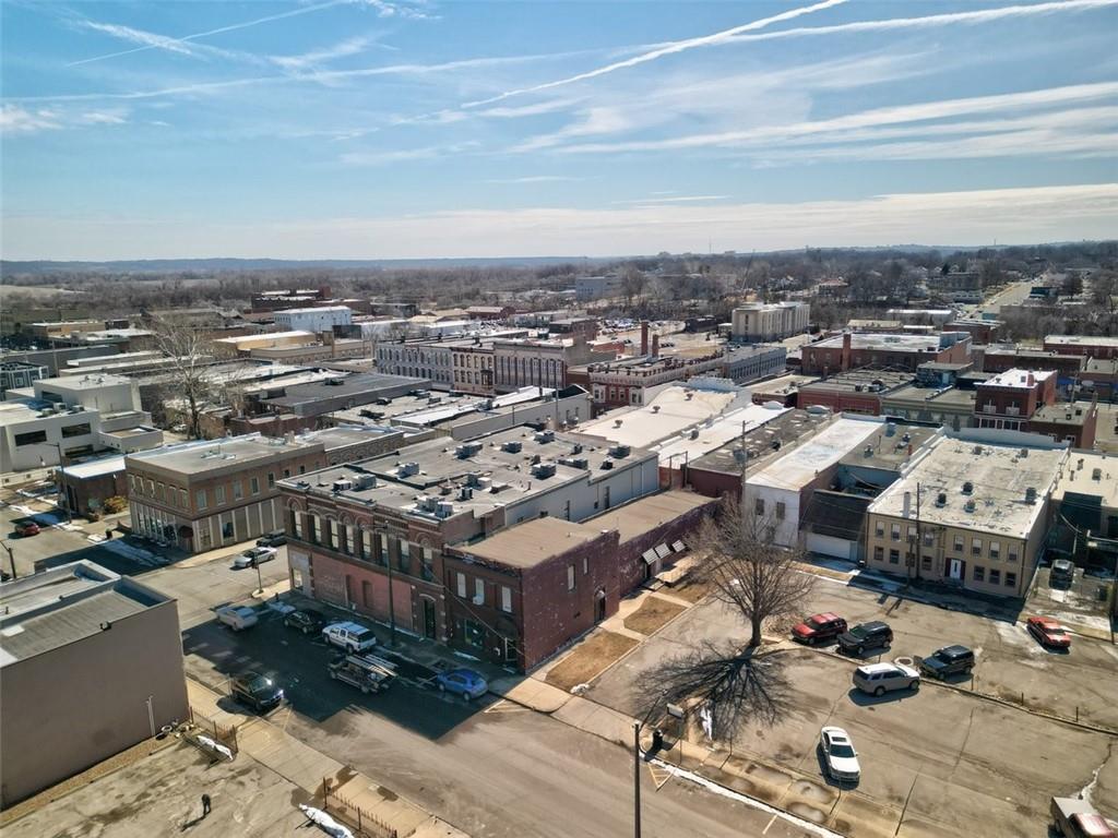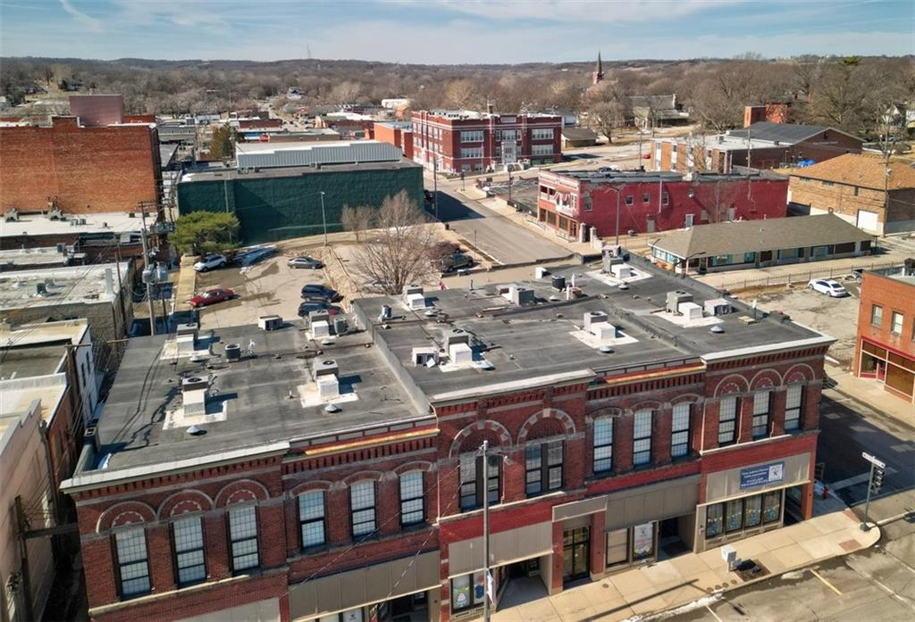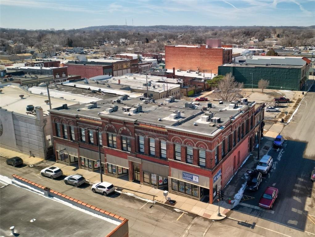 Located in downtown Leavenworth, this mixed-use building, known as the O'Donnell Building, was constructed in 1890 and has been well-maintained. The property features two commercial spaces and nine residential units. All units are currently leased and 100% occupied, presenting a business opportunity. The larger commercial space is under a seven-year lease that will transfer with the sale of the property; all other tenants have one-year leases. Each commercial space has separate entrances. The residential units are accessible via two common area entrances, leading to a shared hallway, staircase, and a small elevator. A large laundry room is available for the residential tenants. Situated on a corner lot, the building offers storefront street parking, with a public parking area located adjacent to the west side for residential parking convenience.