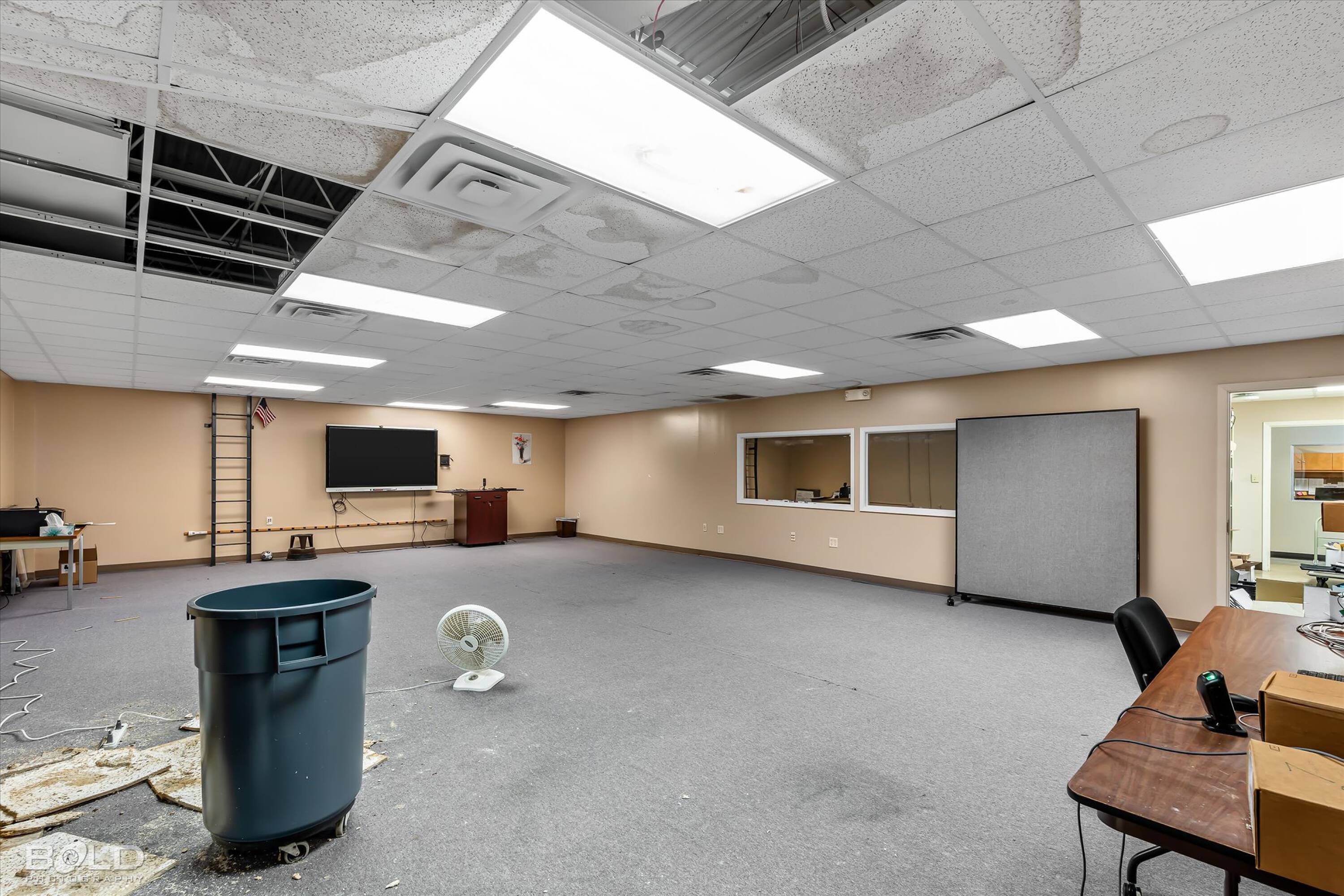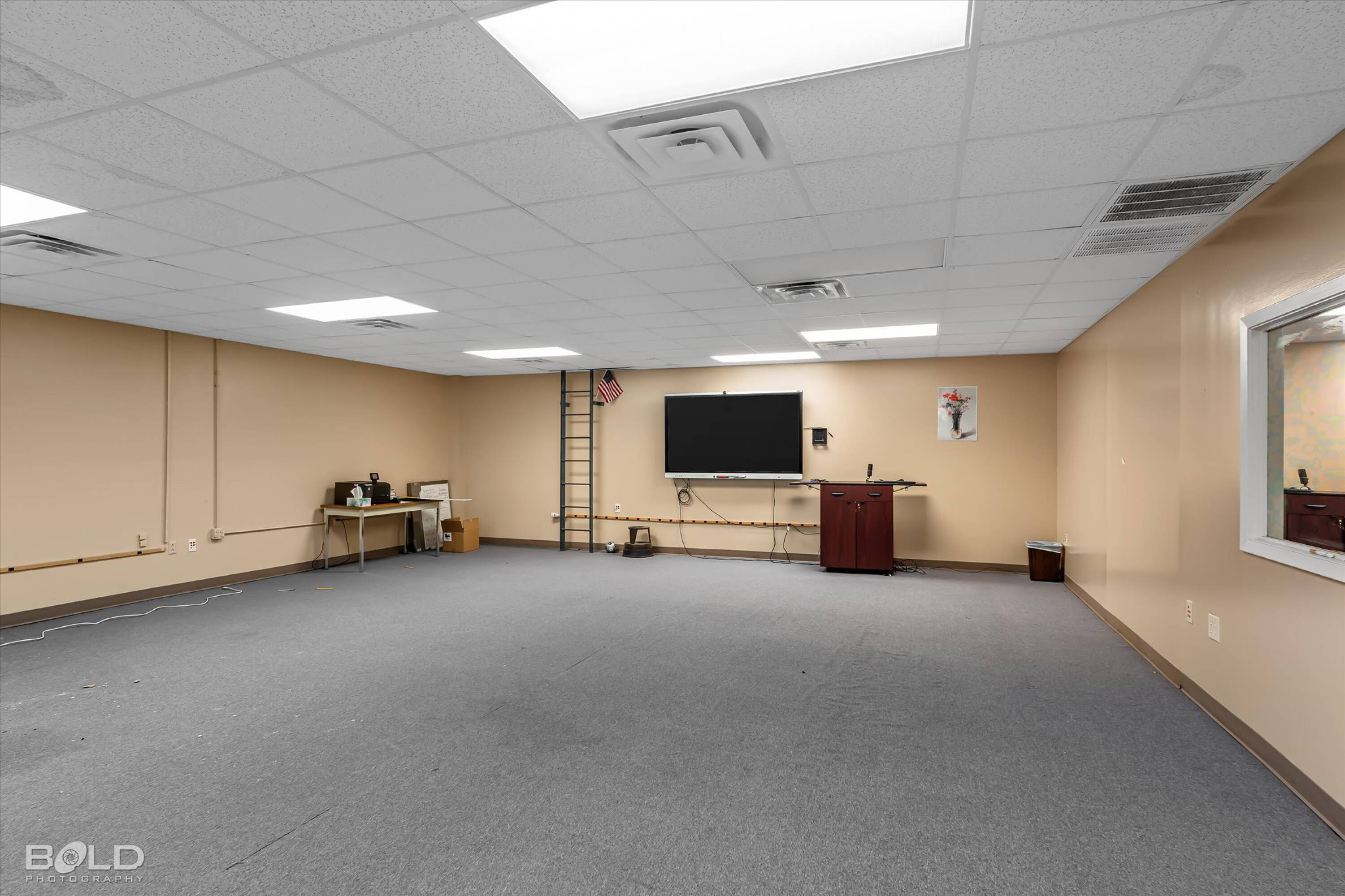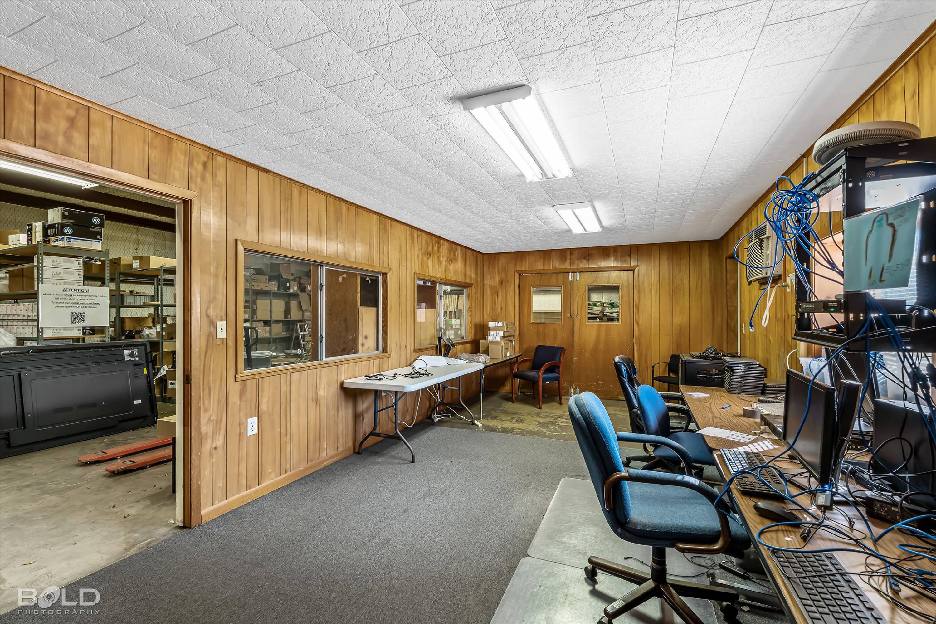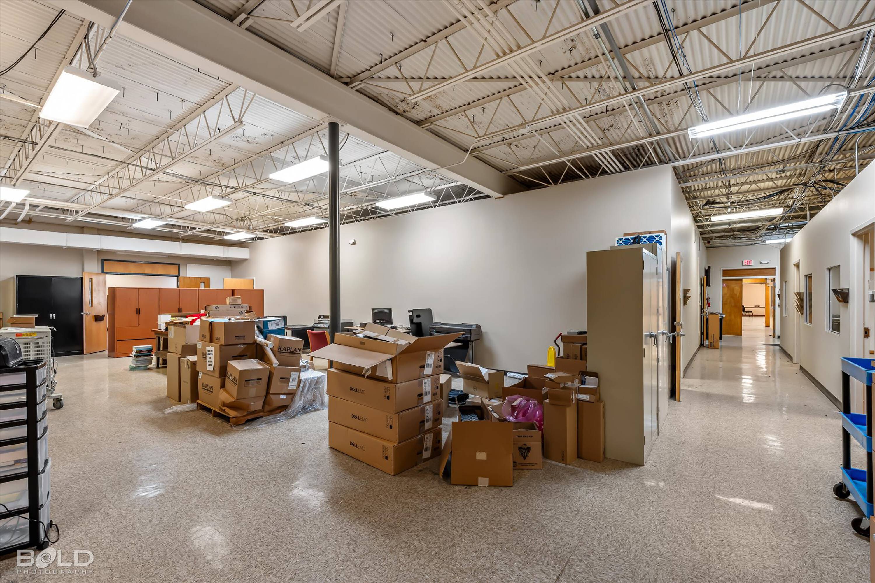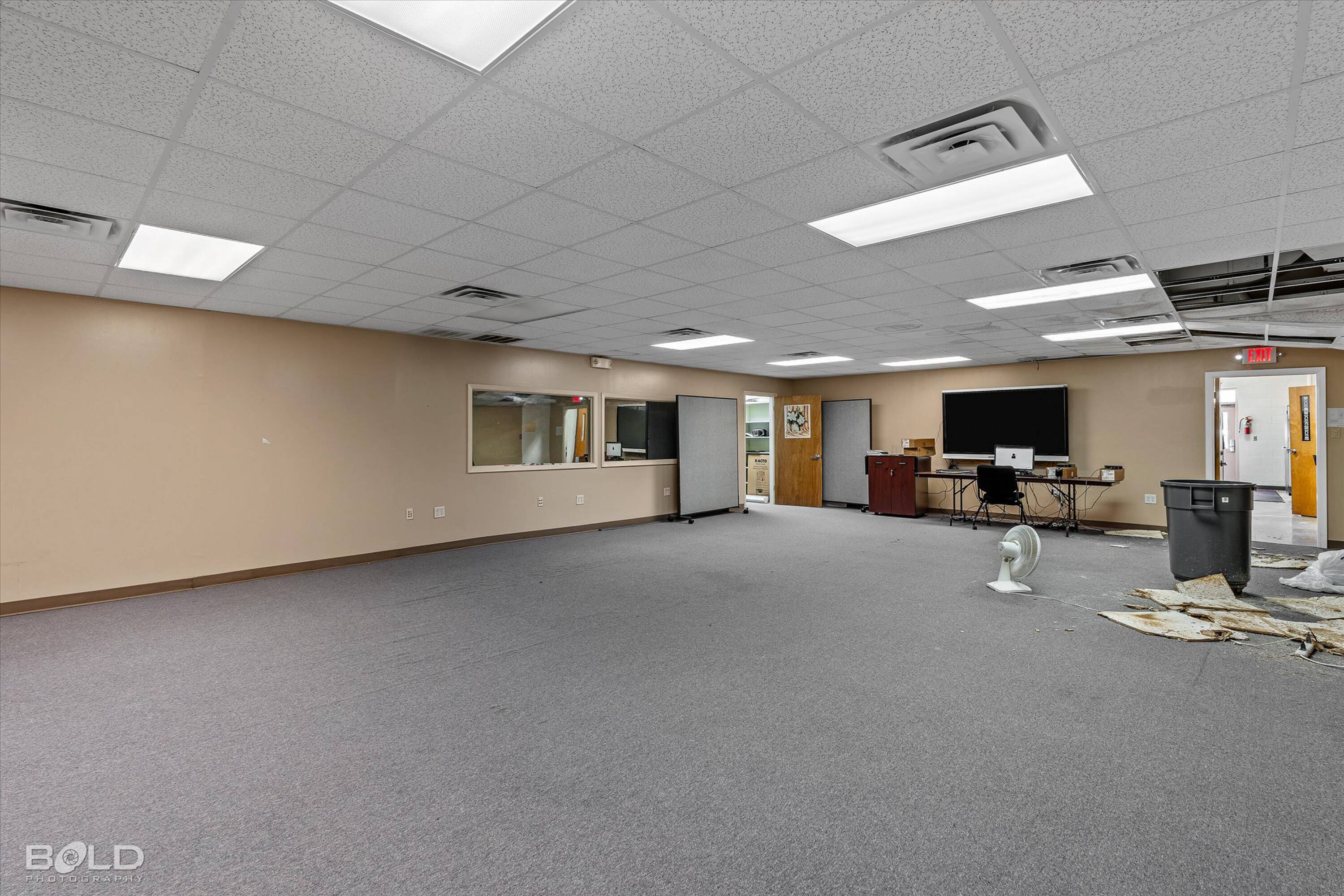 Adaptable commercial space with media center, warehouse, and special services.