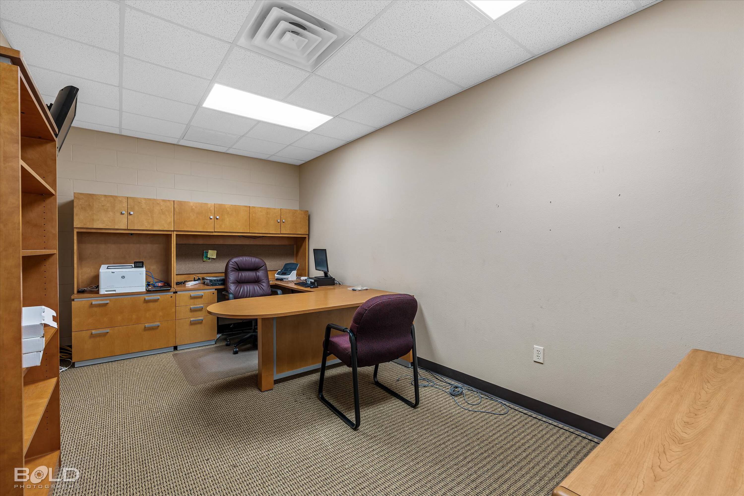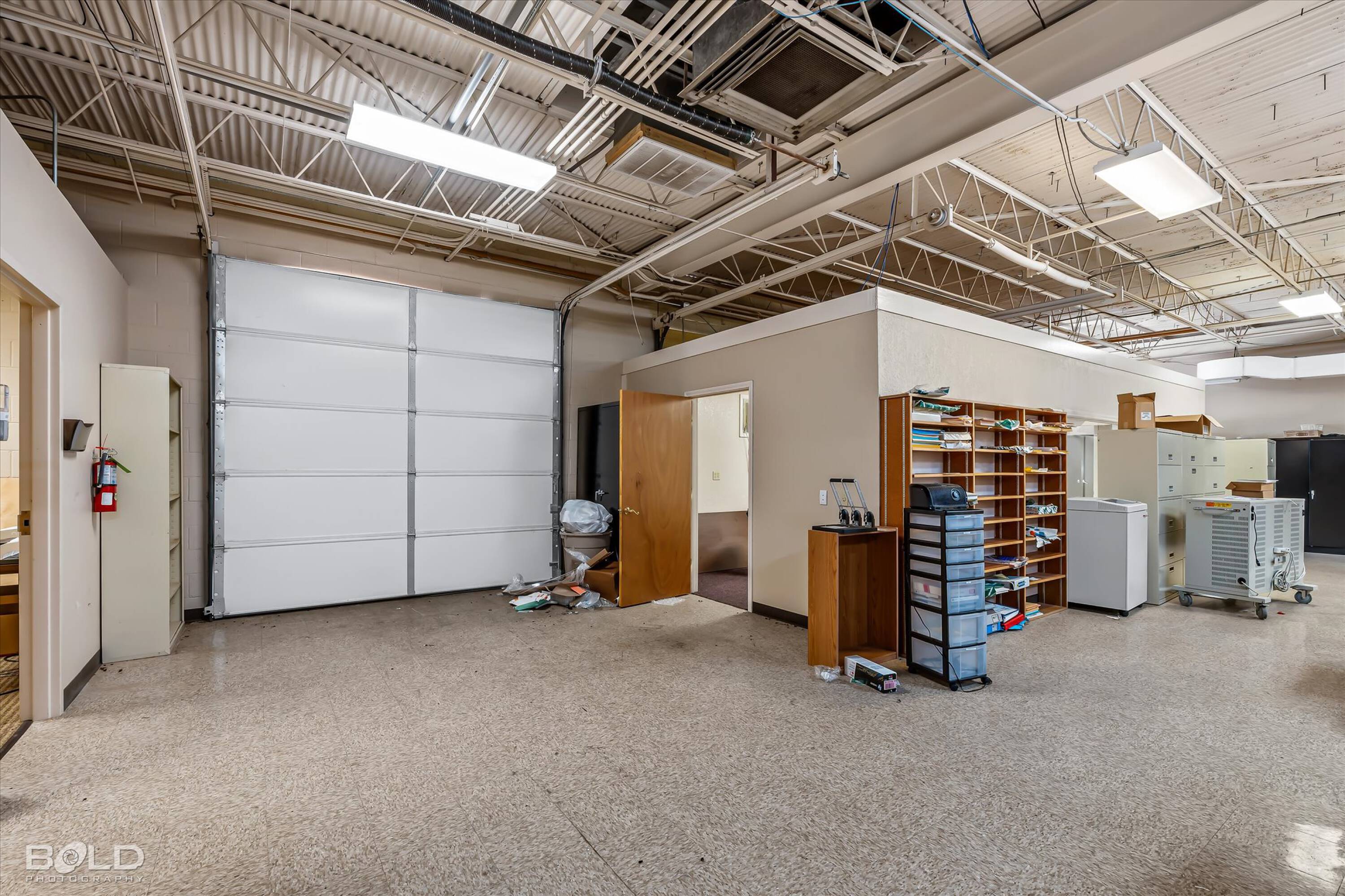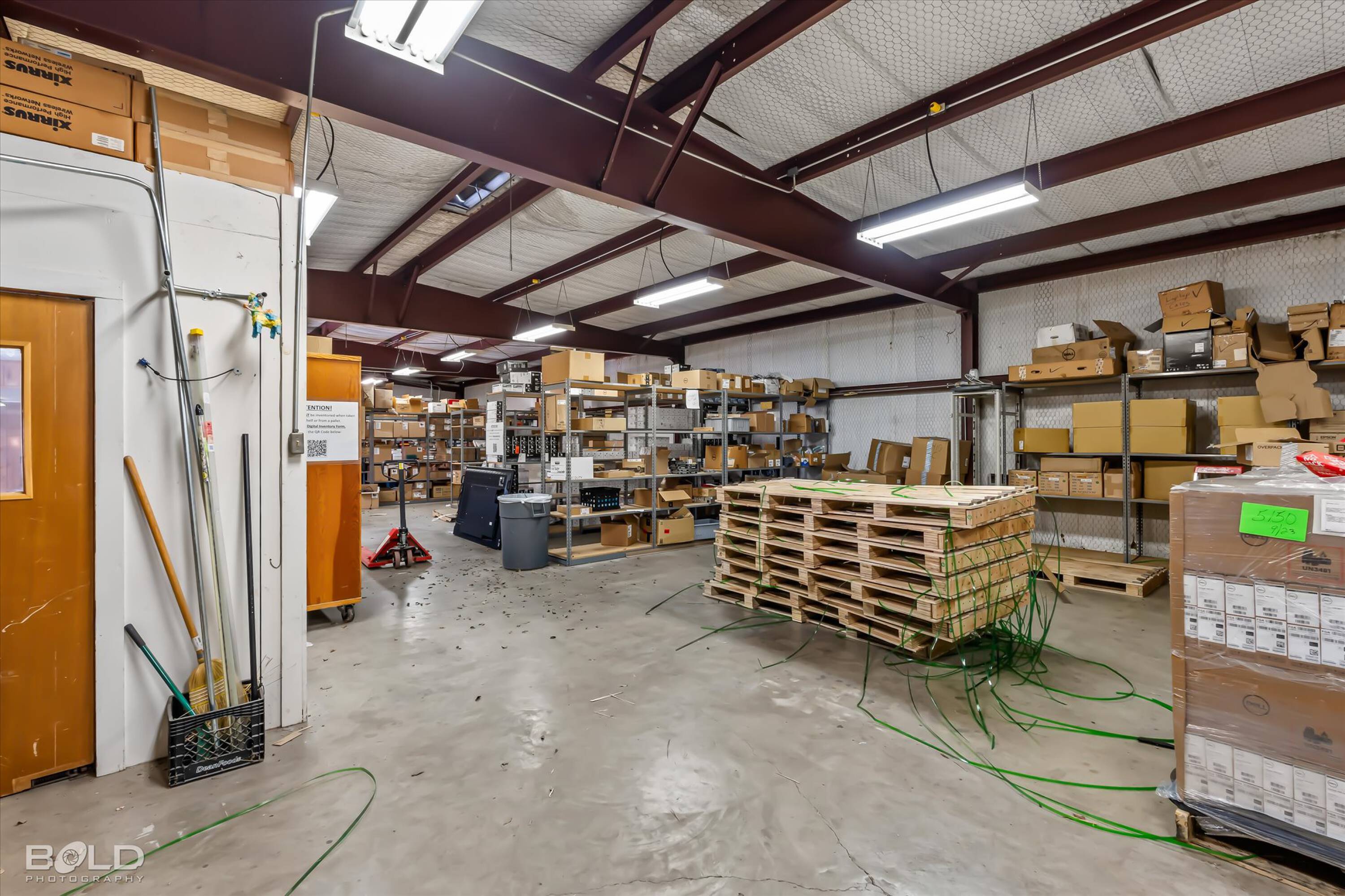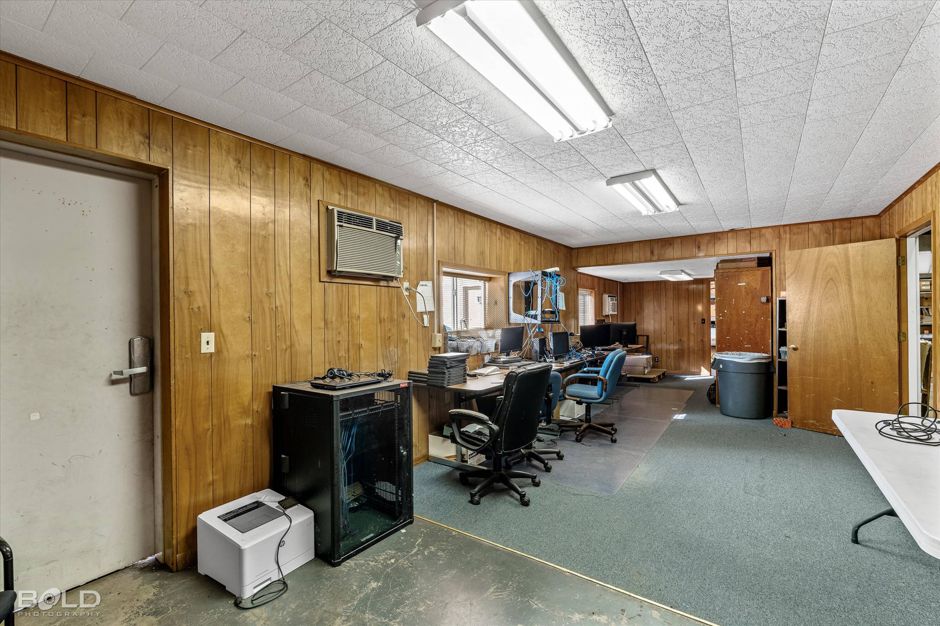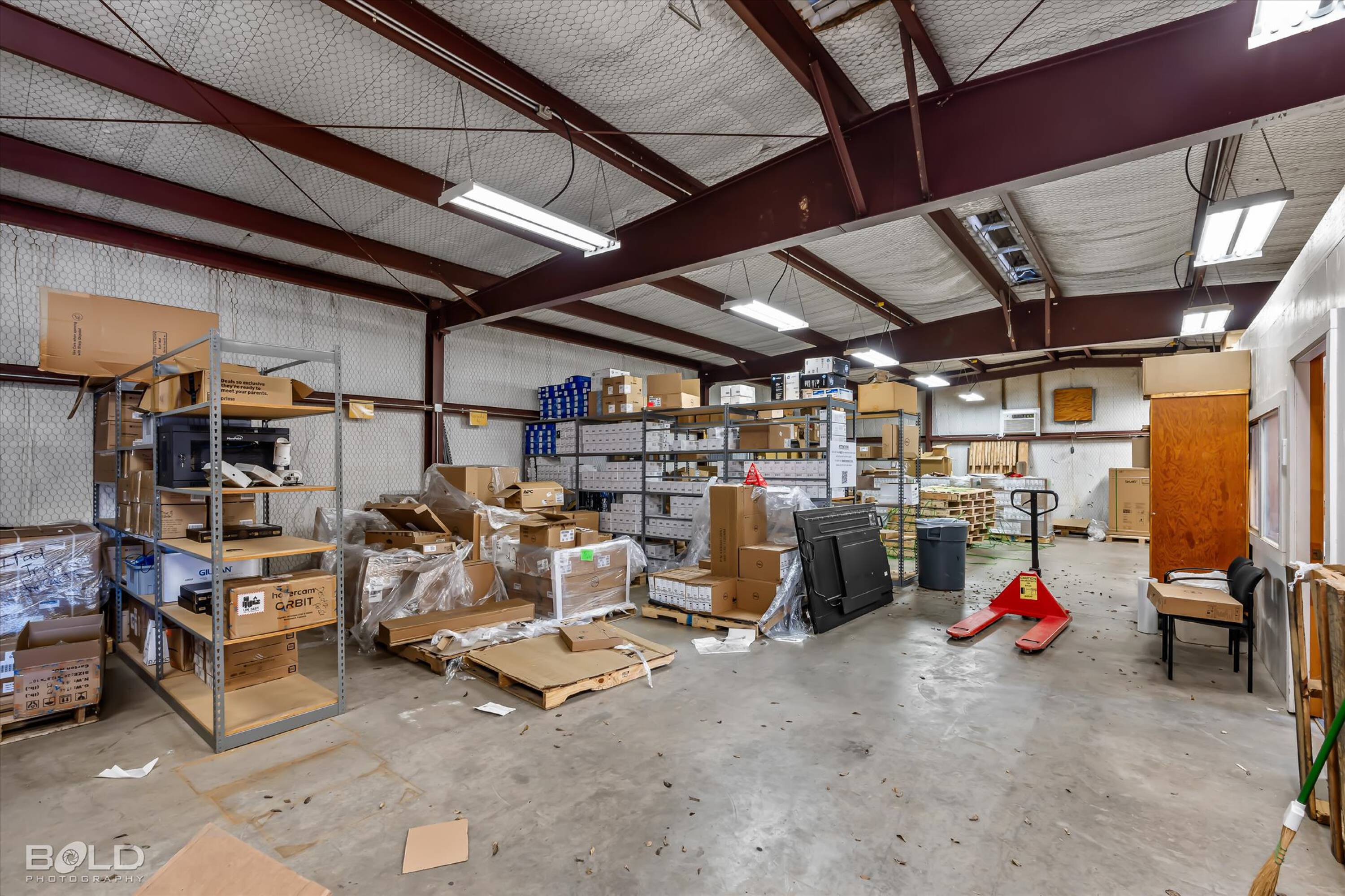 Adaptable commercial space with media center, warehouse, and special services.