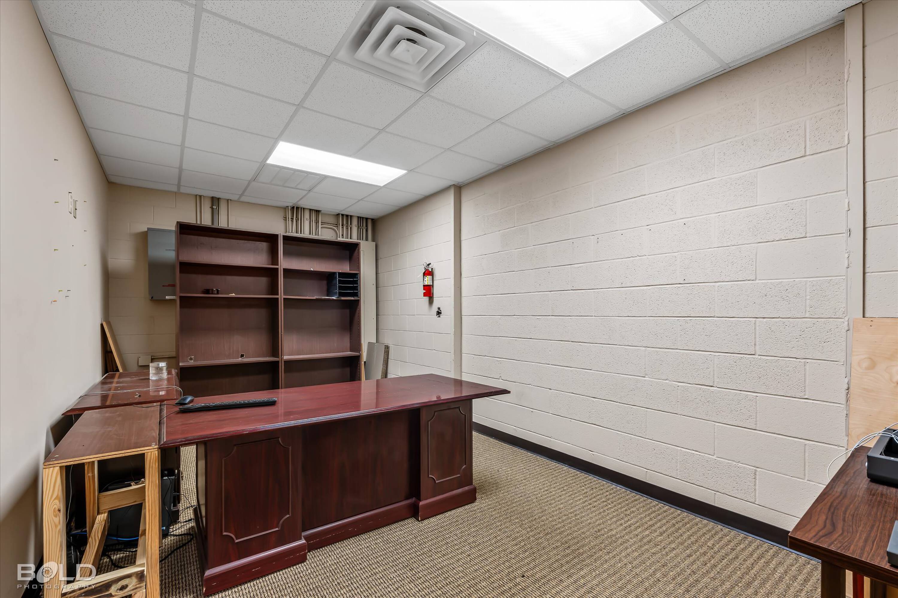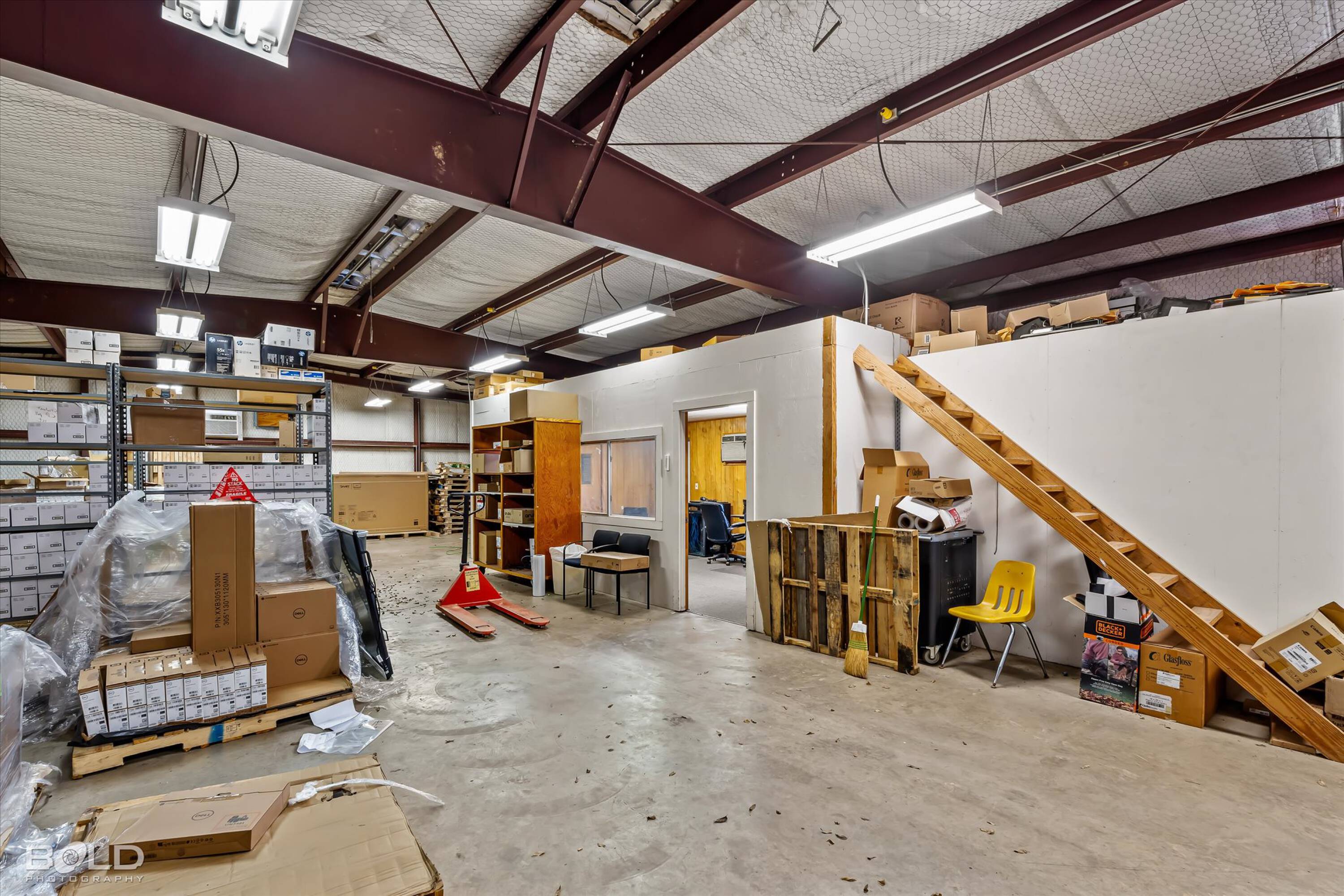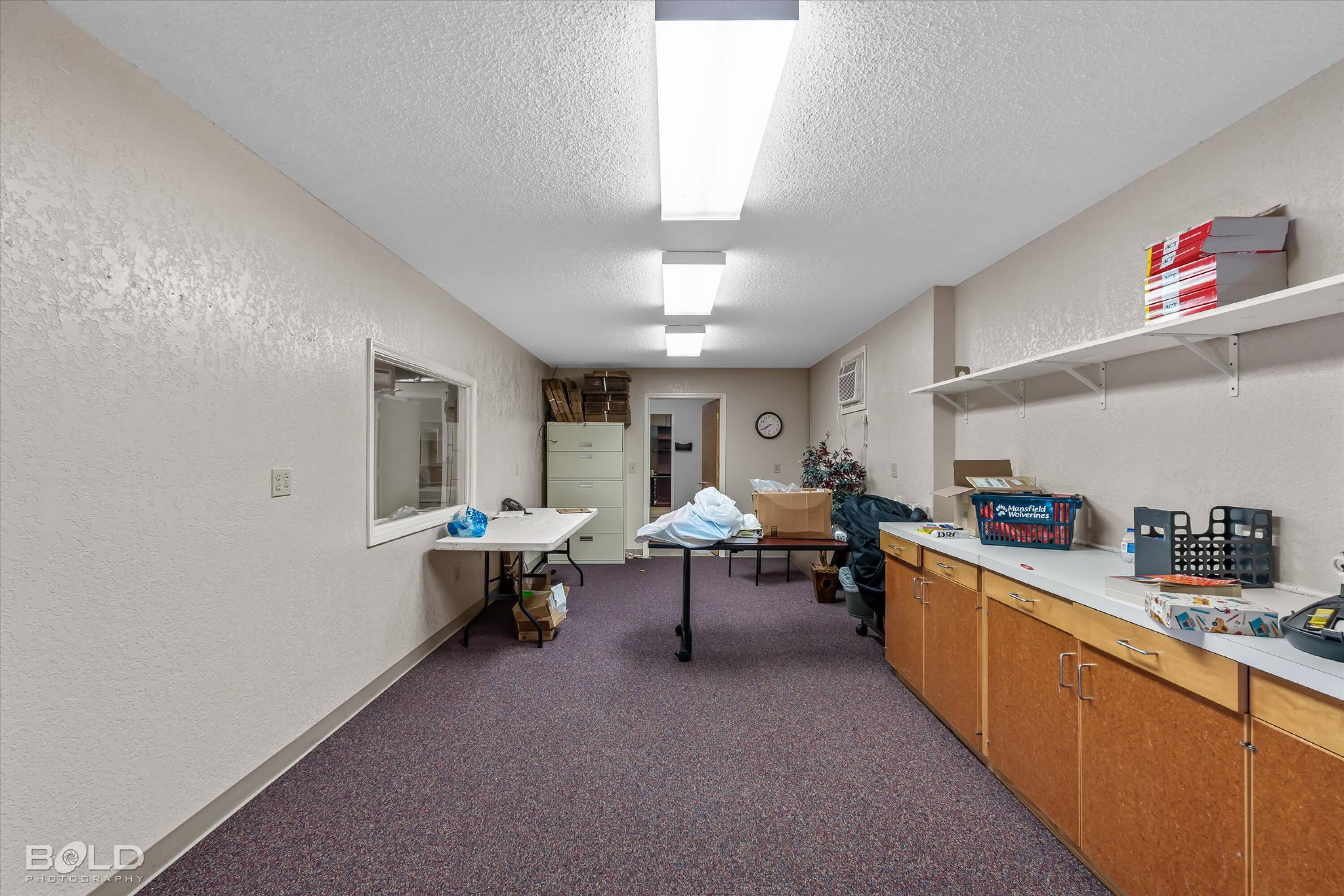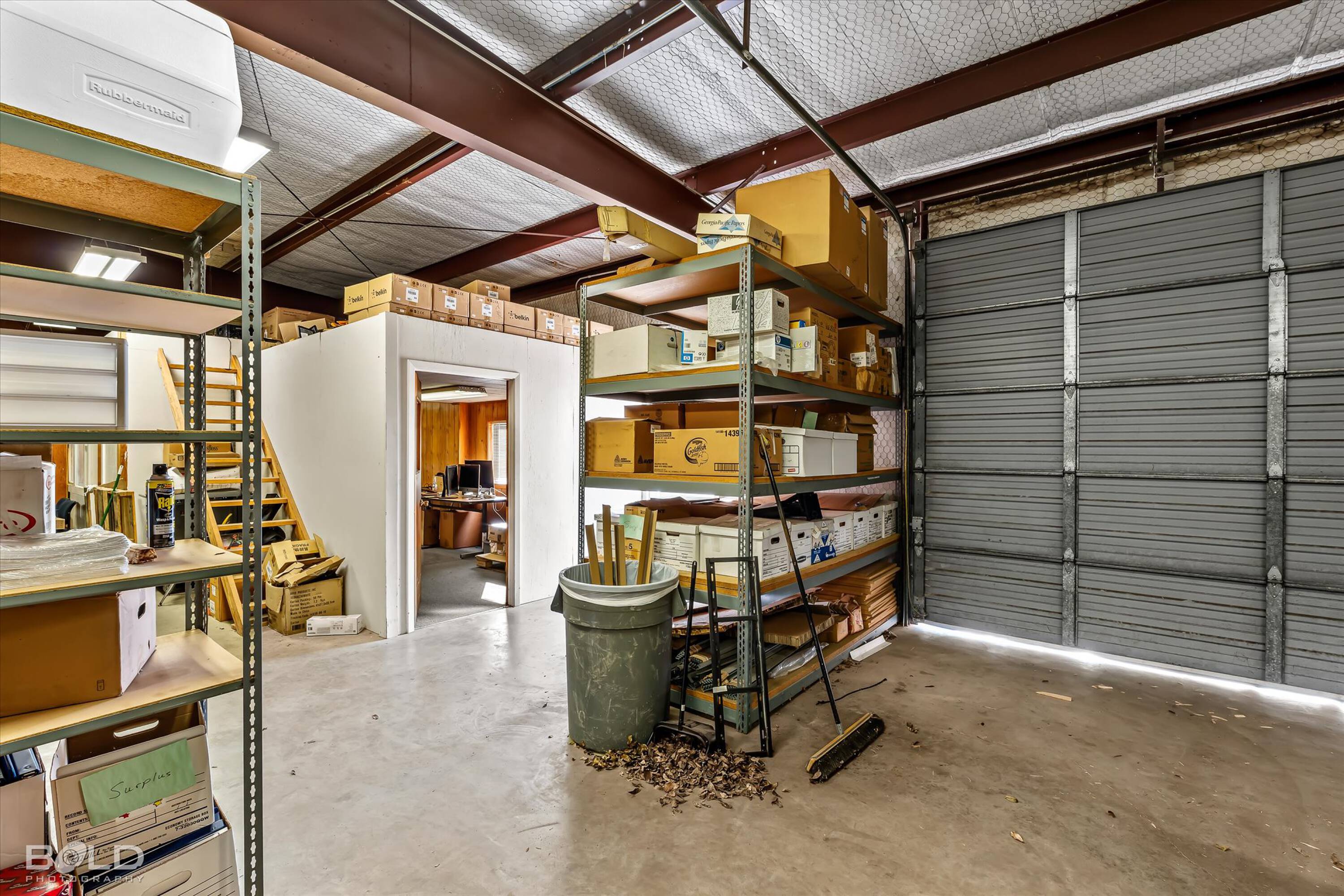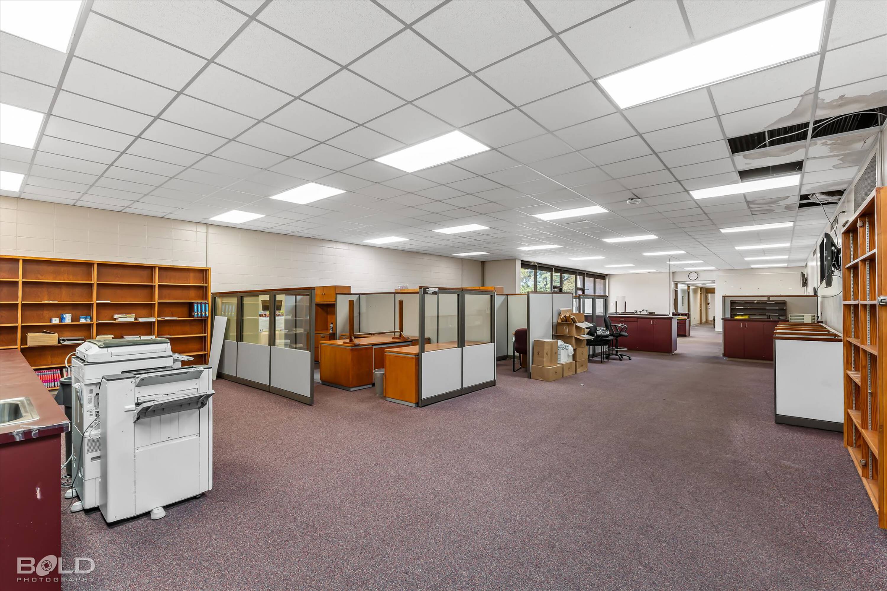 Adaptable commercial space with media center, warehouse, and special services.