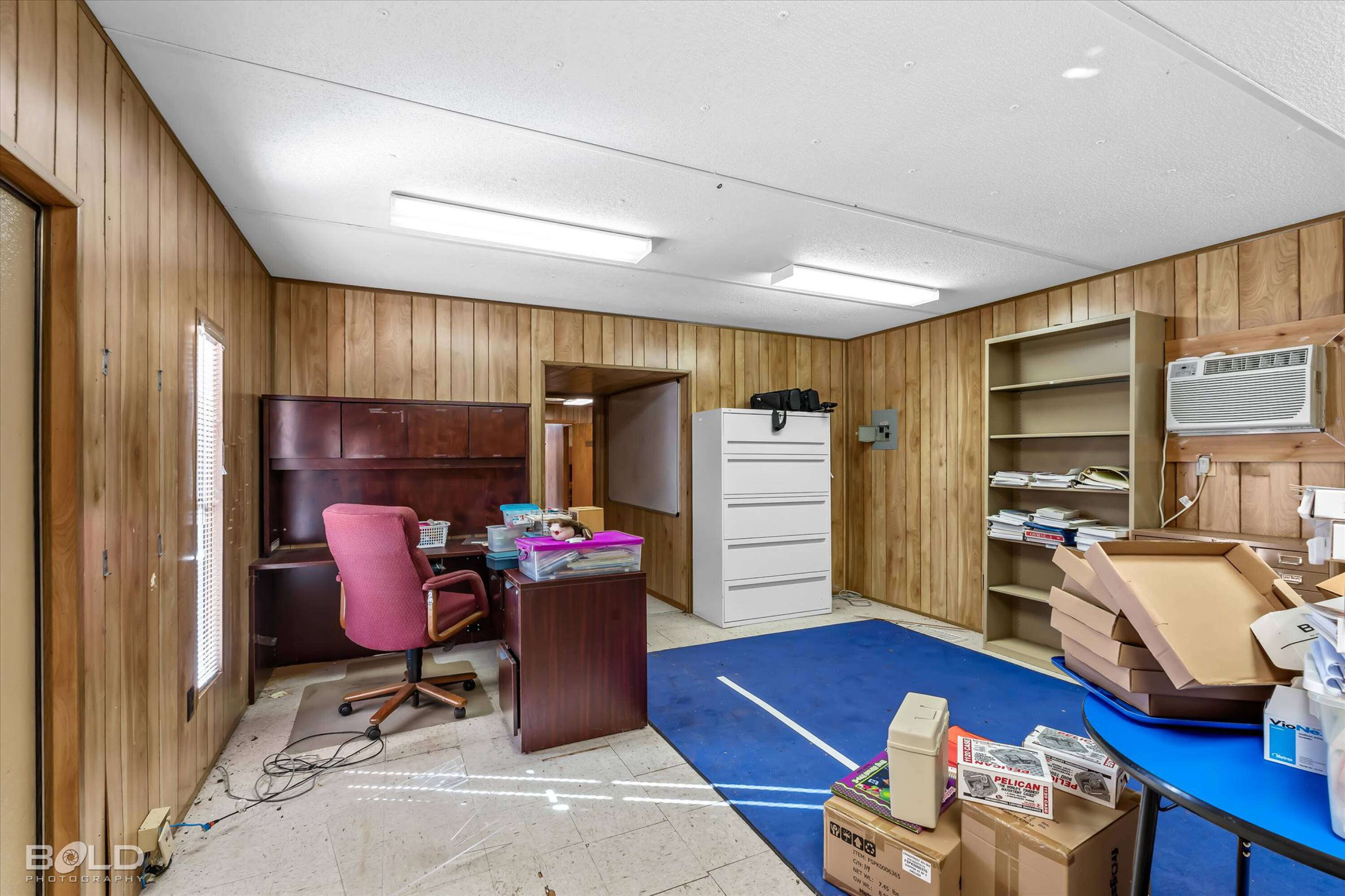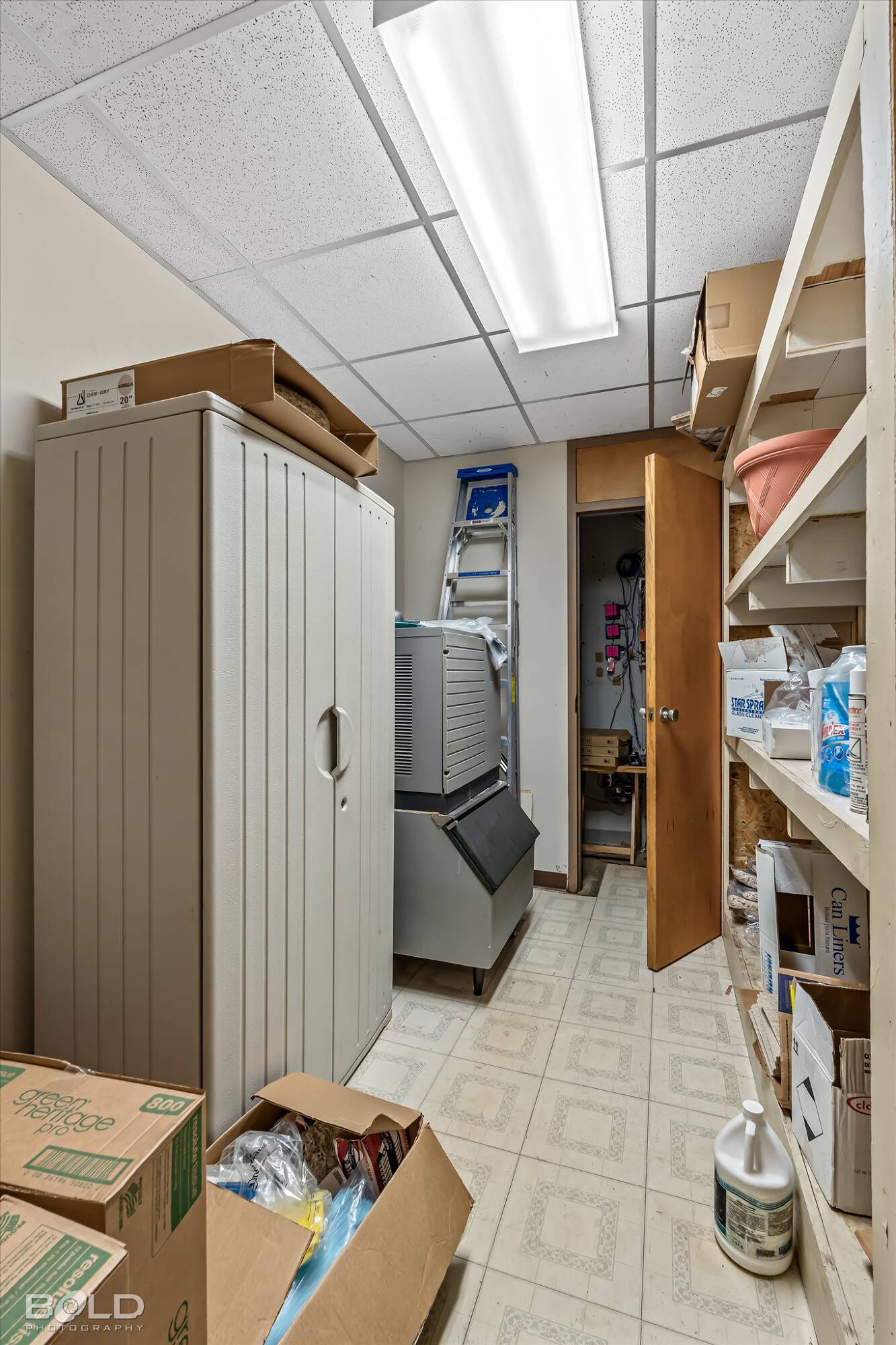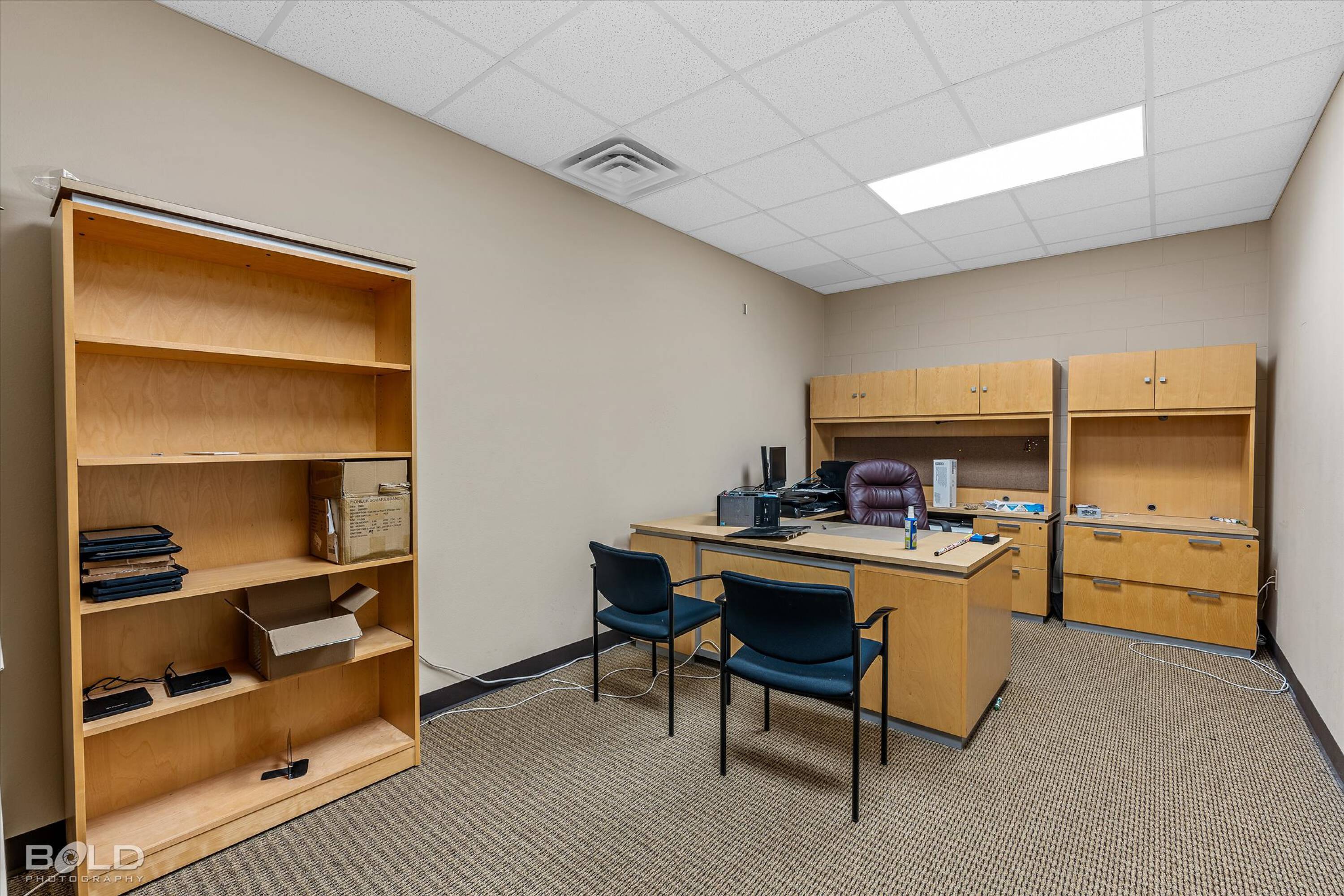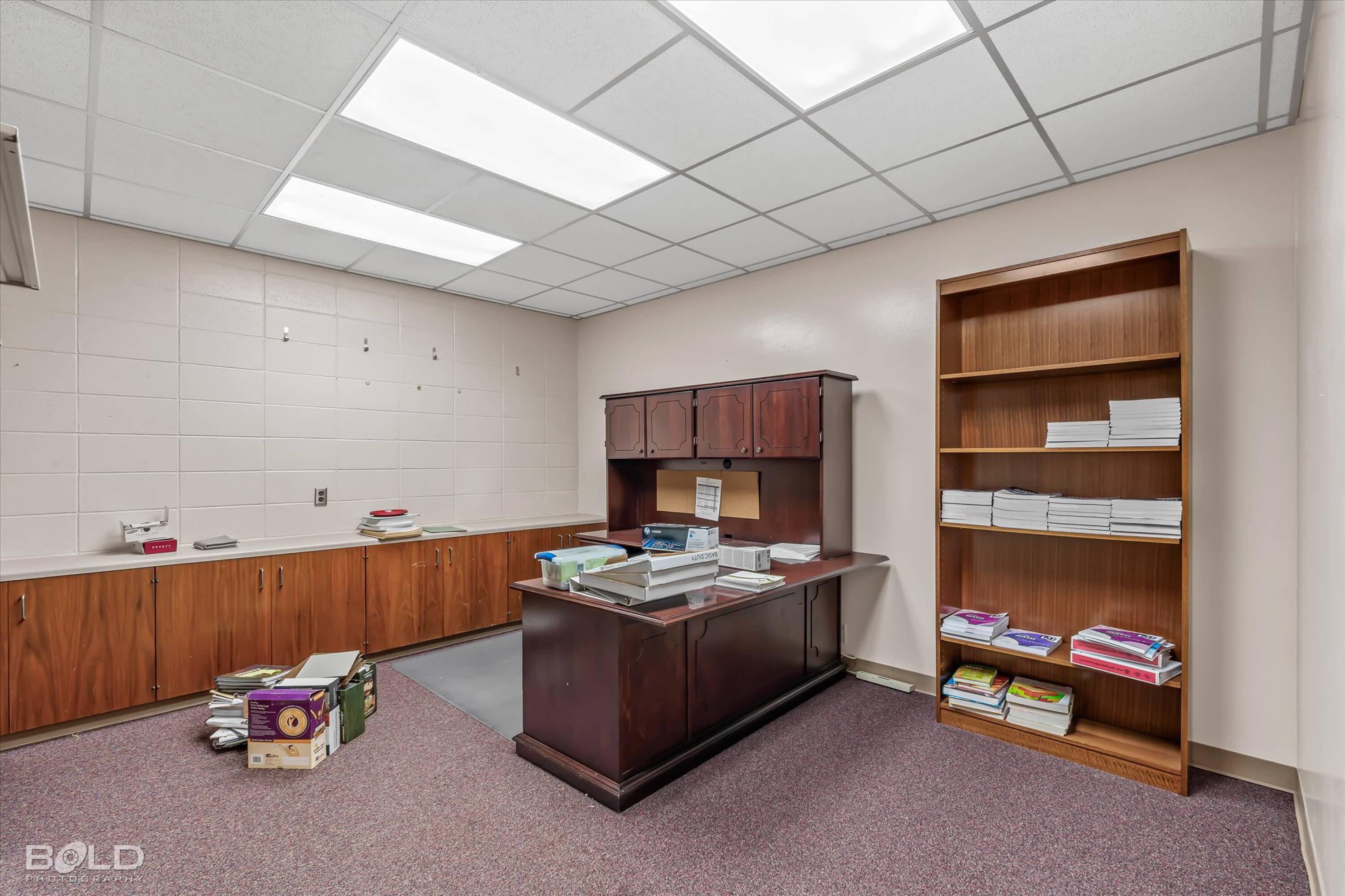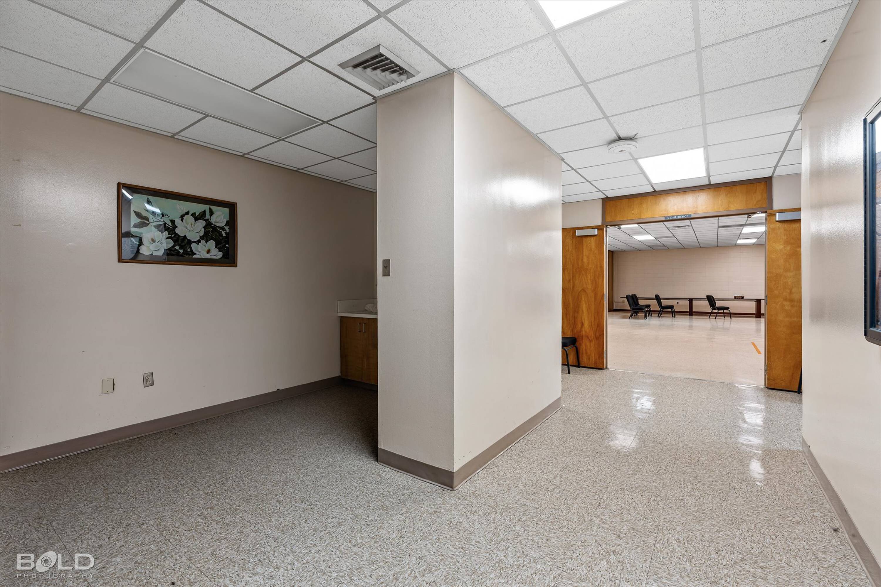 Adaptable commercial space with media center, warehouse, and special services.