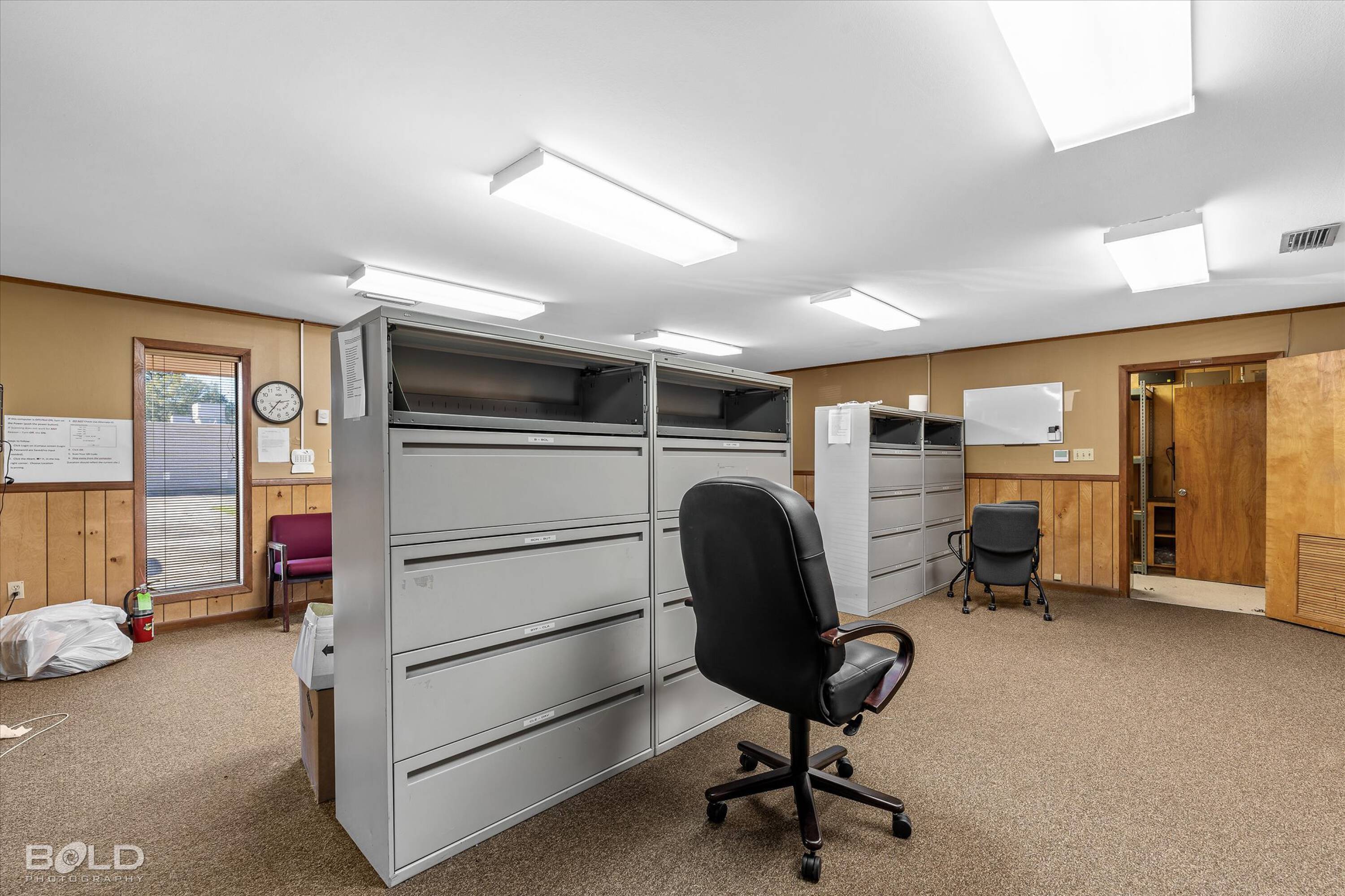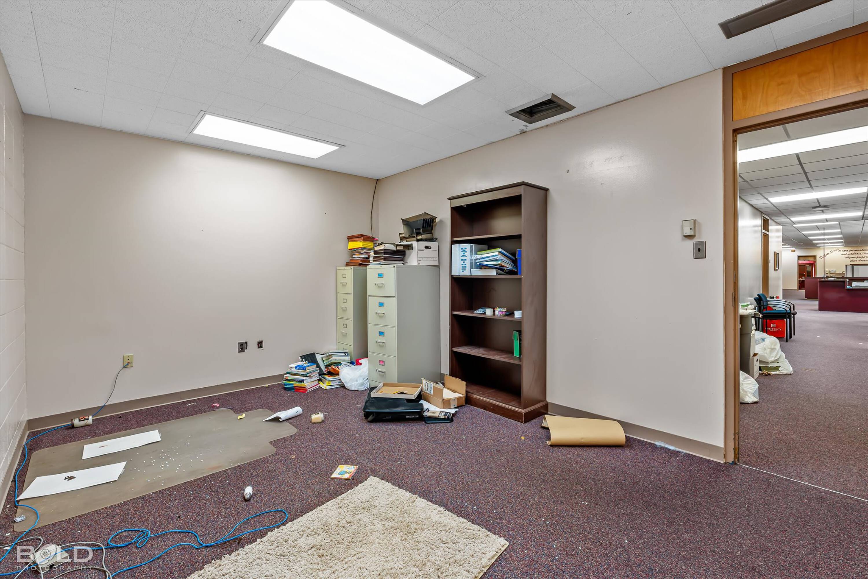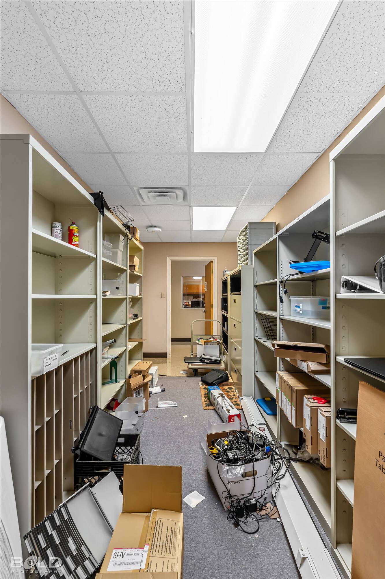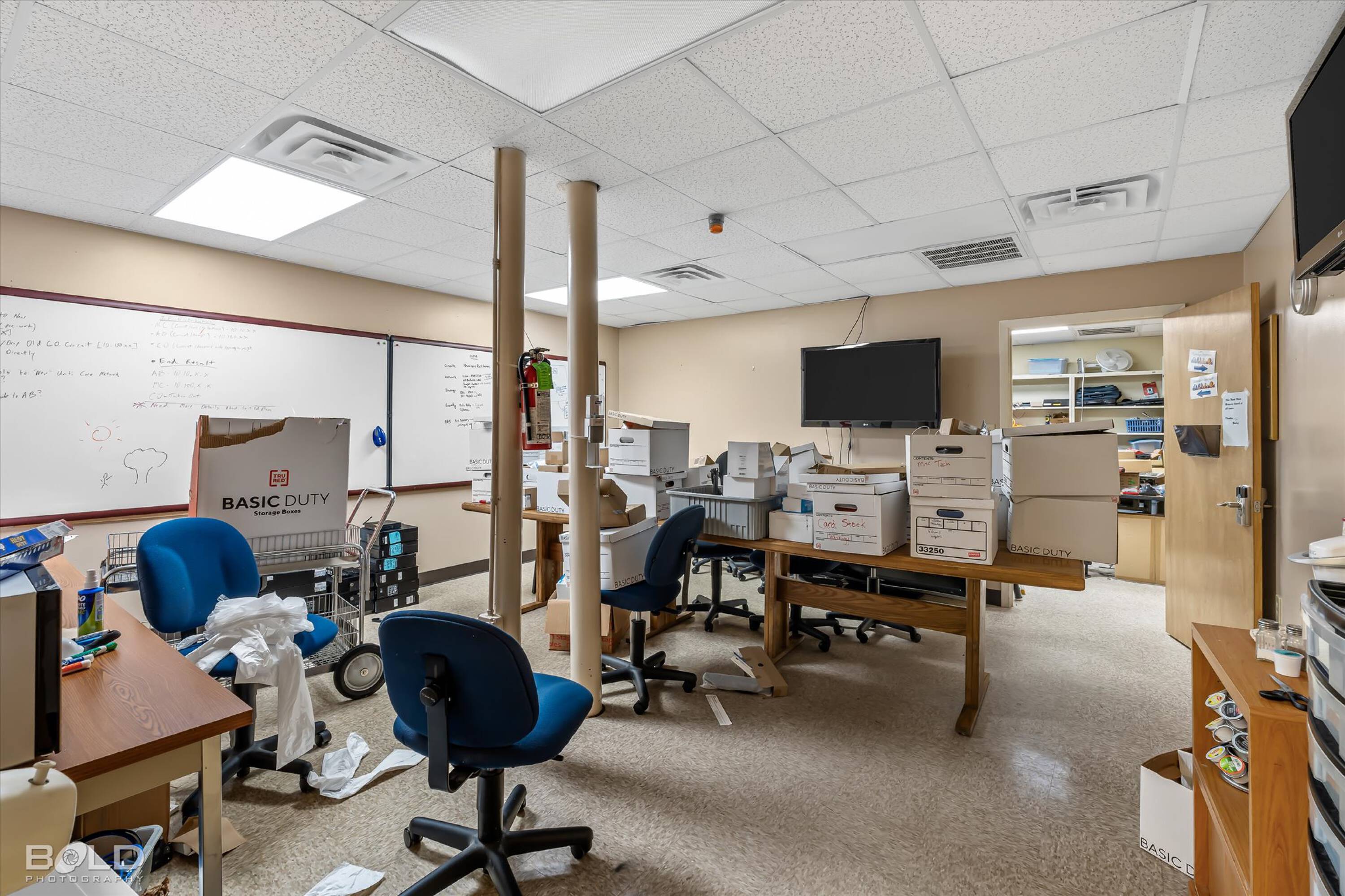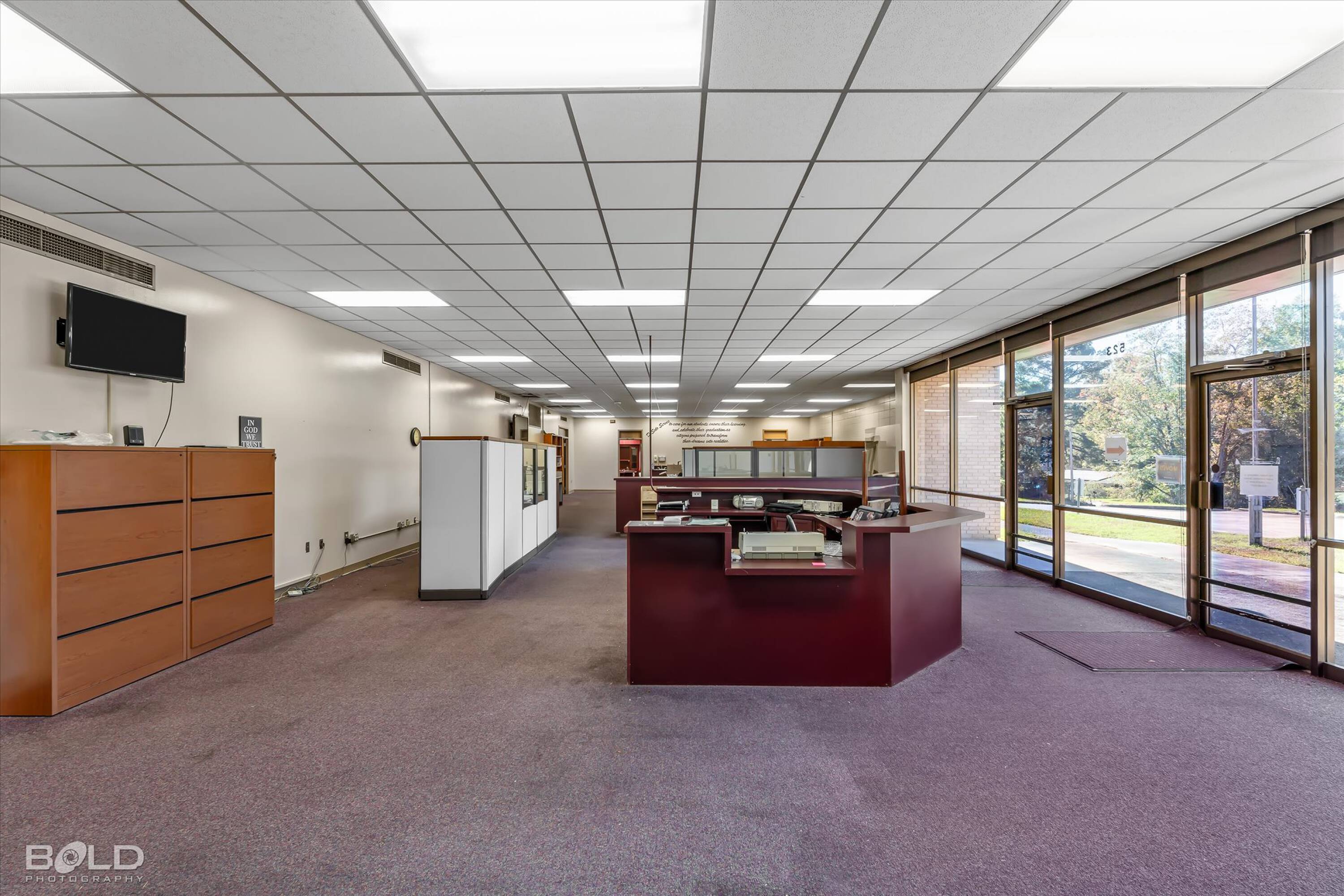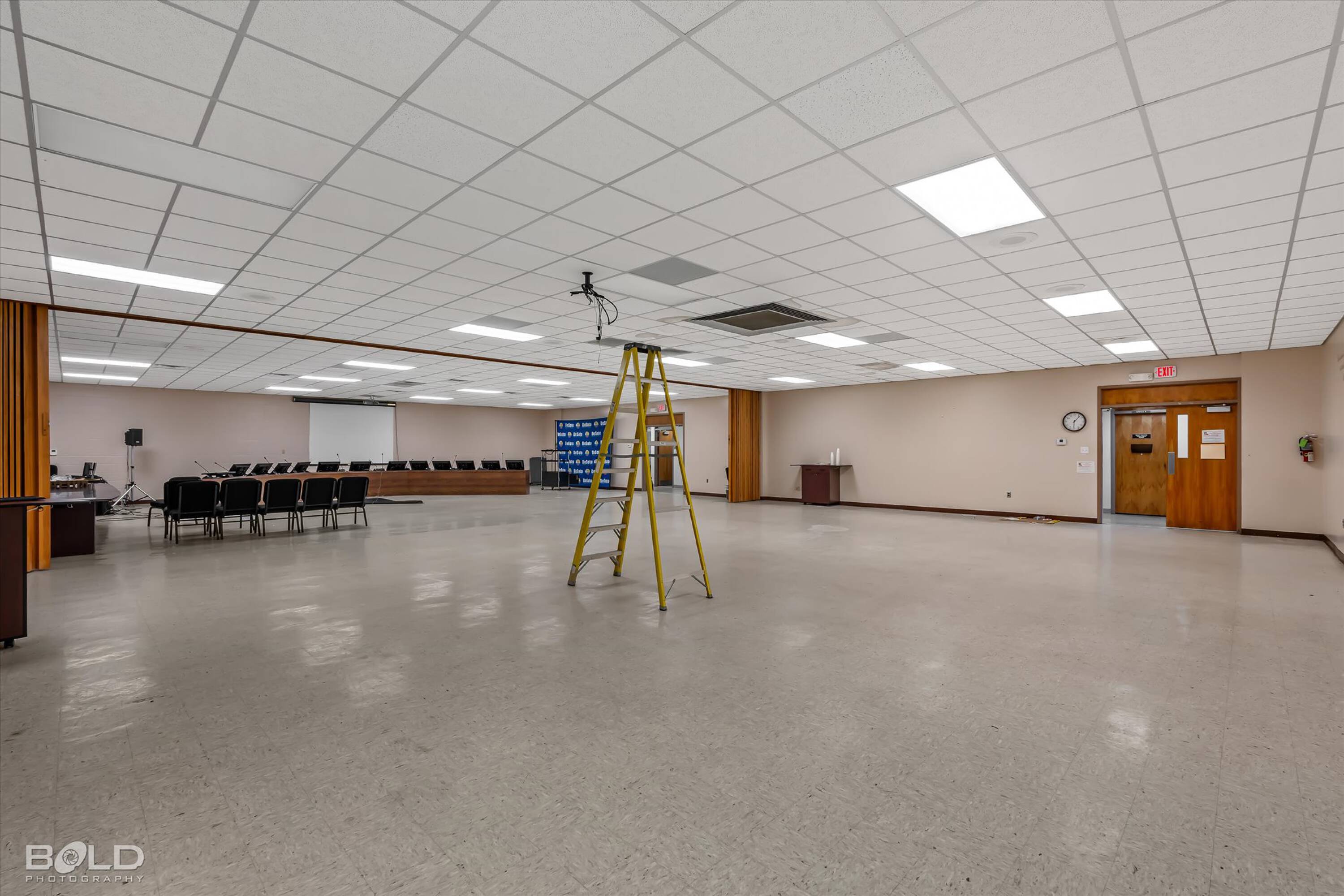 Adaptable commercial space with media center, warehouse, and special services.