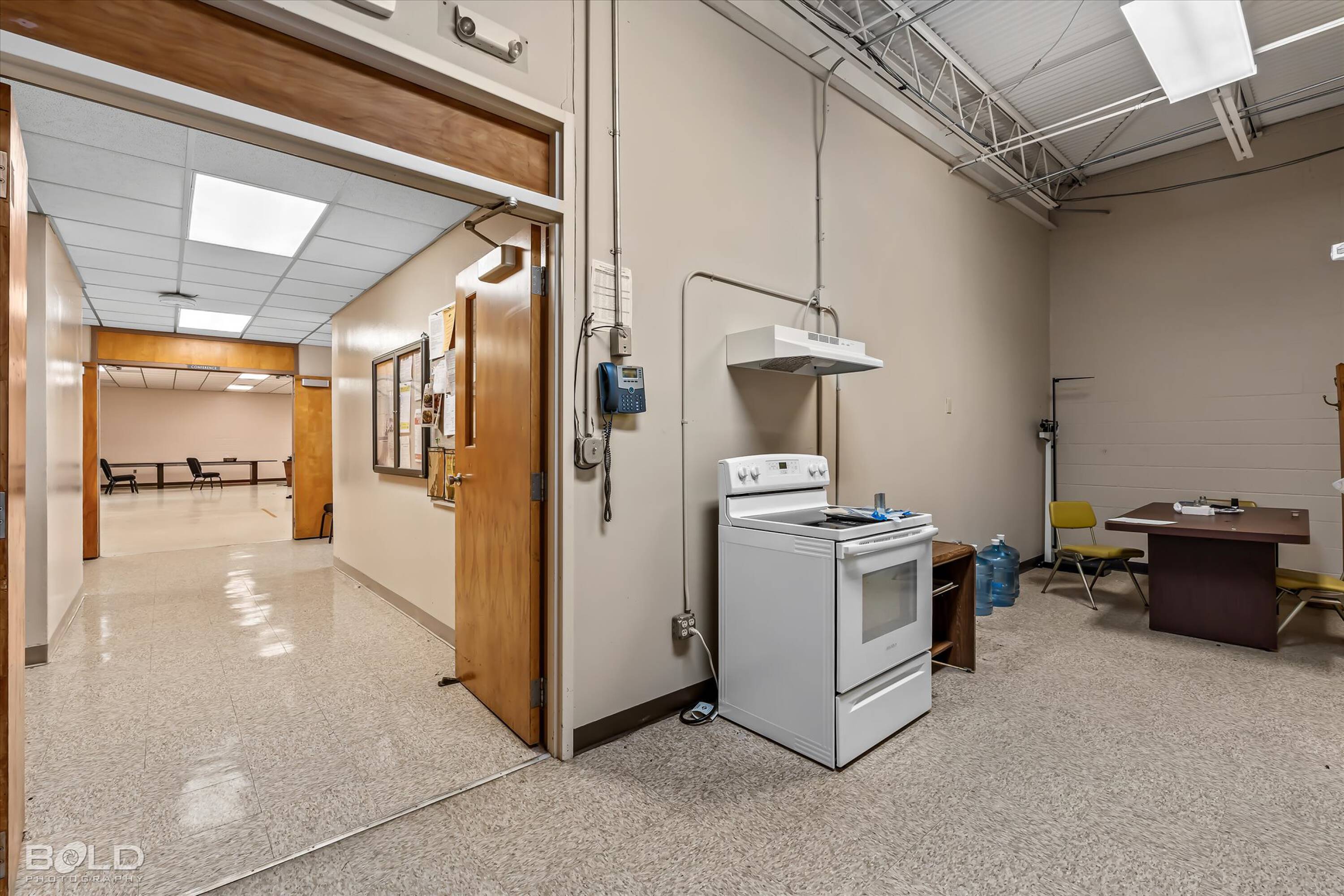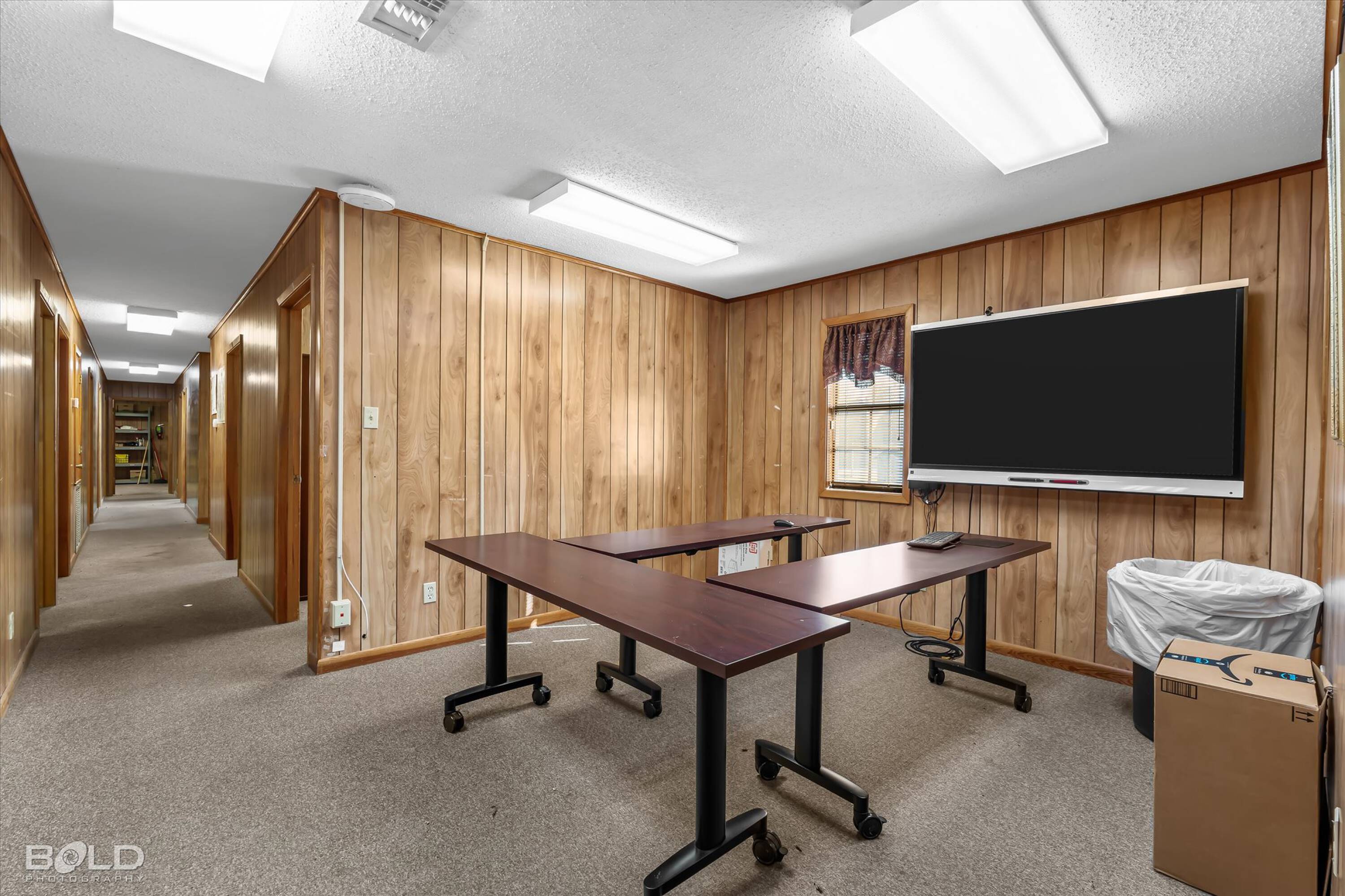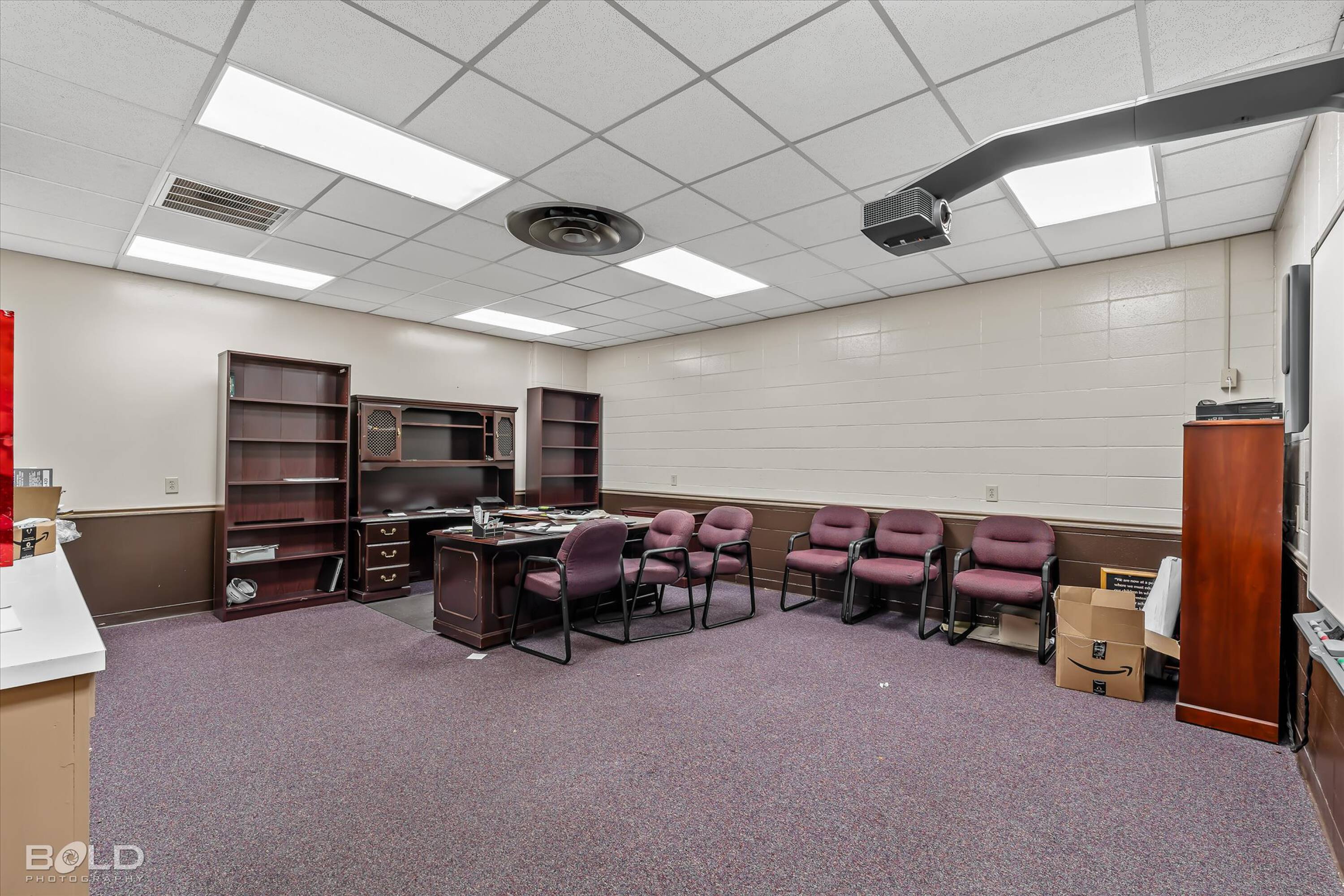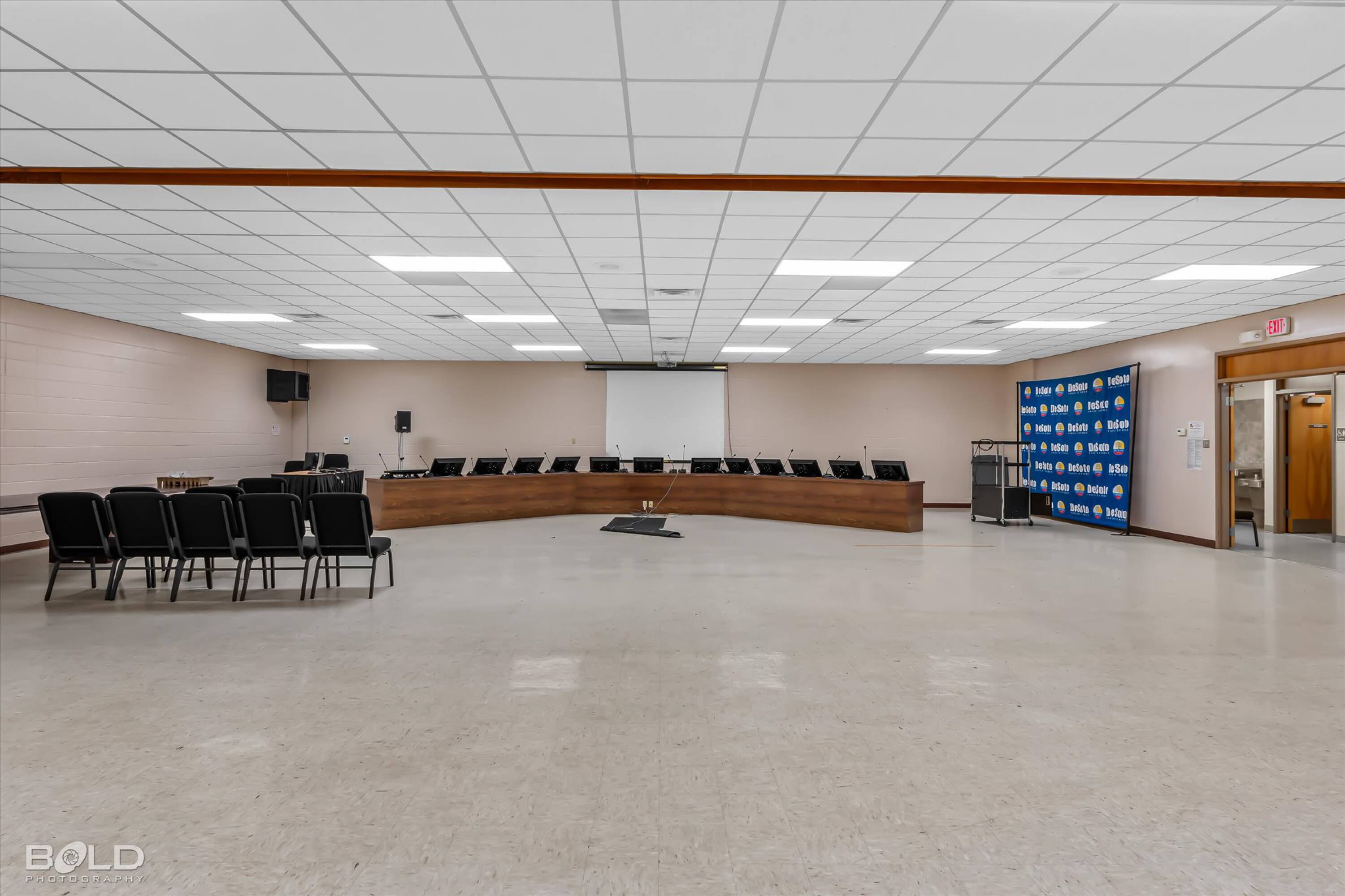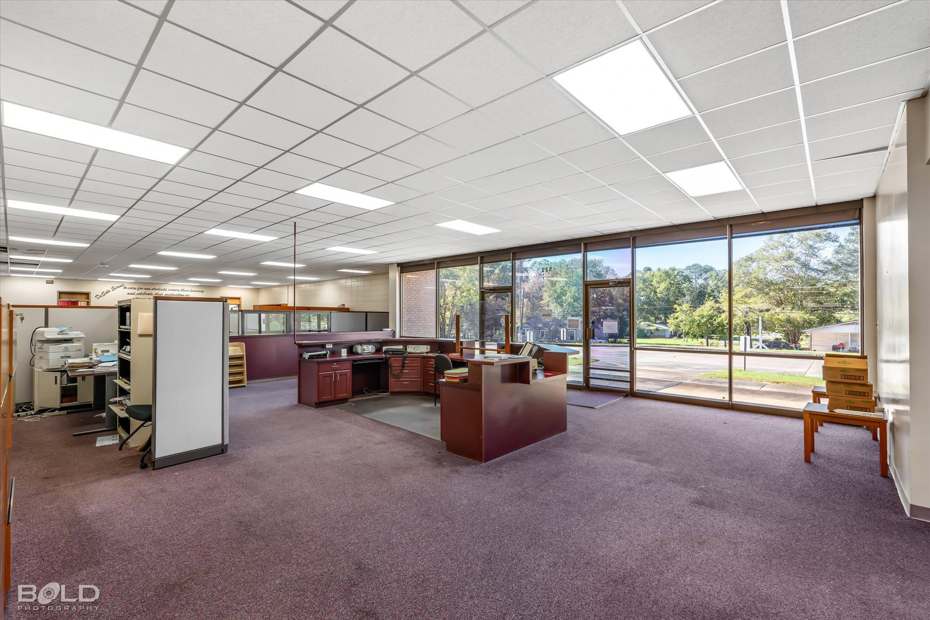 Adaptable commercial space with media center, warehouse, and special services.