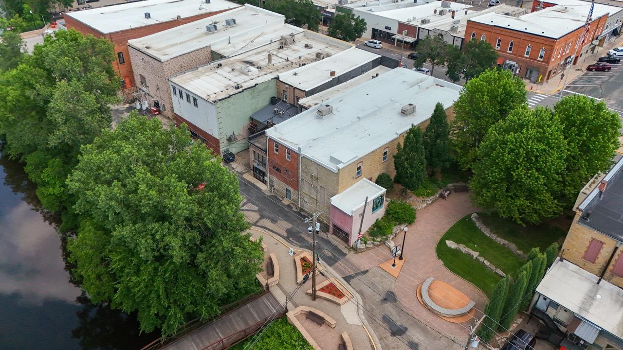 Buildings in historic downtown River Falls with river views.