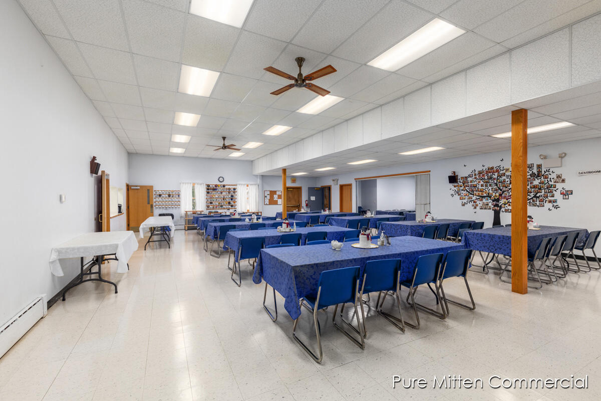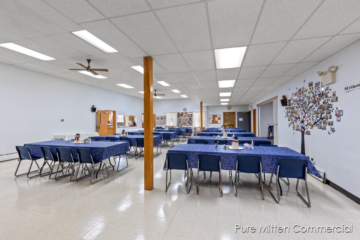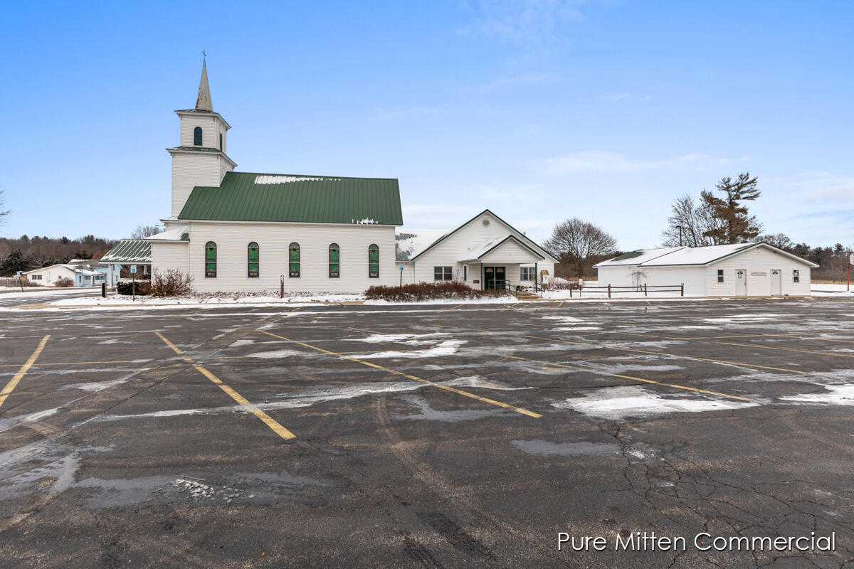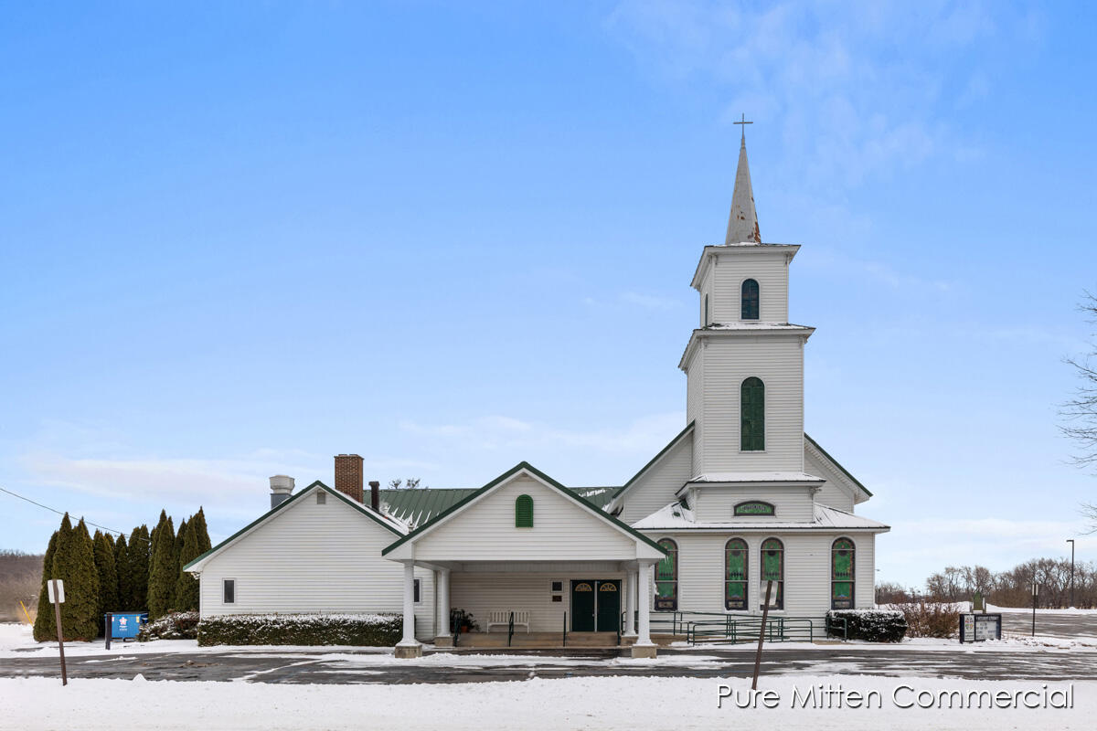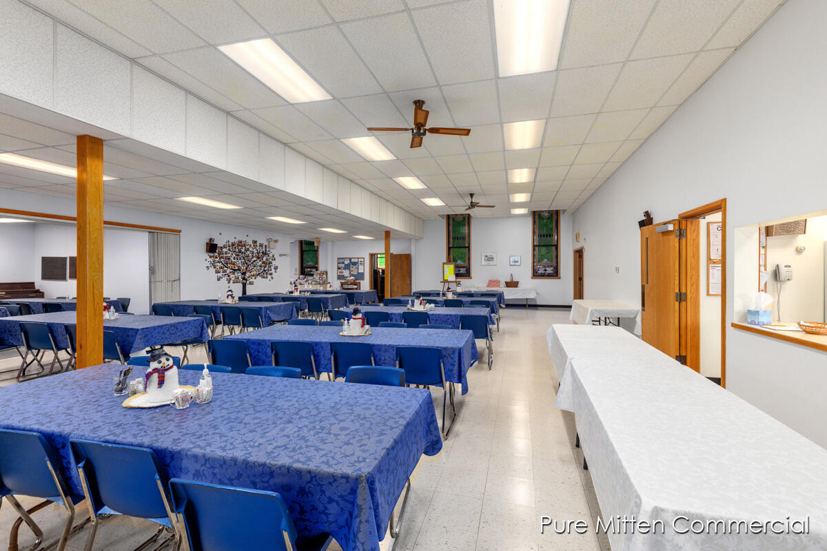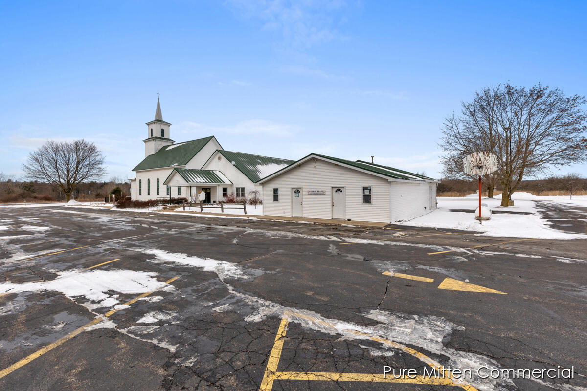 Versatile church property with commercial kitchen and ample parking.