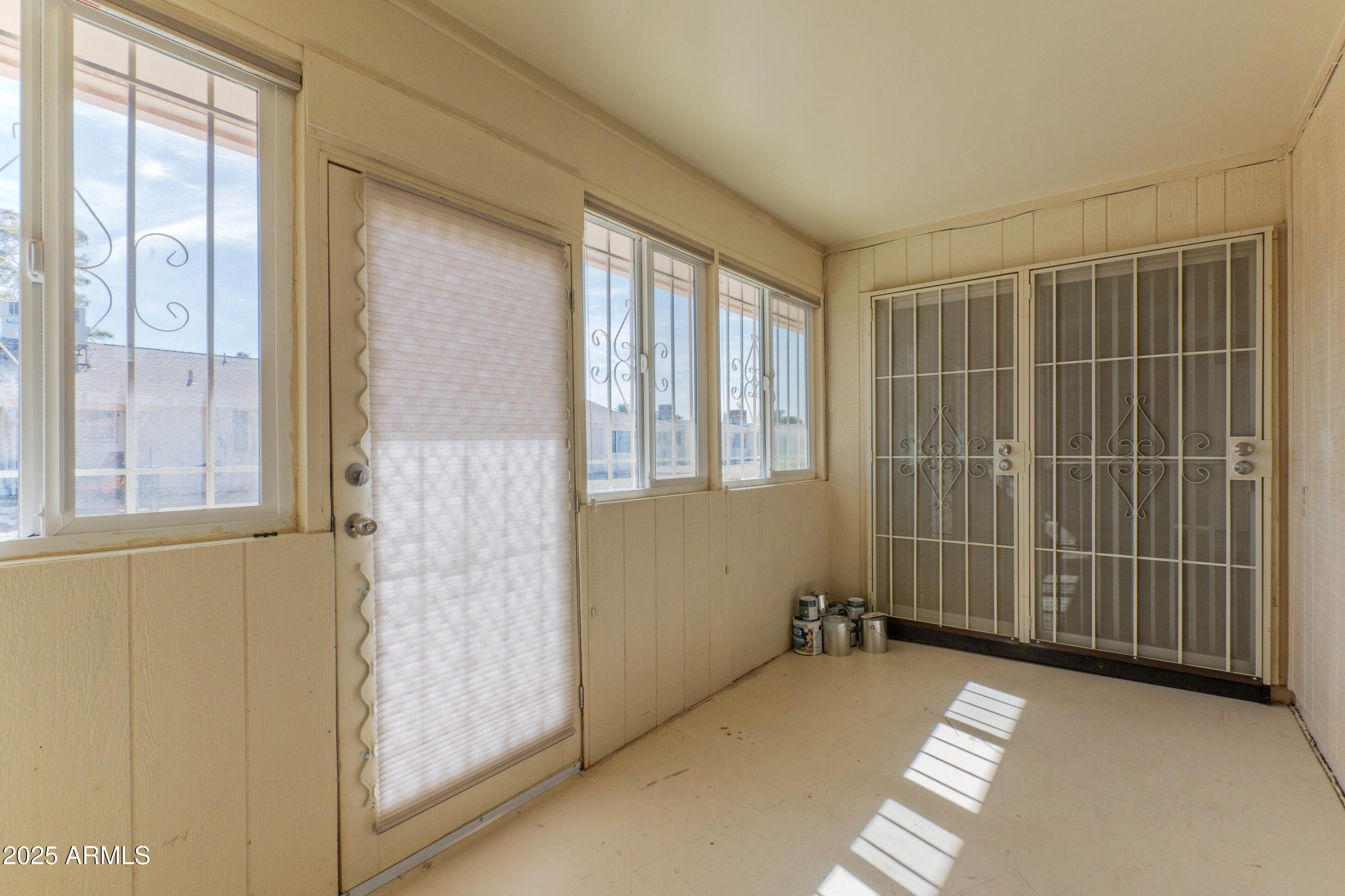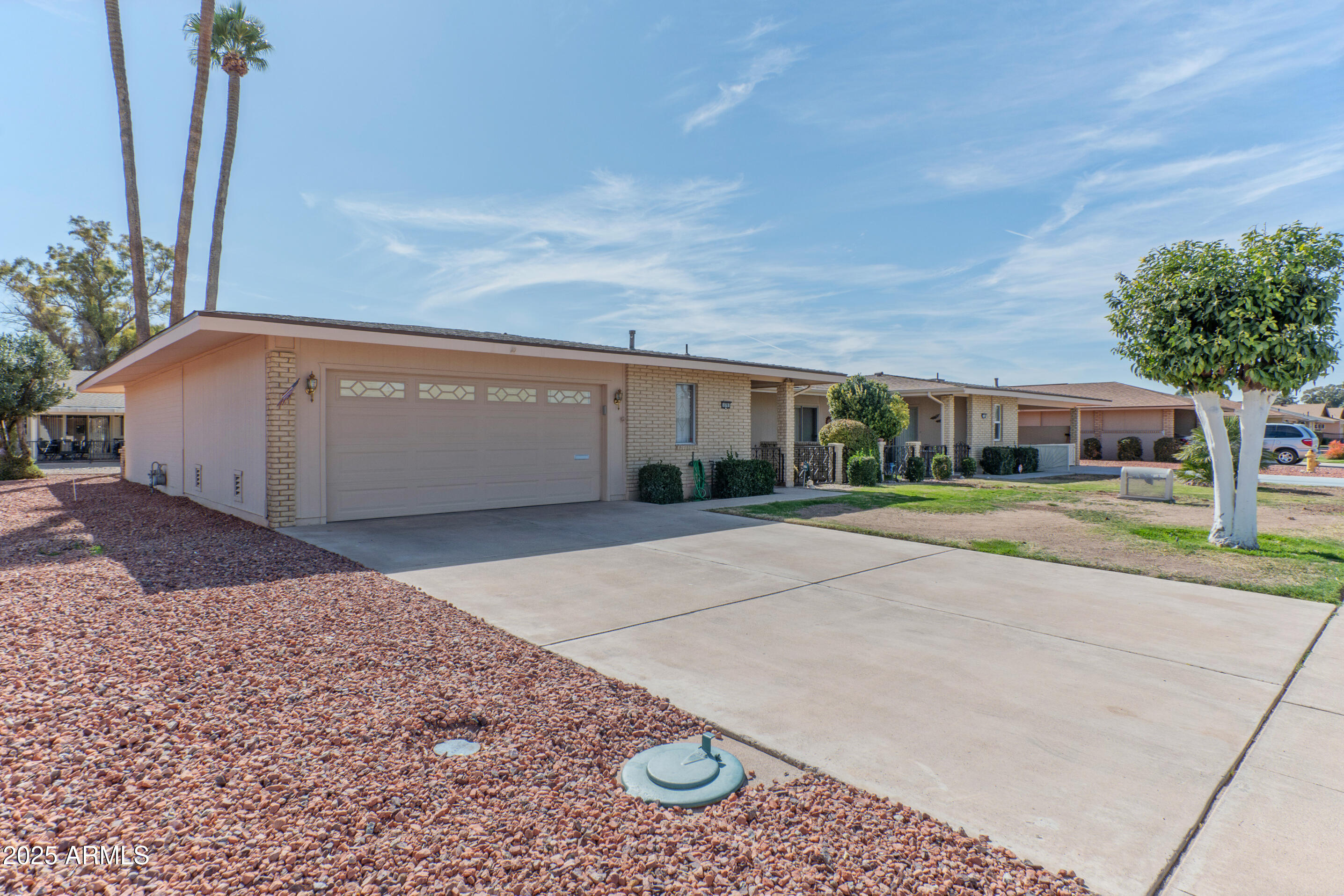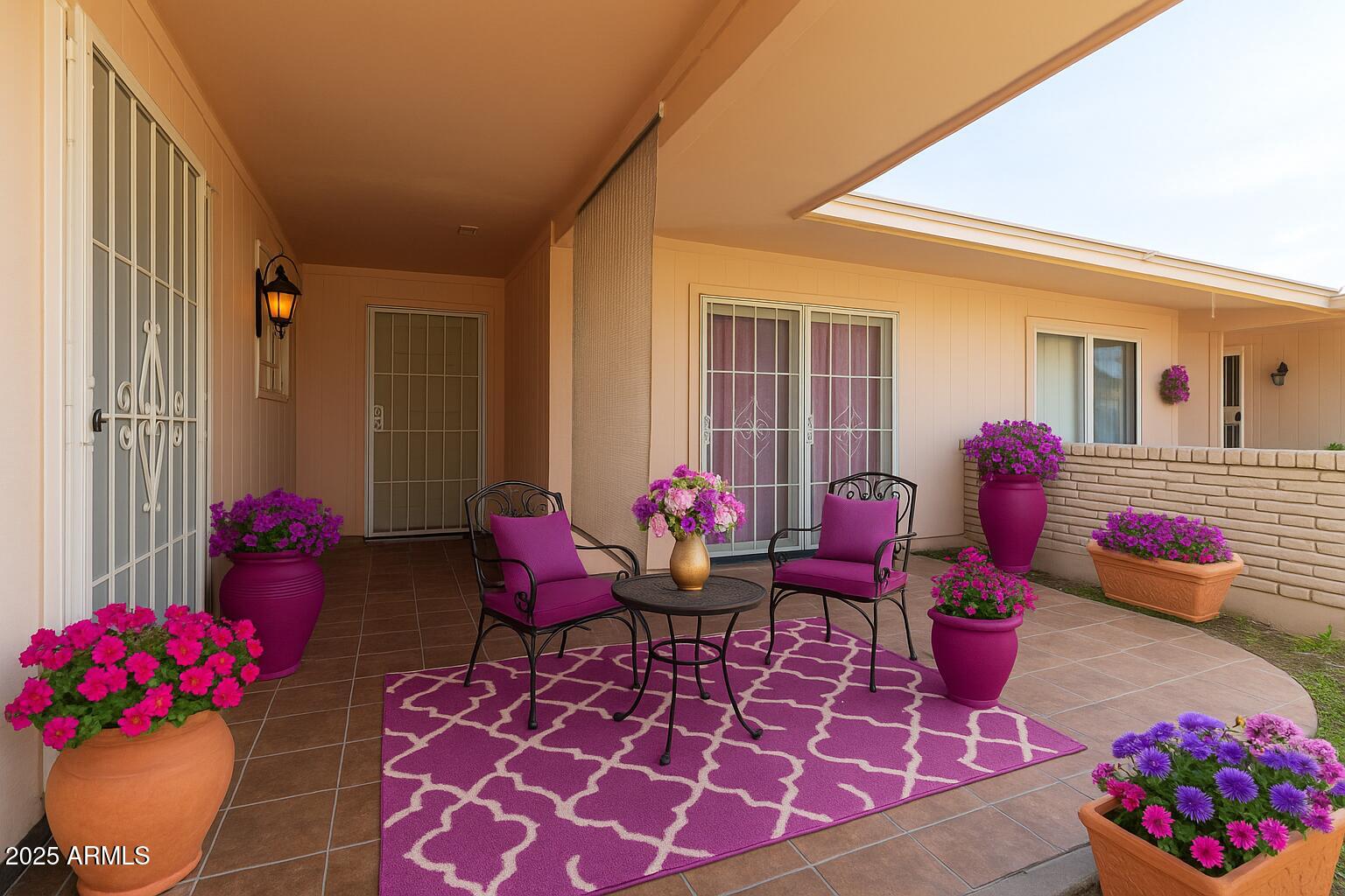This meticulously maintained home features 2 bedrooms and 1.75 baths. Recent updates include new flooring, fresh paint, a modern roof, and an updated water heater. The property includes spacious dining and living areas suitable for entertaining. The kitchen is well-appointed with ample cabinetry, generous counter space, and built-in appliances. The primary bedroom includes a private ensuite. Natural light enters through four sliding glass doors that connect every room to outdoor spaces. The property features private front and back patios, and a backyard with a screened-in area. Additional features include a two-car garage and an interior laundry area. The property is situated near Olive, Peoria, Grand, Thunderbird, and Bell, and is a 10-minute drive from Glendale Stadium. Fairway Recreation Centers, Sun Bowl, and Sun City golf courses are also nearby. The property size is 1471 square feet.