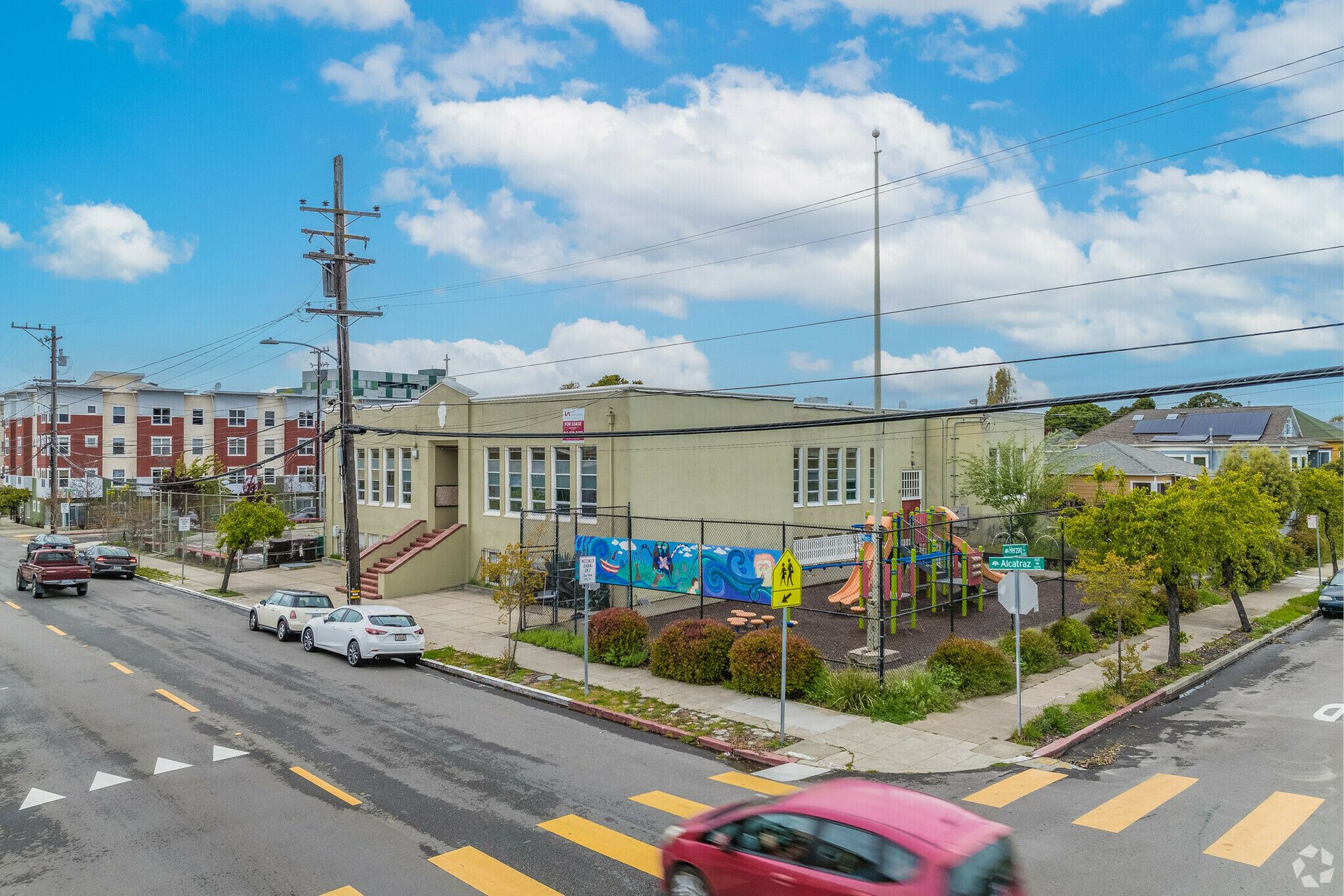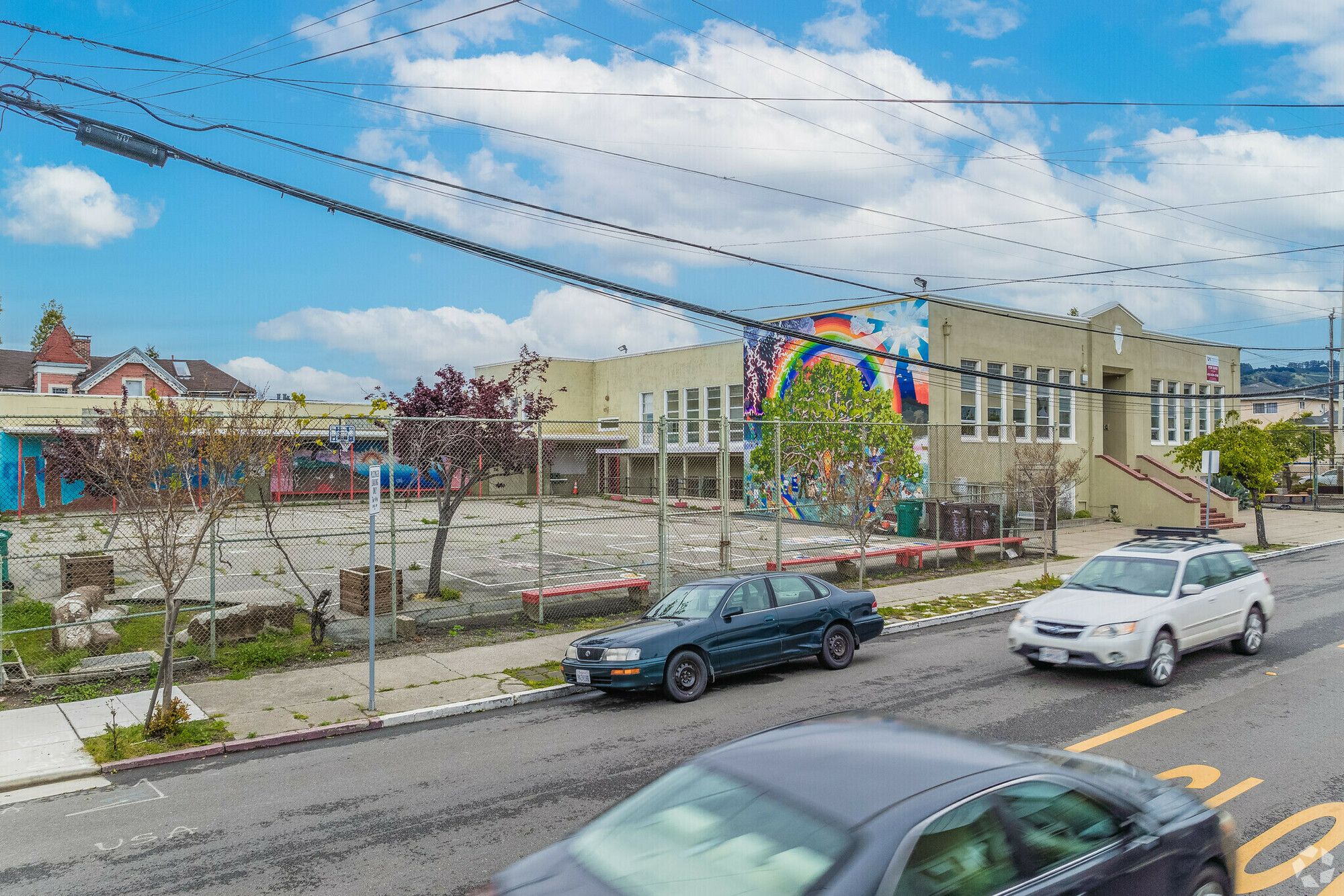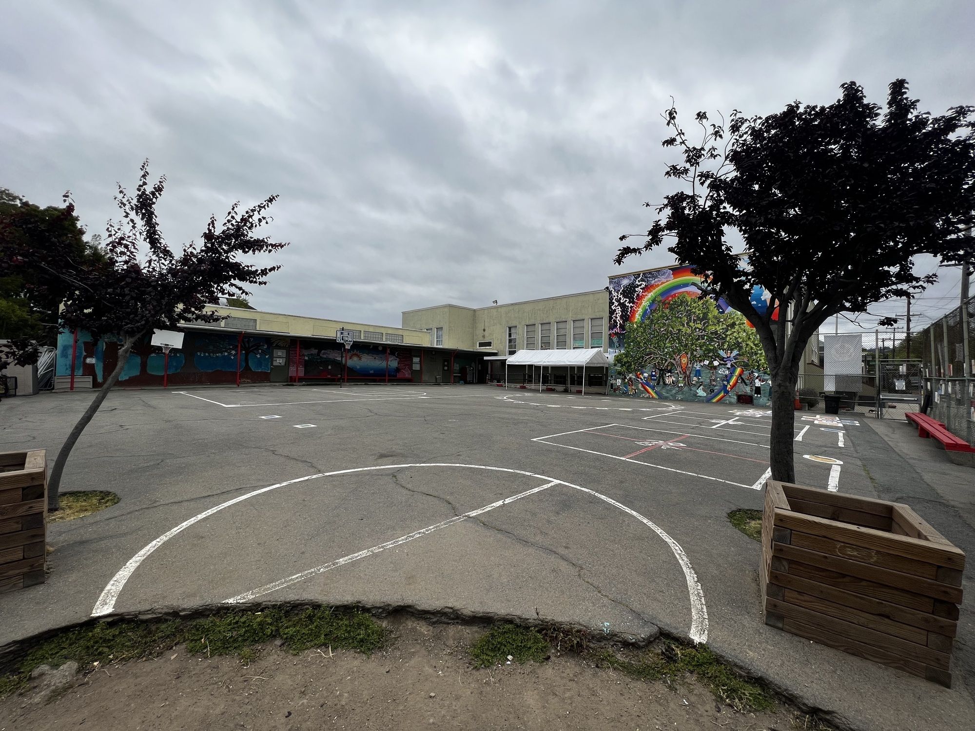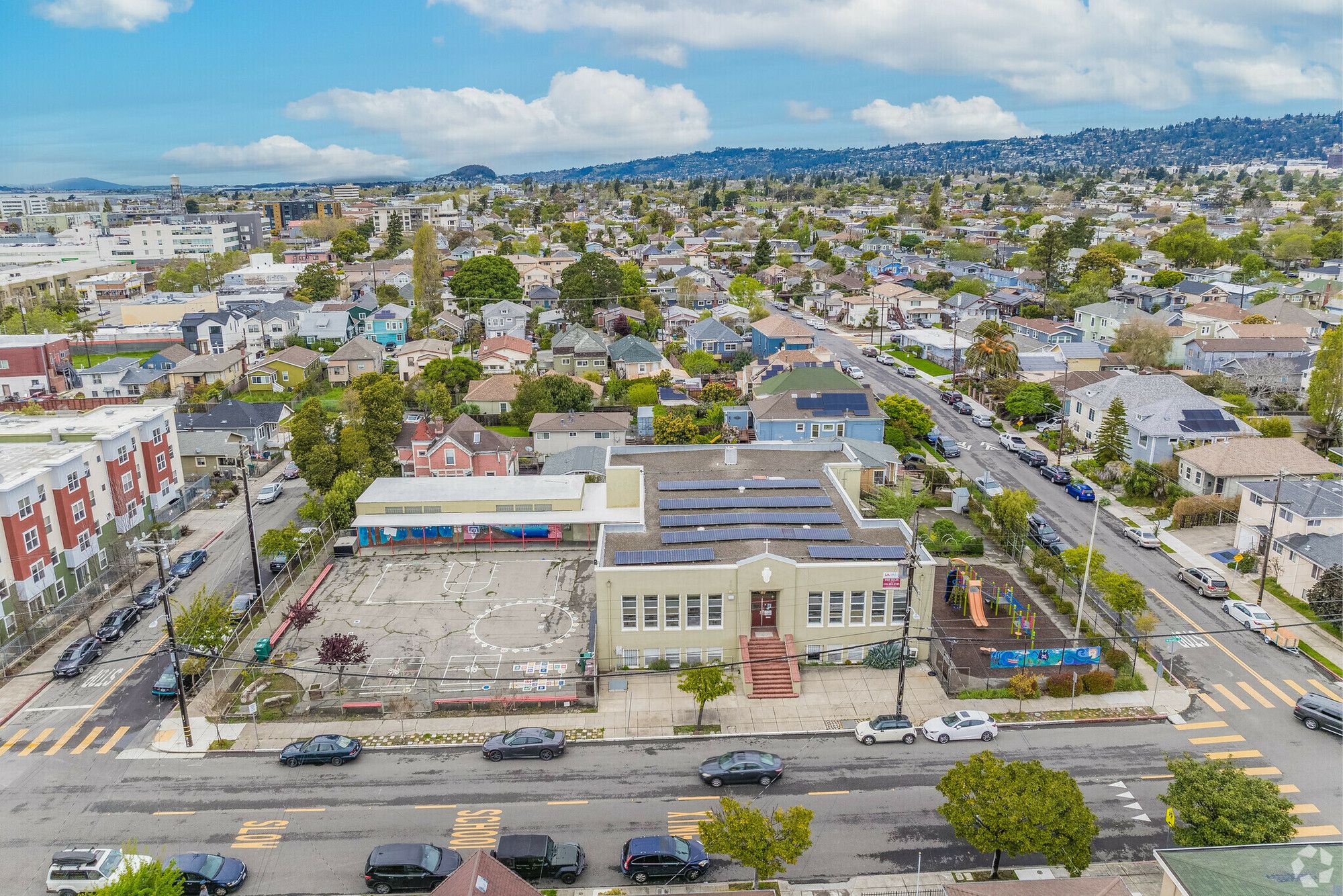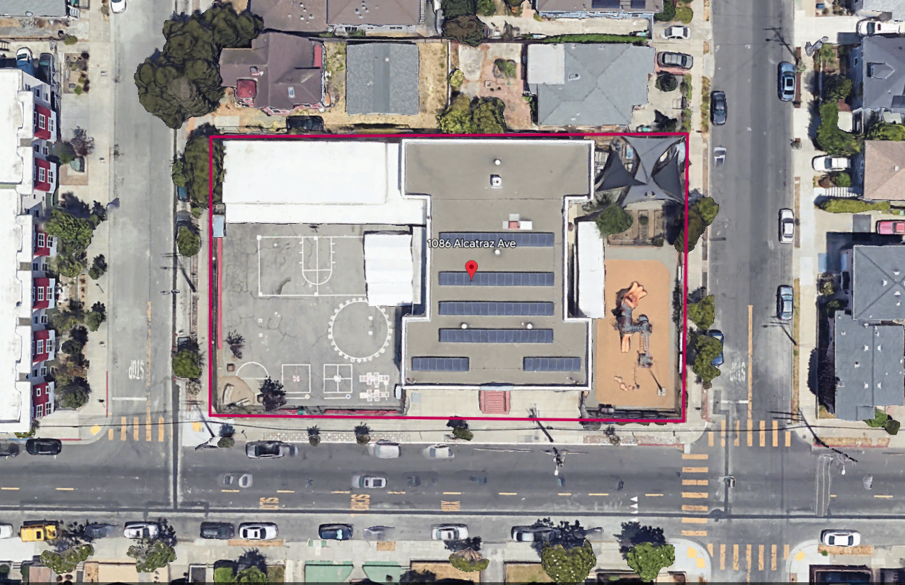 North Oakland school building with classrooms and outdoor play areas.