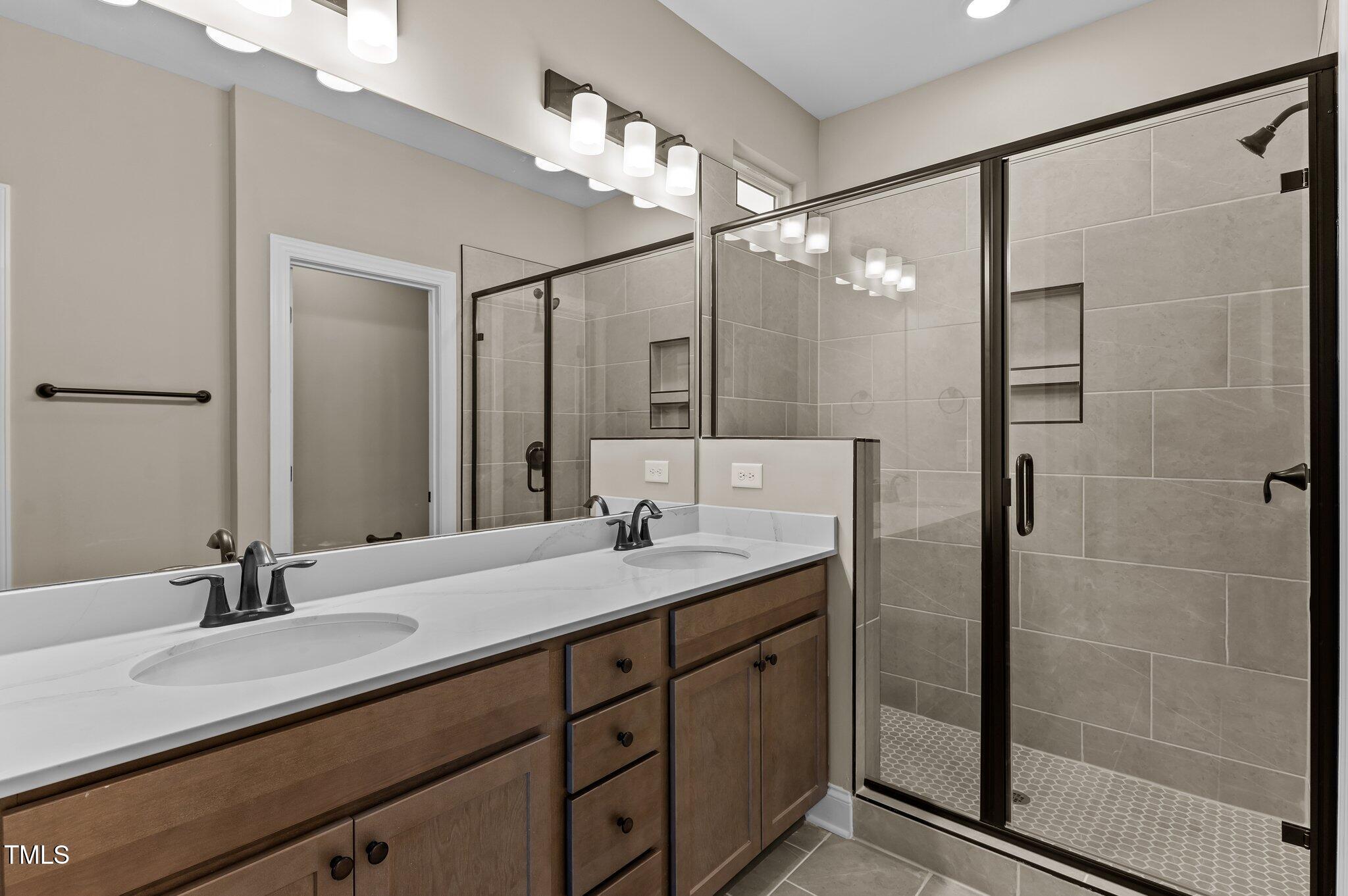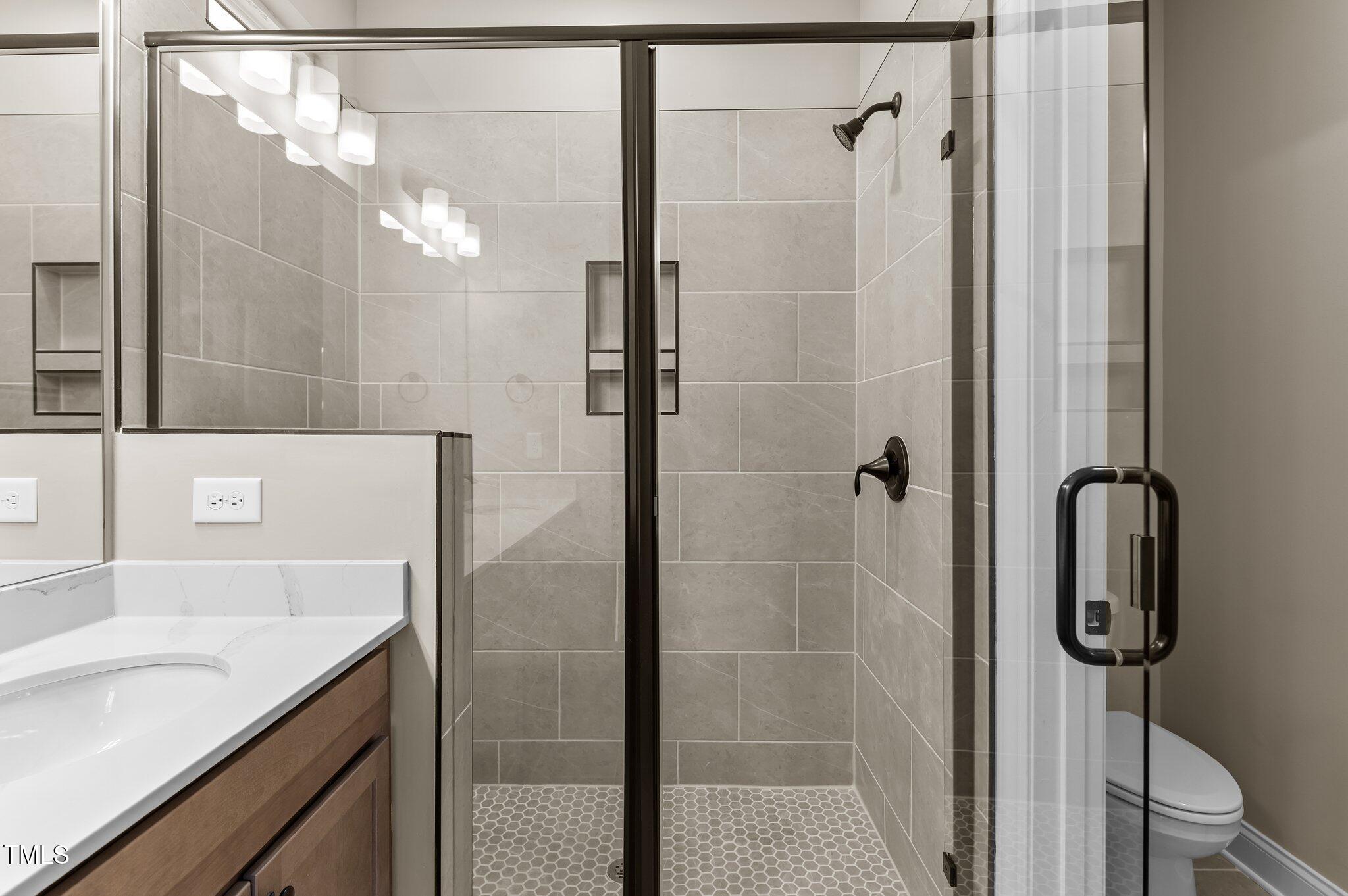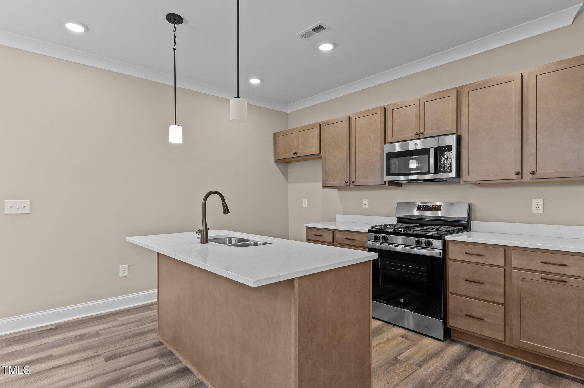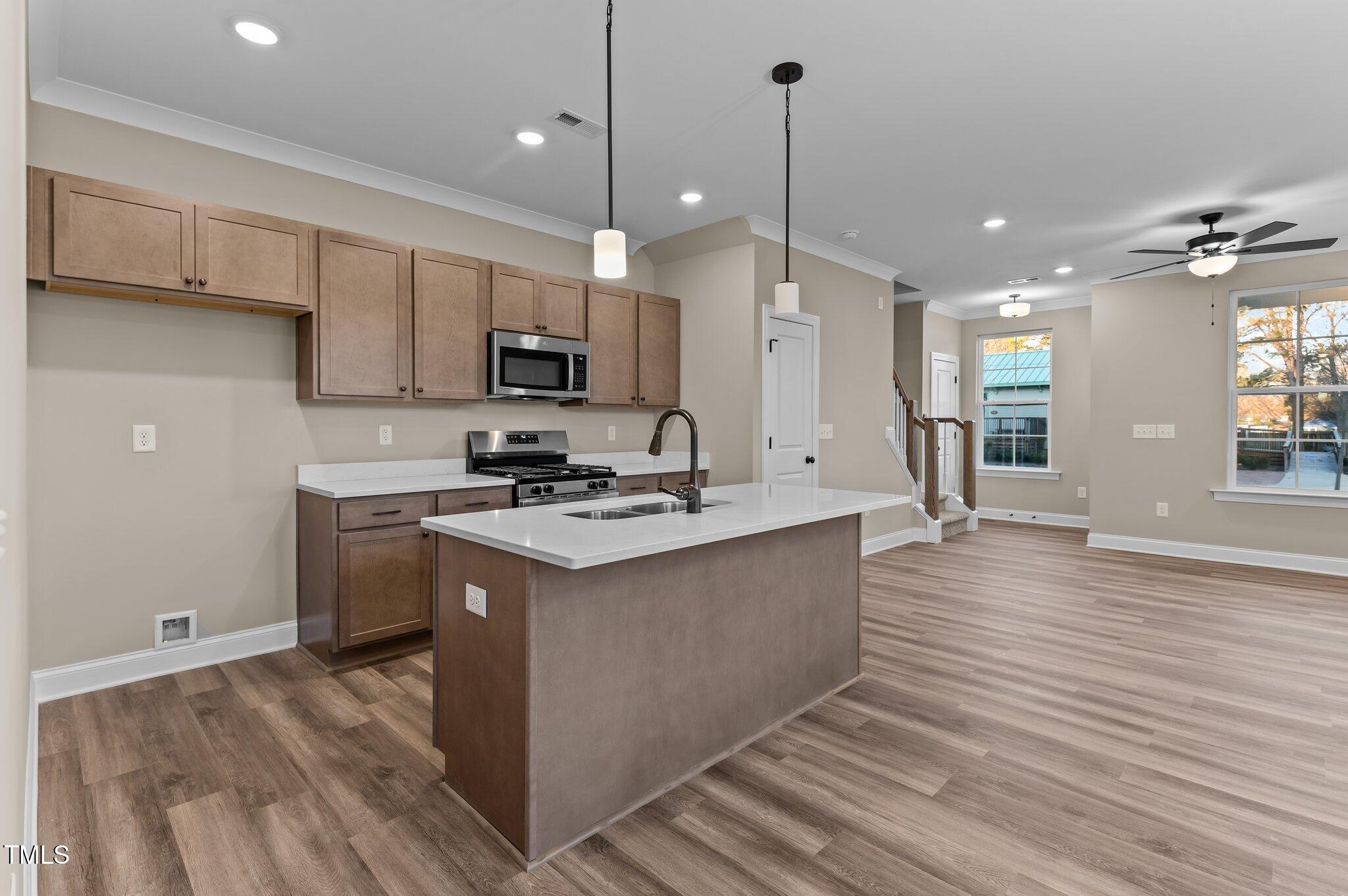 This custom-built townhome, named The Pearl, is located in the heart of downtown Garner, North Carolina, offering convenient access to local shopping, dining, and parks. The property features upgraded LVP flooring throughout the main living areas. The kitchen is equipped with "Carrara Roma" quartz countertops, custom "Venetian Bronze" stained cabinetry with oil-rubbed bronze hardware, a large center island with a single bowl stainless steel sink and barstool seating, stainless steel appliances including a smooth top range, microwave, and dishwasher, and a walk-in pantry. The kitchen opens to a spacious dining area and an open-concept family room with a double window. The second floor includes a large primary suite with a deluxe bath featuring tile flooring, a dual vanity with a "Calacatta" quartz top, a 12x24 tile surround shower, a linen closet, and a walk-in closet. There are also secondary bedrooms and a convenient laundry area. The property includes a rear entry 1-car garage and a storage room. The property size is 1693 square feet.