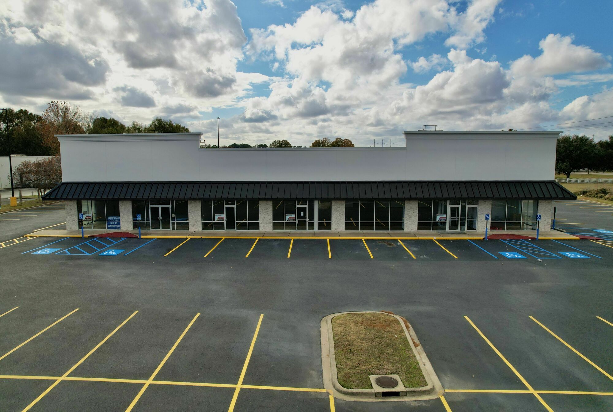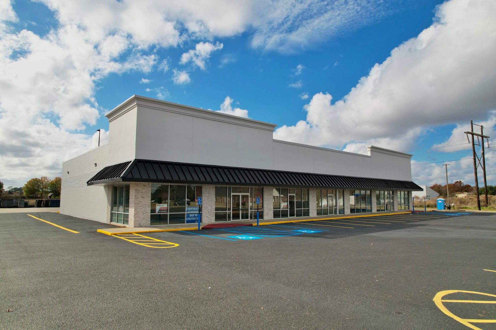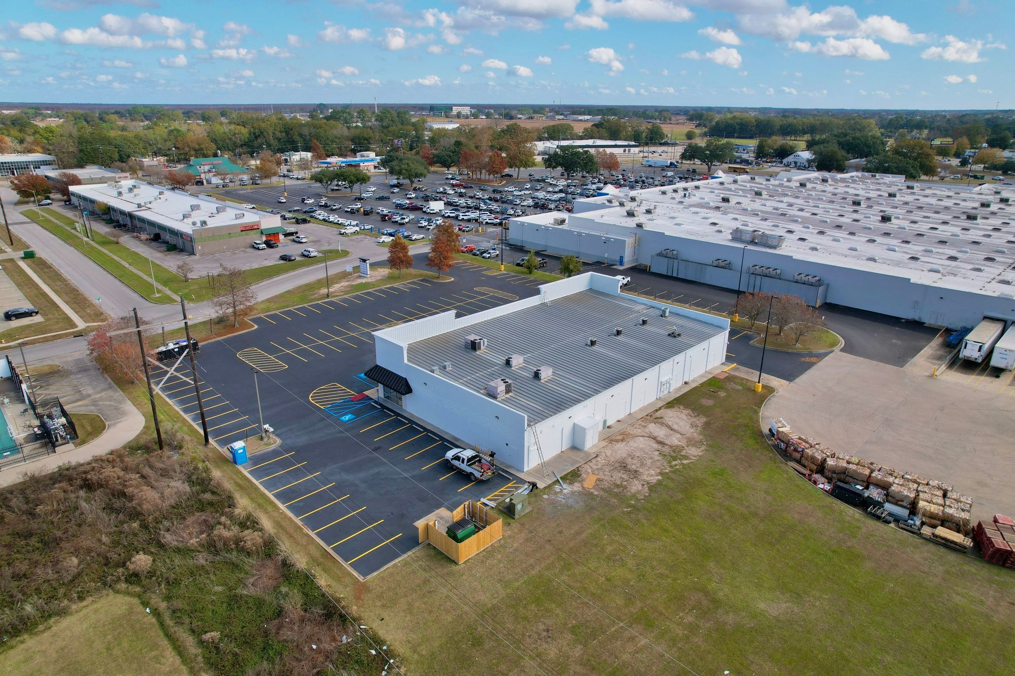 Retail center undergoing renovations, adjacent to high-traffic Walmart Supercenter.
