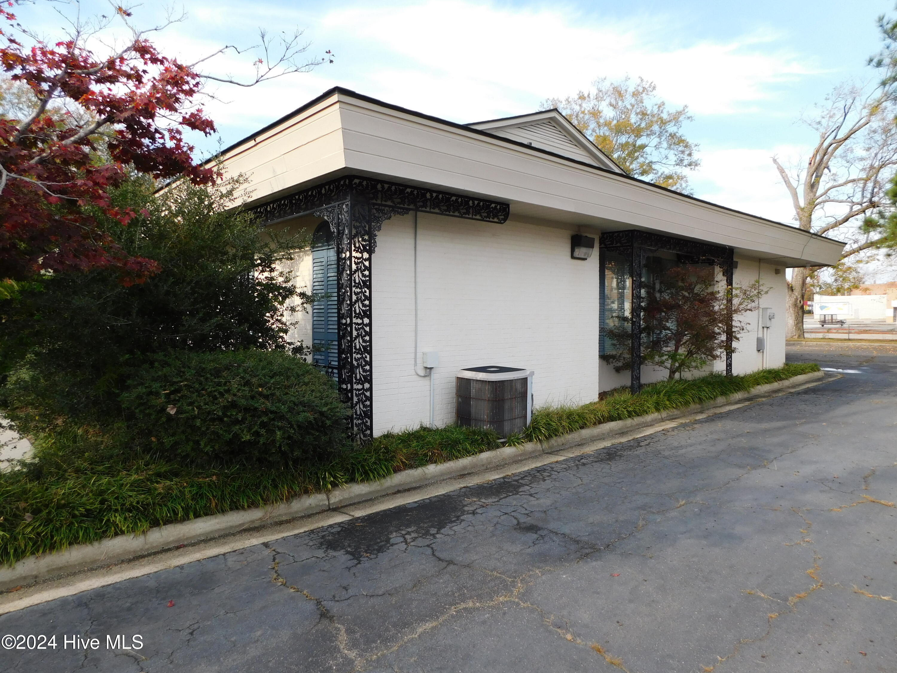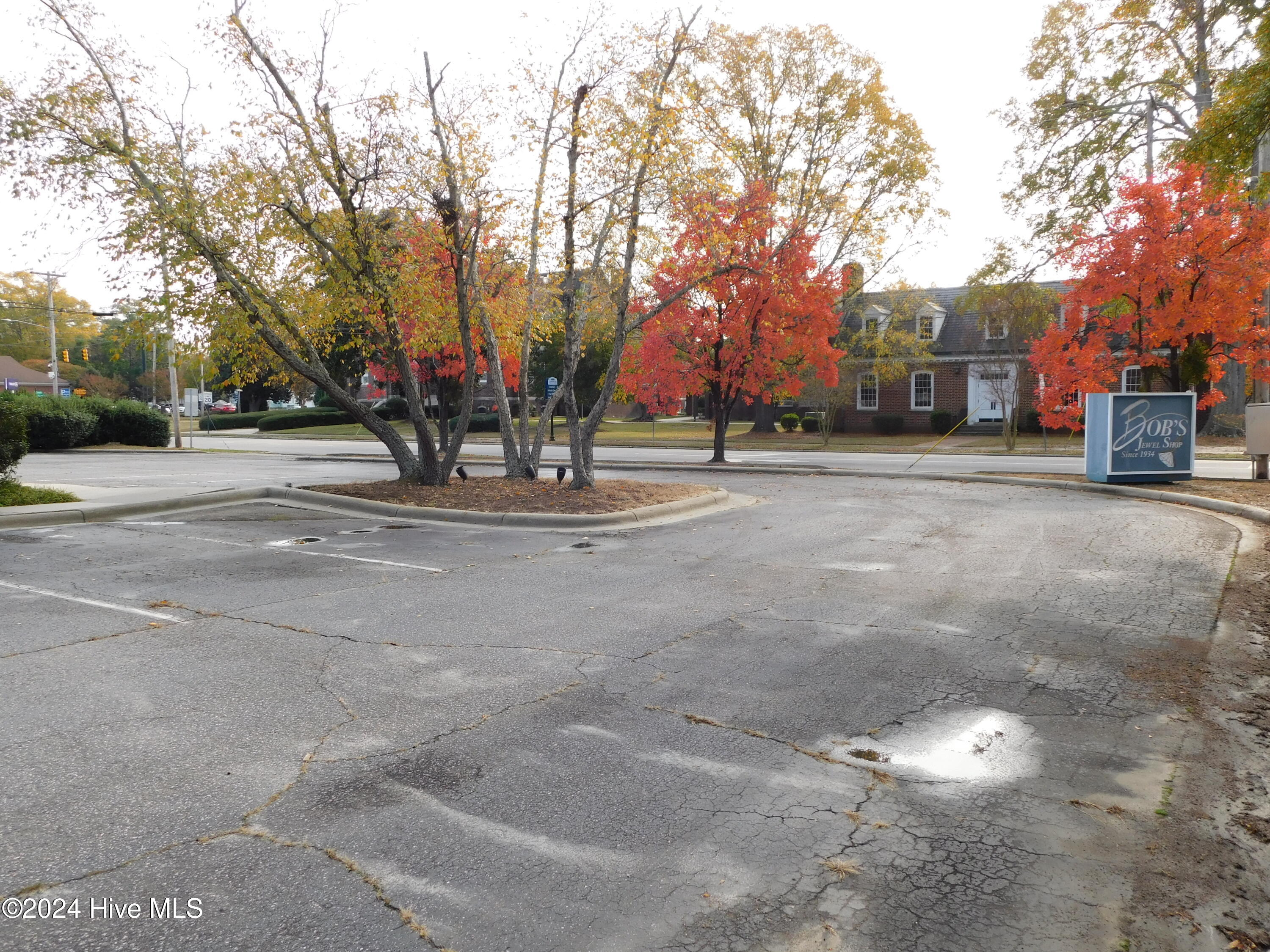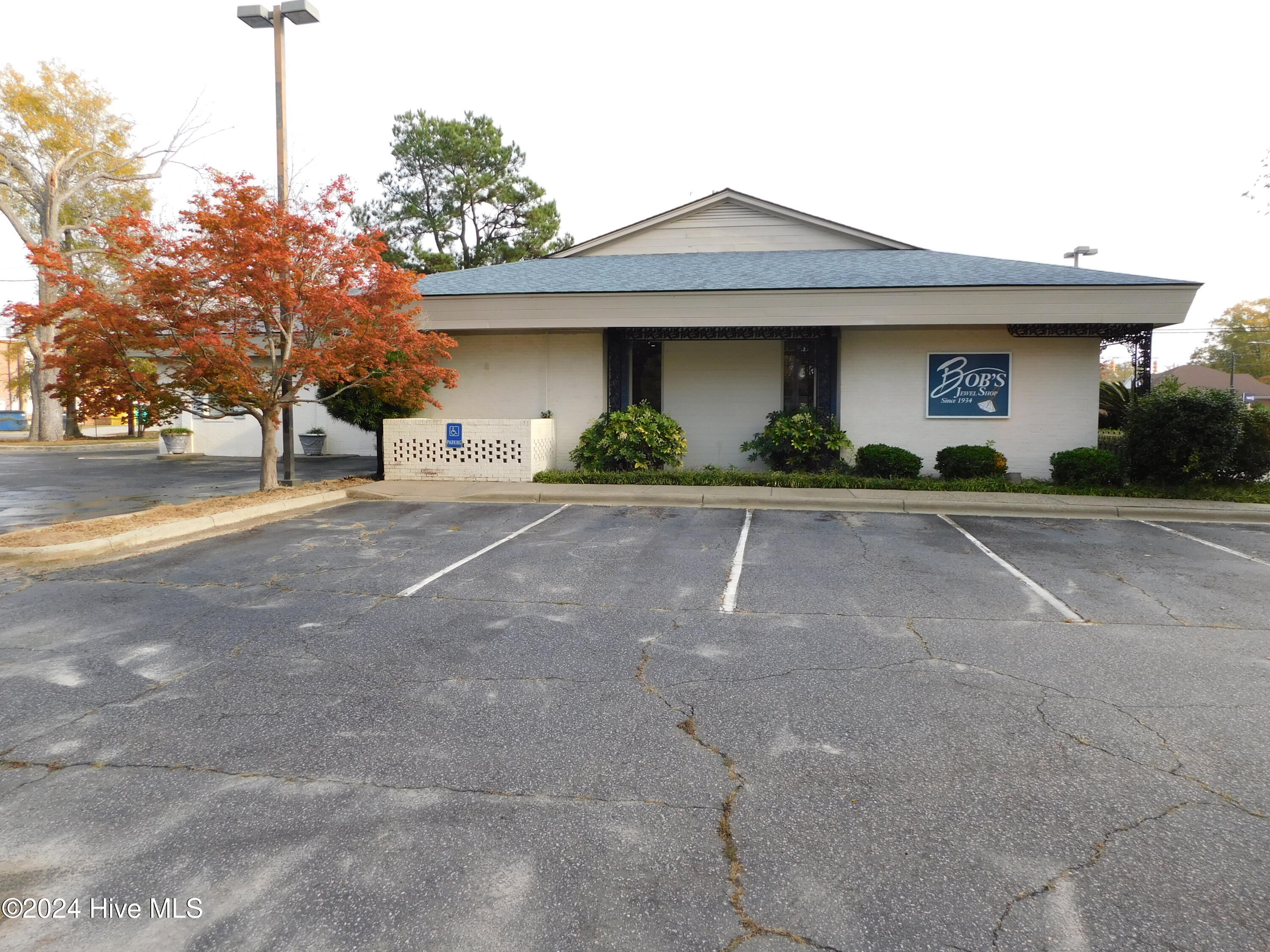 High-visibility corner lot with showroom, offices, and ample parking.