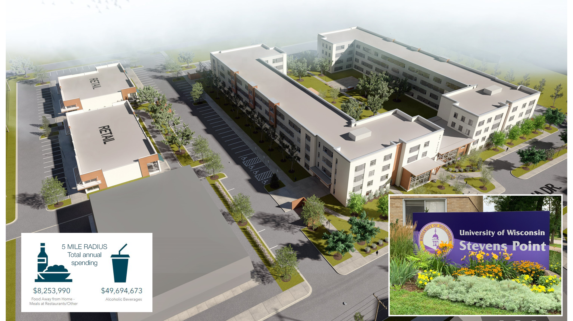 This property features: High‑traffic location across from UW‑Stevens Point, Stevens Point High School, and Sentry Insurance headquarters.; Part of a PUD with a total of 440 units.; Build‑to‑suit opportunities available.