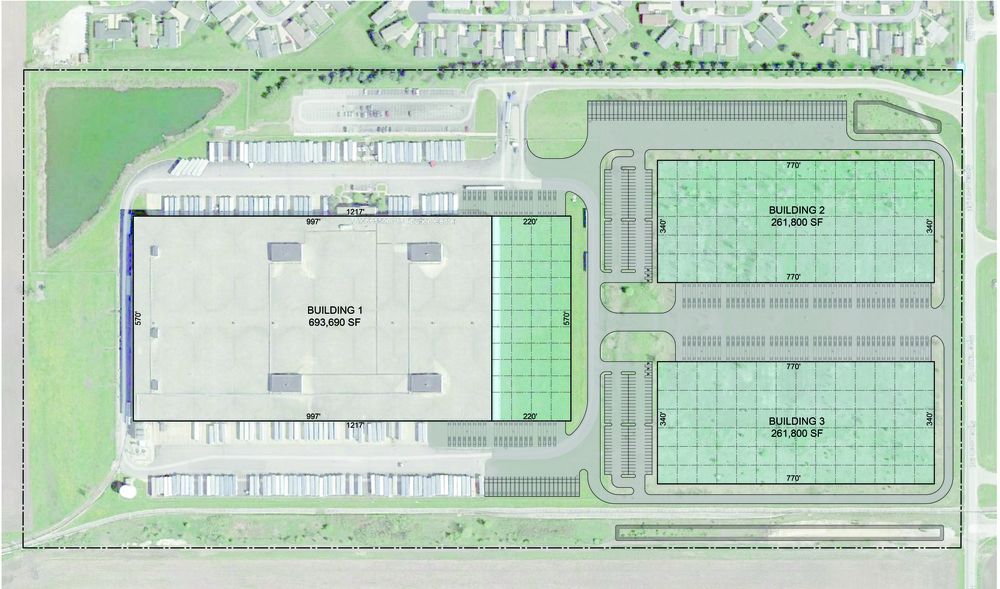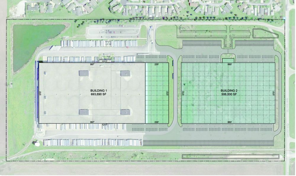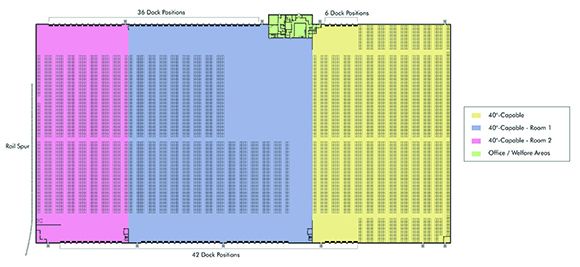 Existing divisible warehouse with temperature control and rail access.