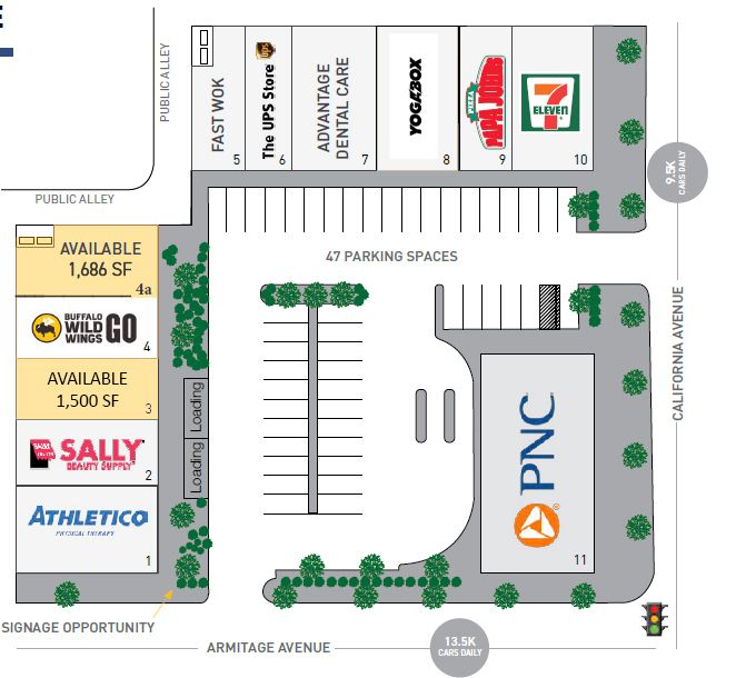 Retail space is available for lease at the northwest corner of the signalized intersection of California Avenue and Armitage Avenue in Logan Square. The location offers an opportunity to join co-tenants such as 7-11, Buffalo Wild Wings Go, Athletico, Papa Johns, The UPS Store, Sally Beauty, and PNC Bank. On-site parking is available for up to 47 vehicles. The center is within walking distance of the California and Western Blue Line "L" stops. Neighboring retailers include Walgreens, McDonald's, Jersey Mike's, Starbucks, Dunkin Donuts, Parson's Chicken, Chase Bank, and Orange Theory. The property benefits from visibility and exposure to over 23,000 vehicles per day. Signage opportunities are available along Armitage Avenue. The property is located at 2820 W Armitage Avenue, Chicago, IL 60647 and has a property size of 22575 square feet.