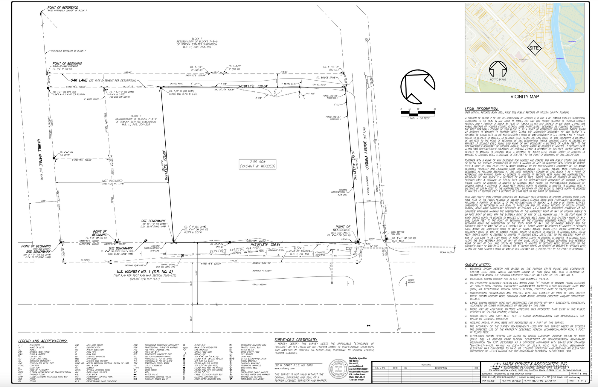 This 2.06-acre commercial land parcel is located on the east side of North US Highway 1 in Ormond Beach, Florida, just south of the Airport Road intersection. The property features 327 feet of frontage on North US-1 and benefits from a corner location with left-in/left-out access. The B-8 zoning allows for a variety of uses, including office, retail, assisted living facilities (ALF), and convenience stores. The average daily traffic count is 31,000. A new survey and topographic map are available, along with a geotechnical evaluation, species report, and stormwater permit. All engineering documents are available to facilitate project commencement.