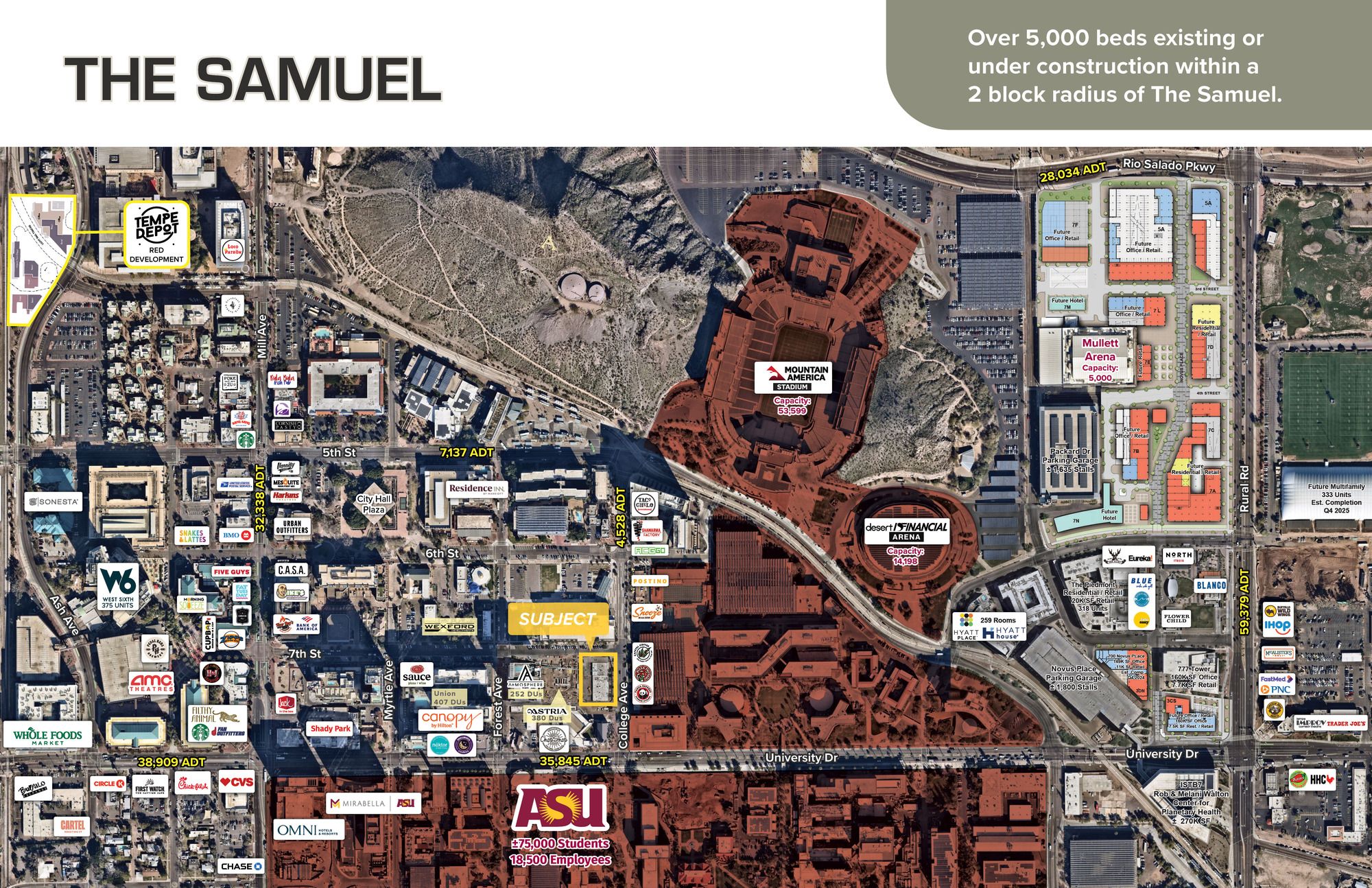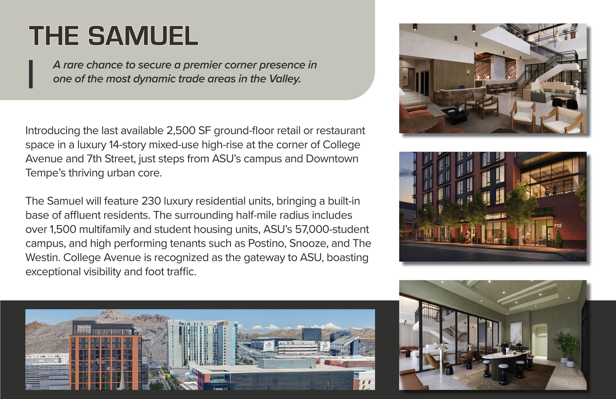 This 2,500 square foot retail space, complete with a patio, is located on the southwest corner of College Avenue and 7th Street. Situated steps away from Arizona State University's campus and Downtown Tempe, its College Avenue location is known as the gateway to ASU, offering high visibility and foot traffic. The surrounding area includes over 1,500 multifamily and student housing units within a half-mile radius, alongside tenants such as Postino, Snooze, and The Westin. The space is located in a new luxury 14-story mixed-use high-rise and offers end cap space with a patio on the first floor. The Samuel, the name of the high-rise, will feature 230 luxury residential units and is just steps from the 57,000-student ASU campus.