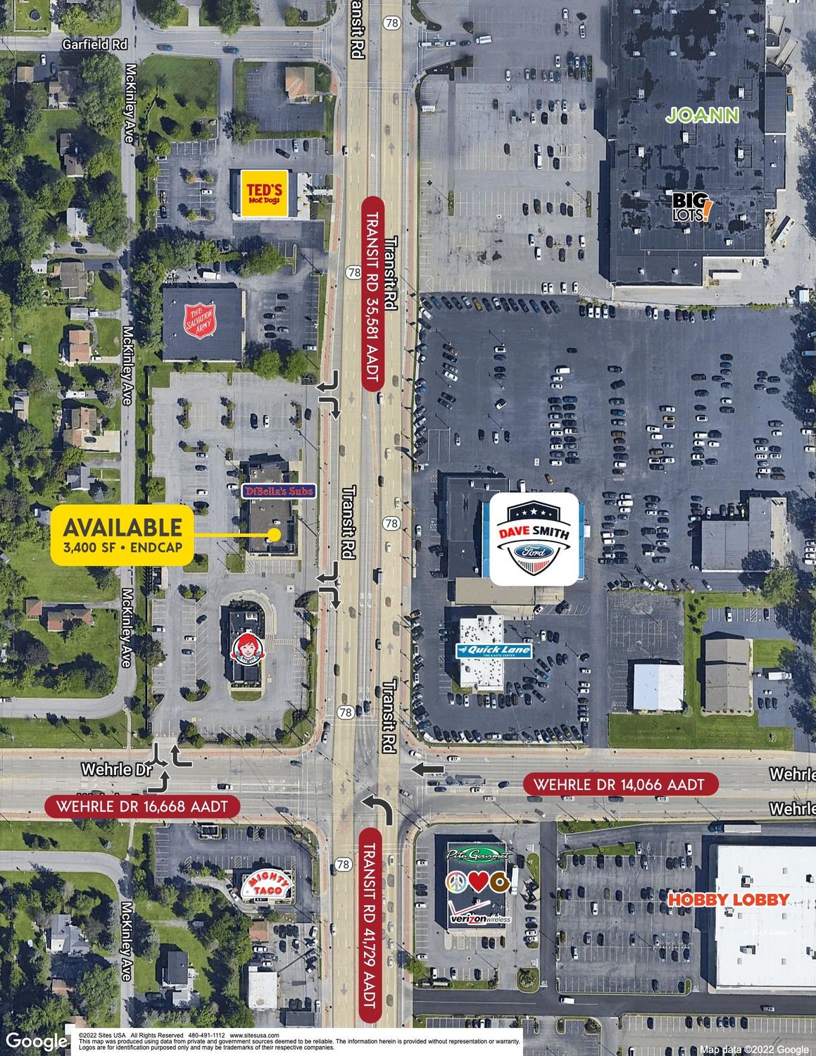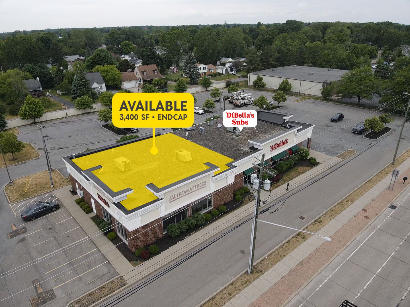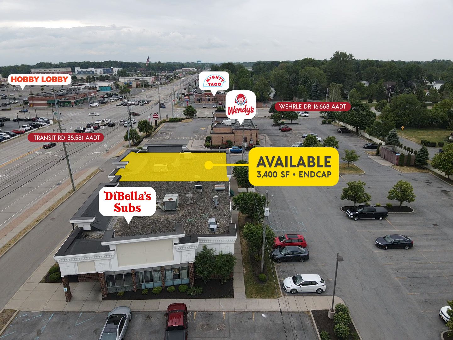 This 7,600-square-foot retail space is an endcap location with a generous parking lot behind the building. The site has cross-access with Wendy's. Located in Amherst, NY, the property is situated on Transit Road, a dominant retail corridor on the east side of the Buffalo, NY, MSA, and allows cannabis retail locations. The trade area offers high traffic counts and quick access to highways. Numerous big-box retailers operate along Transit Road, creating a large draw. The available space is located just off the intersection of Transit Road and Wherle Drive, less than a mile from I-90. Big Box Retailers along Transit Road include Wegmans, Tops, Home Depot, Lowe's, TJ Maxx, Hobby Lobby, Burlington, Walmart, Michael's, Target, Homegoods, and Kohl's. Other retailers of note include Starbucks (x2), Burger King, Dunkin', Red Lobster, Olive Garden, Chili's, Wendy's, and Dairy Queen. The lease is NNN. Pylon signage and building signage are available. The space is co-tenanted with DiBella's.