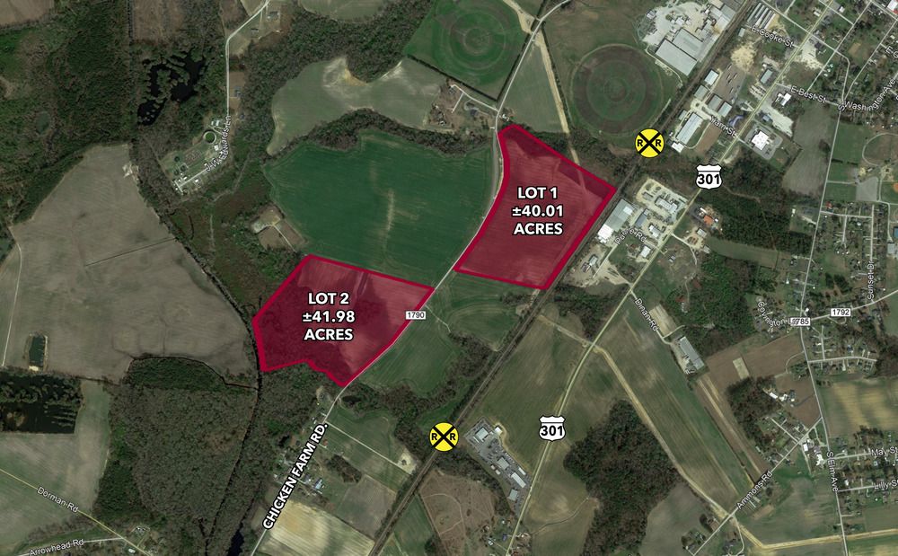 Two industrial sites are available south of Dunn, North Carolina, within the town's ETJ. The sites are located near utilities, including water, sewer, gas, and power. One lot spans approximately 40.01 acres and is adjacent to a CSX Rail Line. The other lot, approximately 41.98 acres, is situated on the west side of Chicken Farm Road. Both sites are zoned Industrial in Harnett County. The 40.01-acre site is flat. The location offers proximity to Highway 421, Highway 301, and is 1.5 miles from I-95. The sites are adjacent to other industries in Edgerton Industrial Park, including Food Lion Distribution Center, 84 Lumber Truss Division, ARC3 Gases, and Adams Products. I-95 is being widened through Harnett County from Fayetteville to I-40.