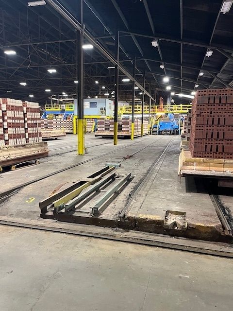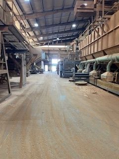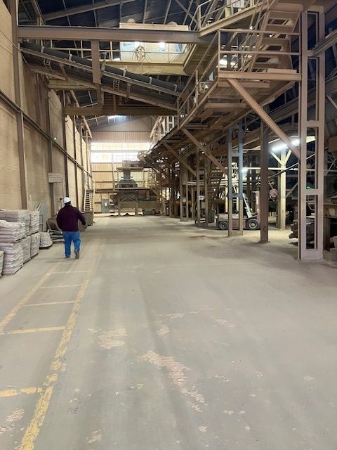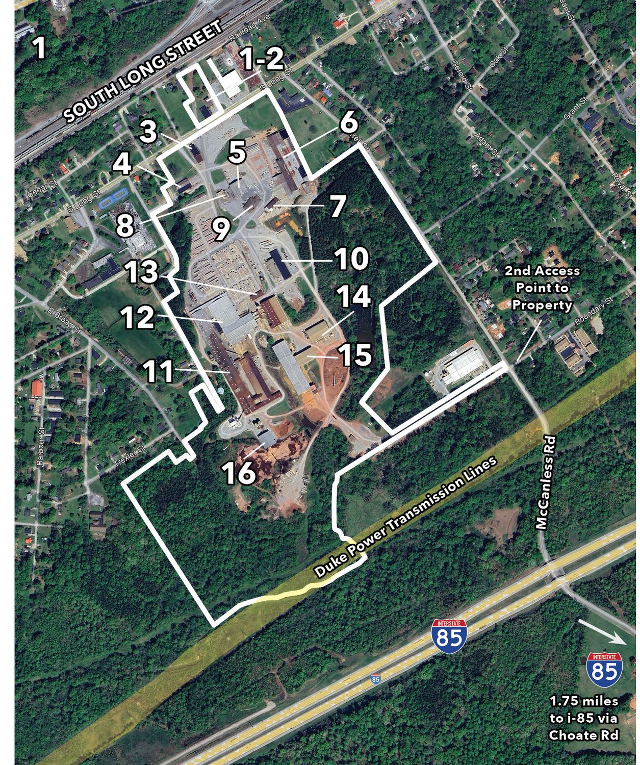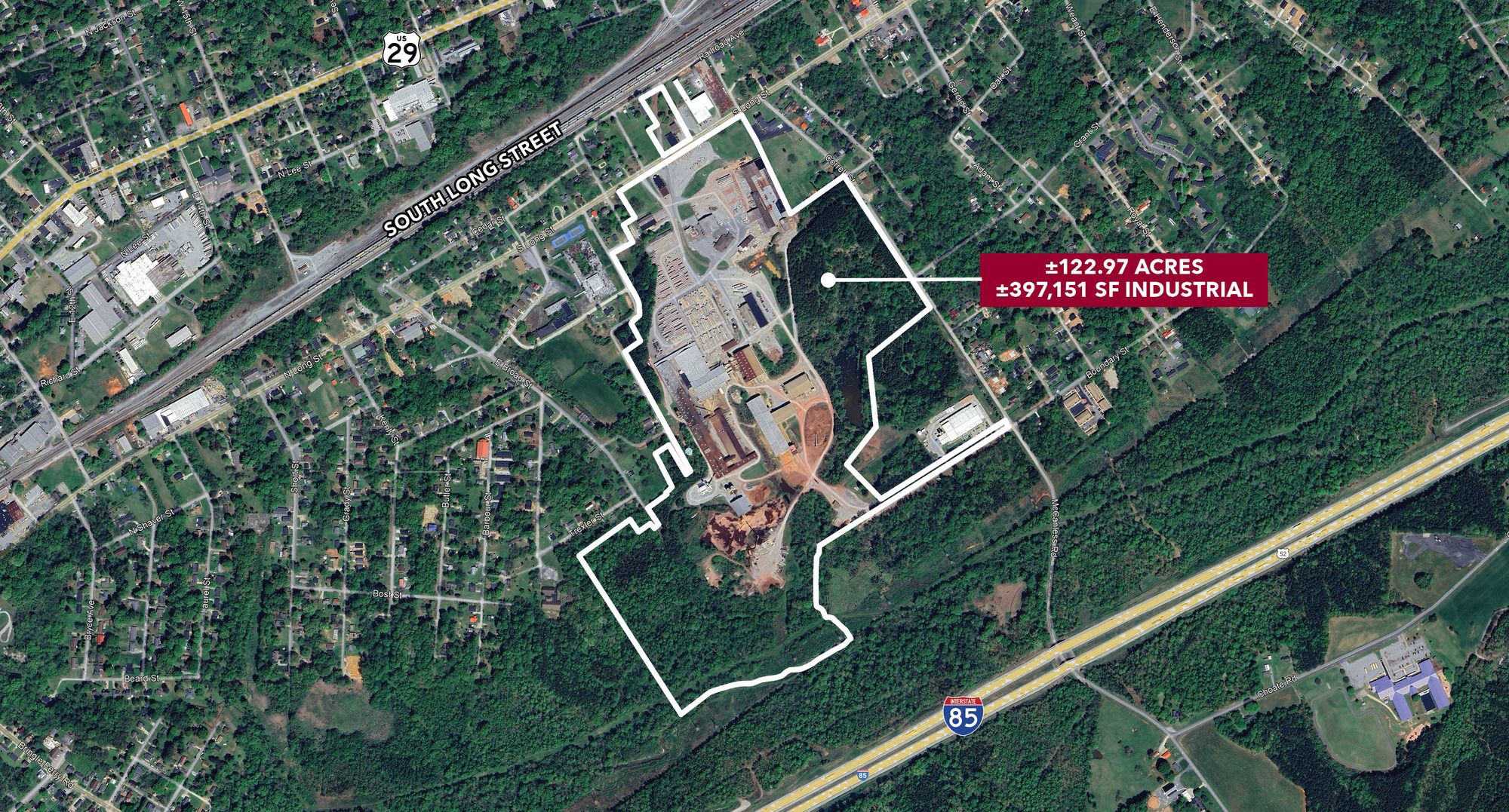 Large industrial site with manufacturing buildings, laydown space, and rail.
