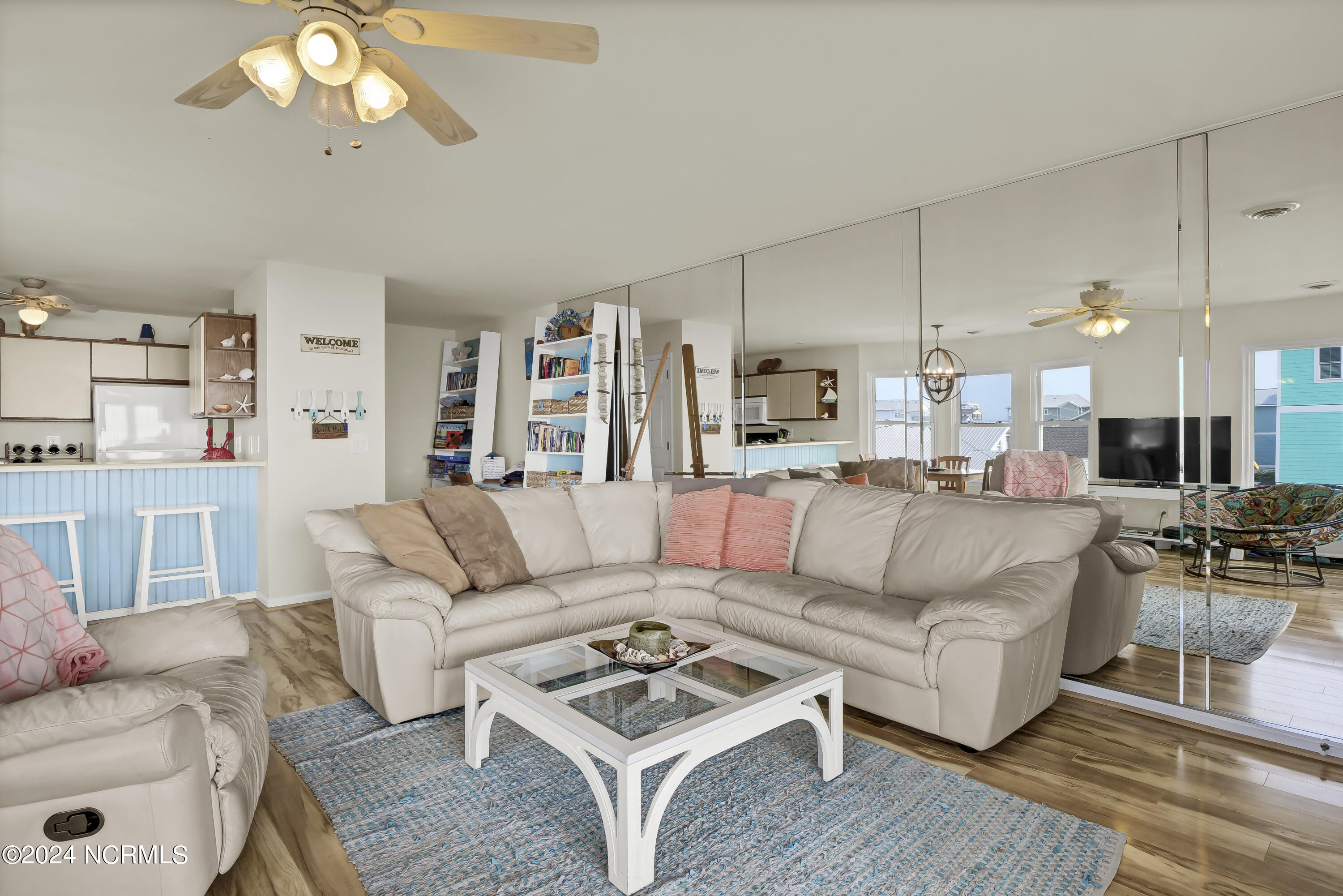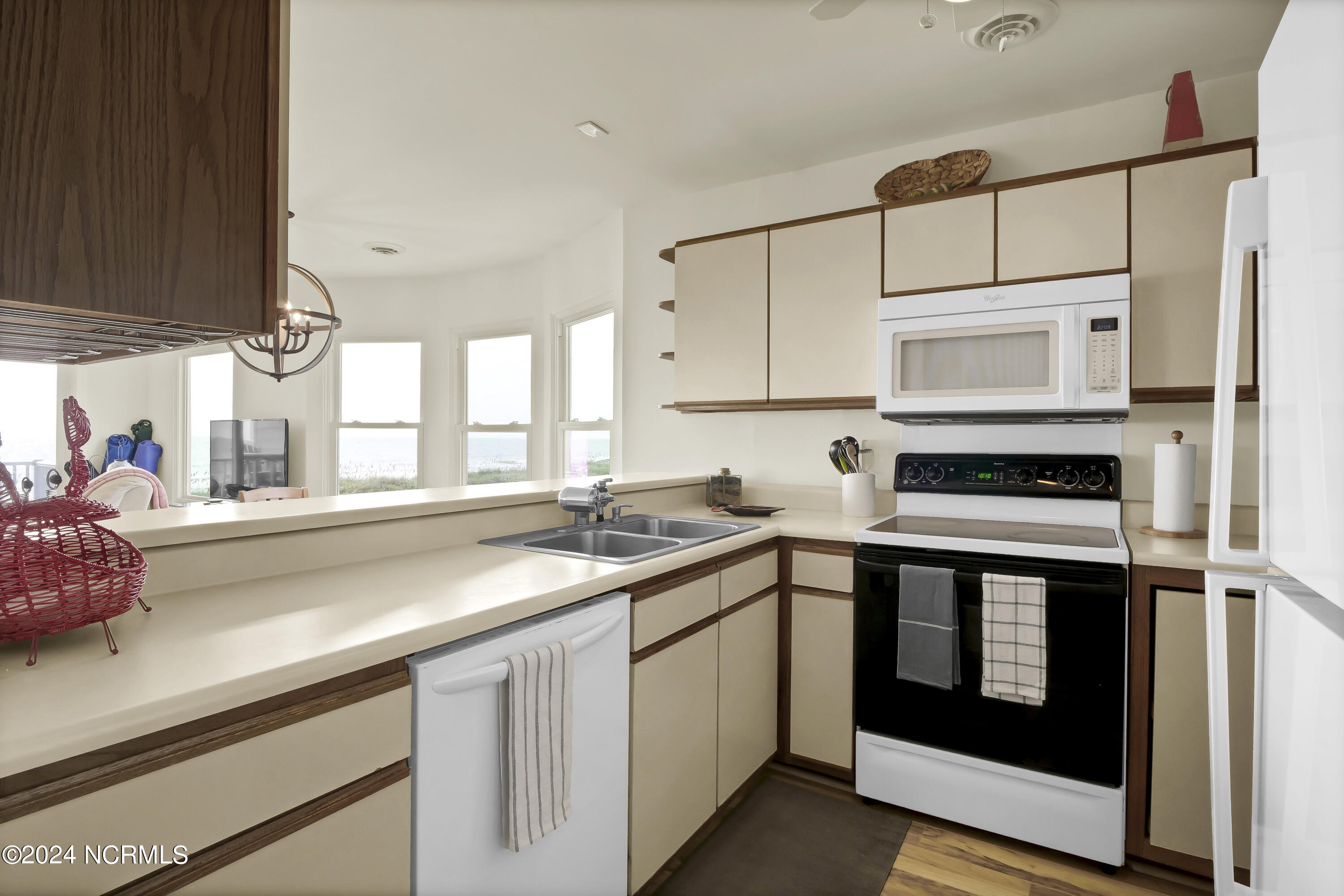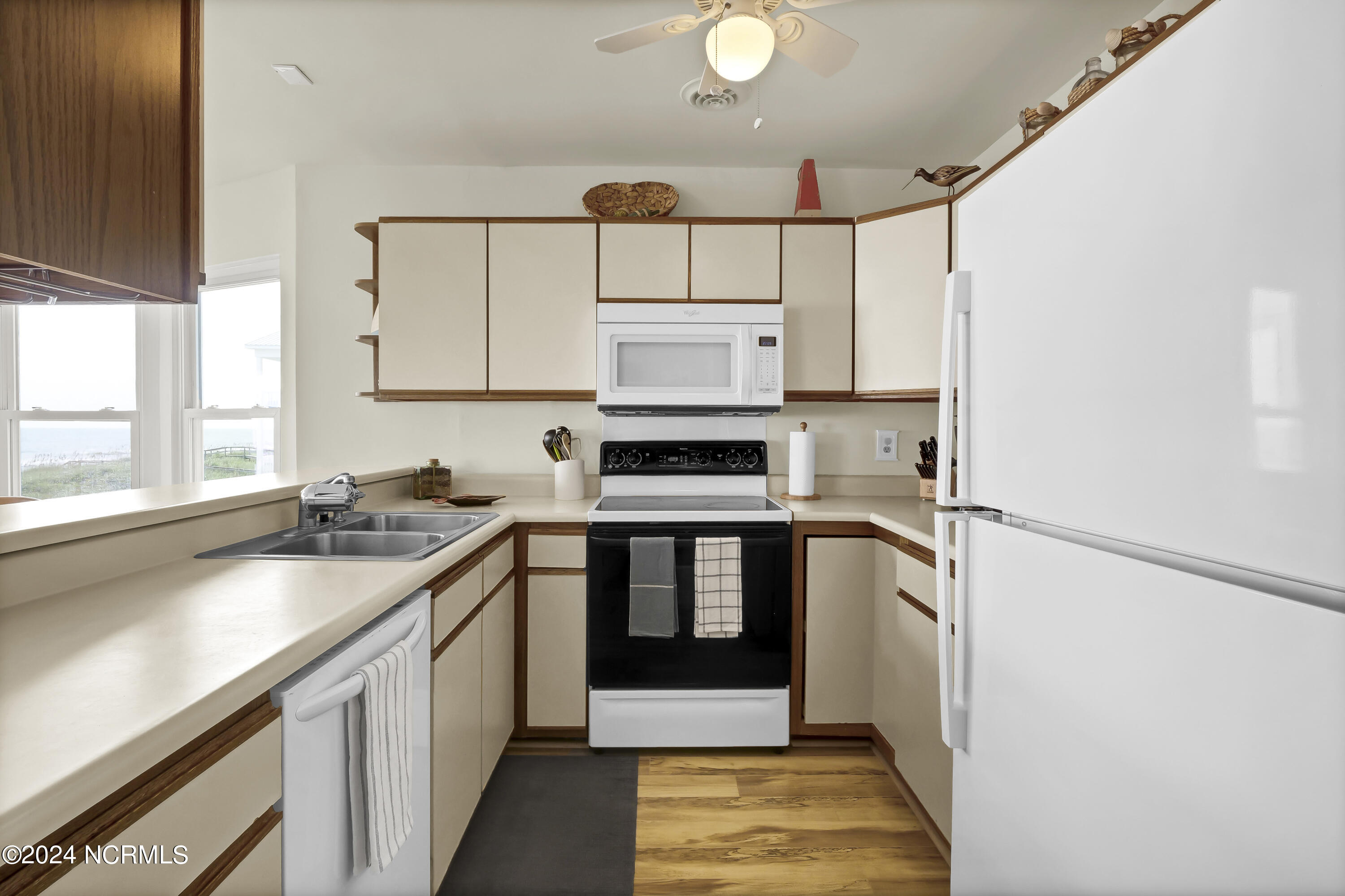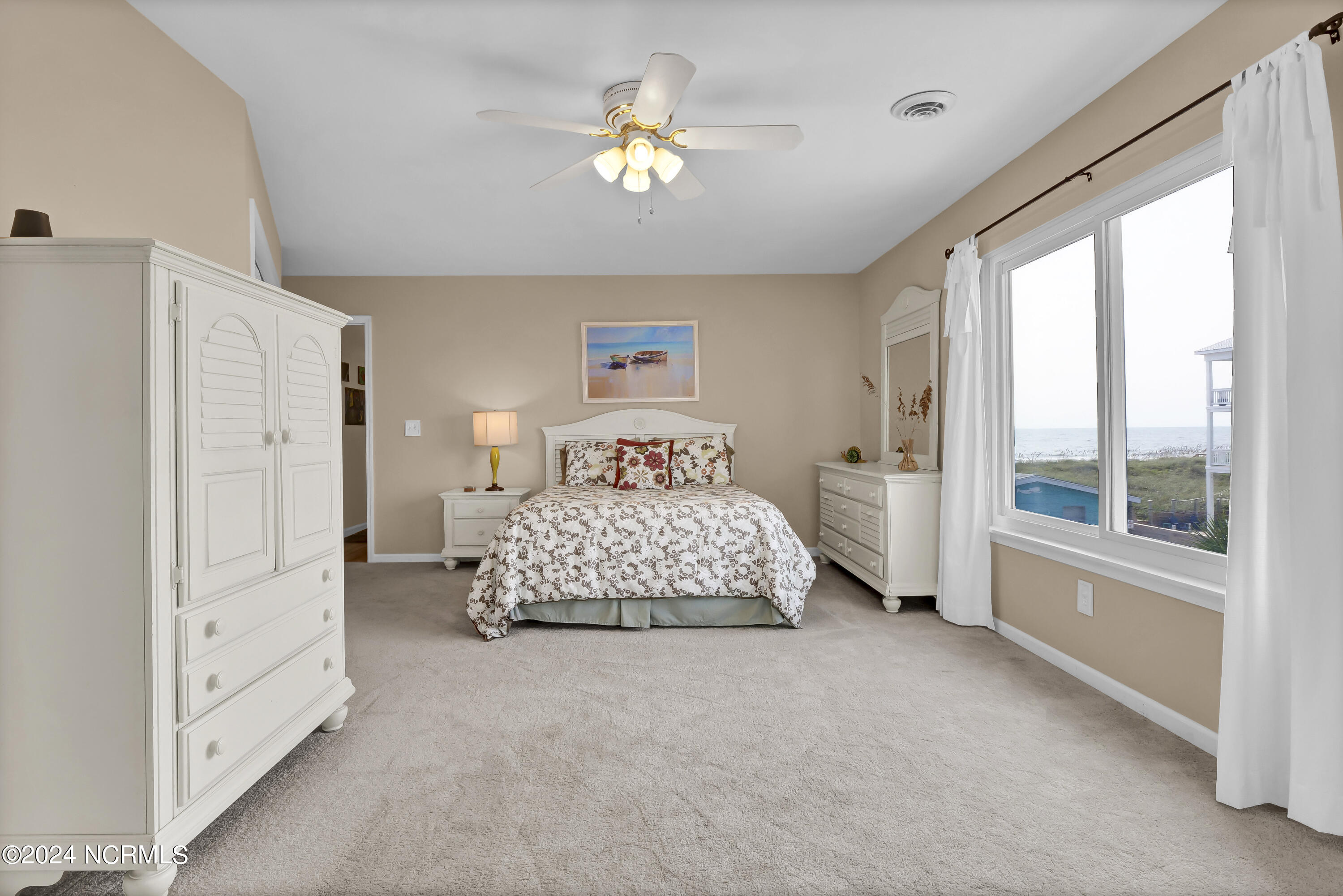 This oceanfront condo offers 1360 square feet of living space and features three bedrooms. Located on the second story, the unit provides panoramic ocean views and access to a private sundeck and beach boardwalk. The open floor plan allows for ocean views from the living, dining, and kitchen areas. Laminate flooring is present in the family areas, complemented by accent mirrors and a bay window in the dining area. The galley-style kitchen includes a pantry, ample cabinets, and counter space. The master suite features an oversized walk-in closet, a private bath with a double vanity and tiled flooring, and an additional area suitable for an office or reading space. Two guestrooms share a hall bath with tiled flooring. A laundry closet includes a washer and dryer. The property includes assigned on-site car parking for three cars. Rentals are restricted to a minimum of one month. The siding was redone after Florence. Windows and doors were replaced in 2010, and the roof was replaced in 2016.