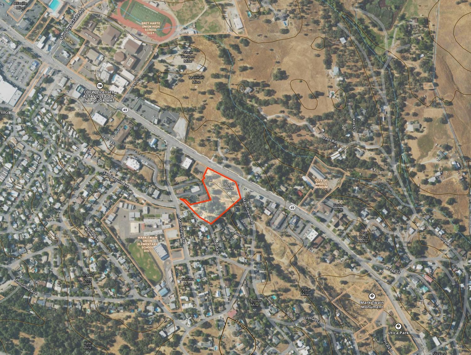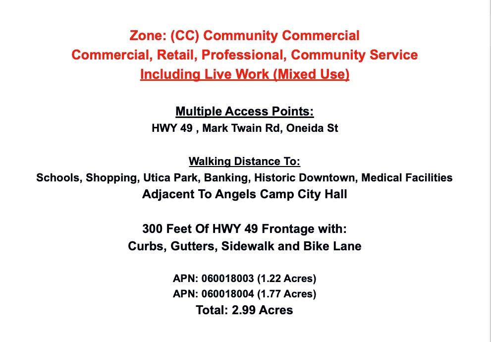 This property features: Prime Commercial Location: Situated in the heart of the new Angels Camp Commercial District with HIGH VISIBILITY and nearly 300 feet of Highway 49 frontage.; Flexible Zoning: Zoned Community Commercial (CC) allowing for Commercial, Retail, Professional, and Live‑Work (Mixed Use) developments.; High Traffic Area: Located near Historic Downtown, Utica Park, City Hall, professional offices, and US Bank, ensuring consistent traffic.