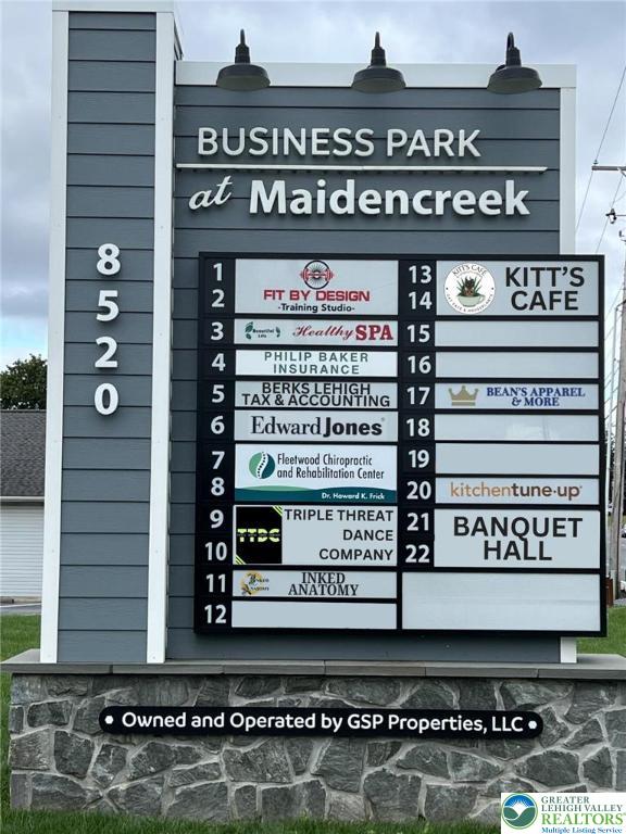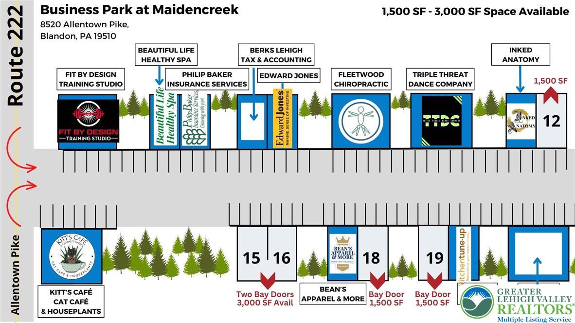 Located on Route 222 in Blandon/Maiden Creek Township, The Business Park at Maiden Creek offers an opportunity for retail businesses. An end spot provides 1,500 square feet of available space with visibility to Route 222. The project includes 11 buildings with 22 units of approximately 1,500 square feet each, which can be combined to create 3,000 square feet. The space is suitable for flex space or small warehouse tenants, professional offices, and retail or restaurant businesses. Customer and employee parking is available for approximately 100 vehicles. Current tenants include Fit by Design Training Studio, Healthy Spa, Fleetwood Chiropractic, Philip Baker Insurance, Beans Apparel & More, and Kitchen Tune Up. The property is suitable for restaurants, hair salons, nail salons, day cares, drycleaners, tax offices, ice cream/shaved ice businesses, brewery/tasting rooms, and gold/silver shops.