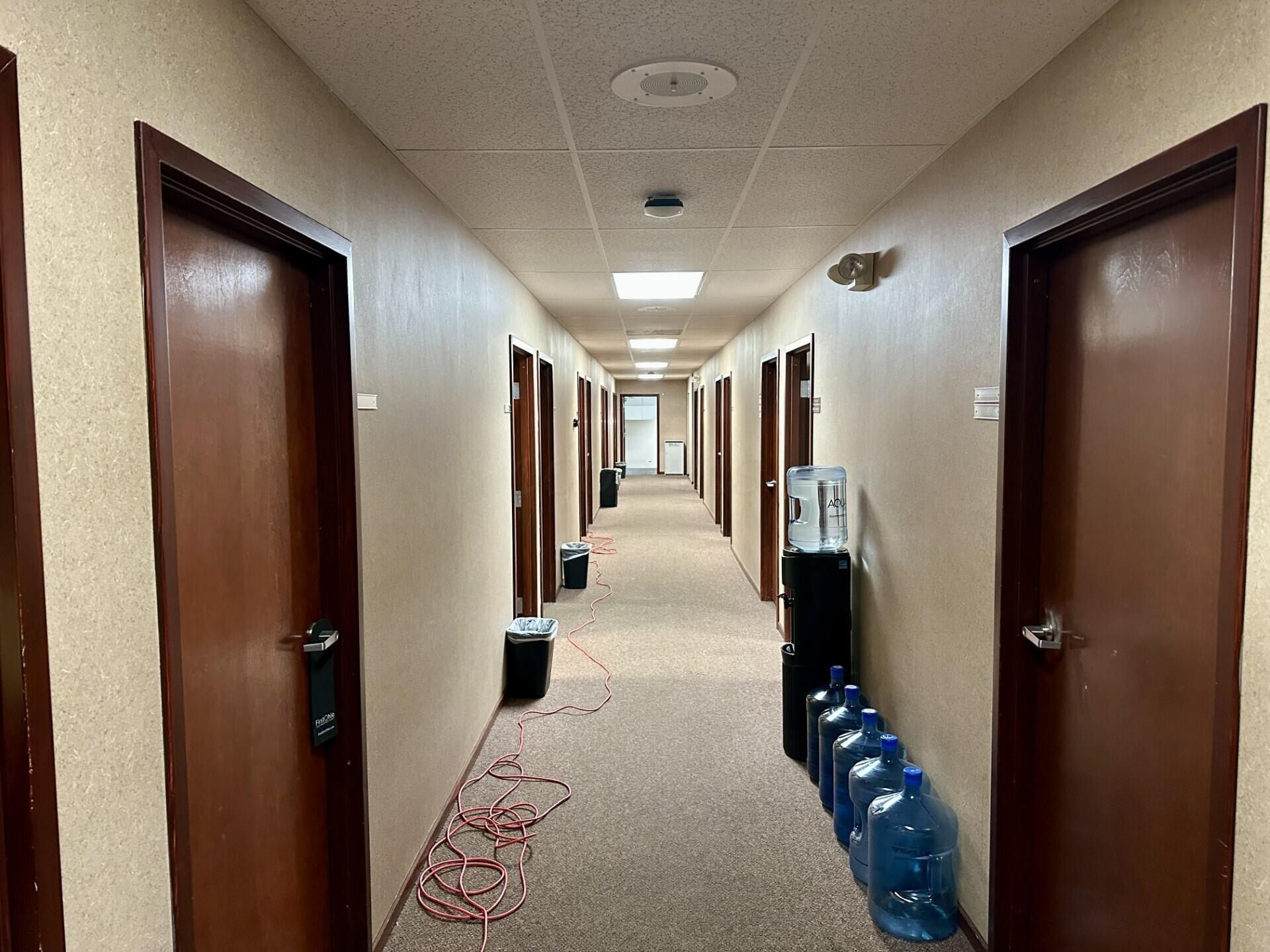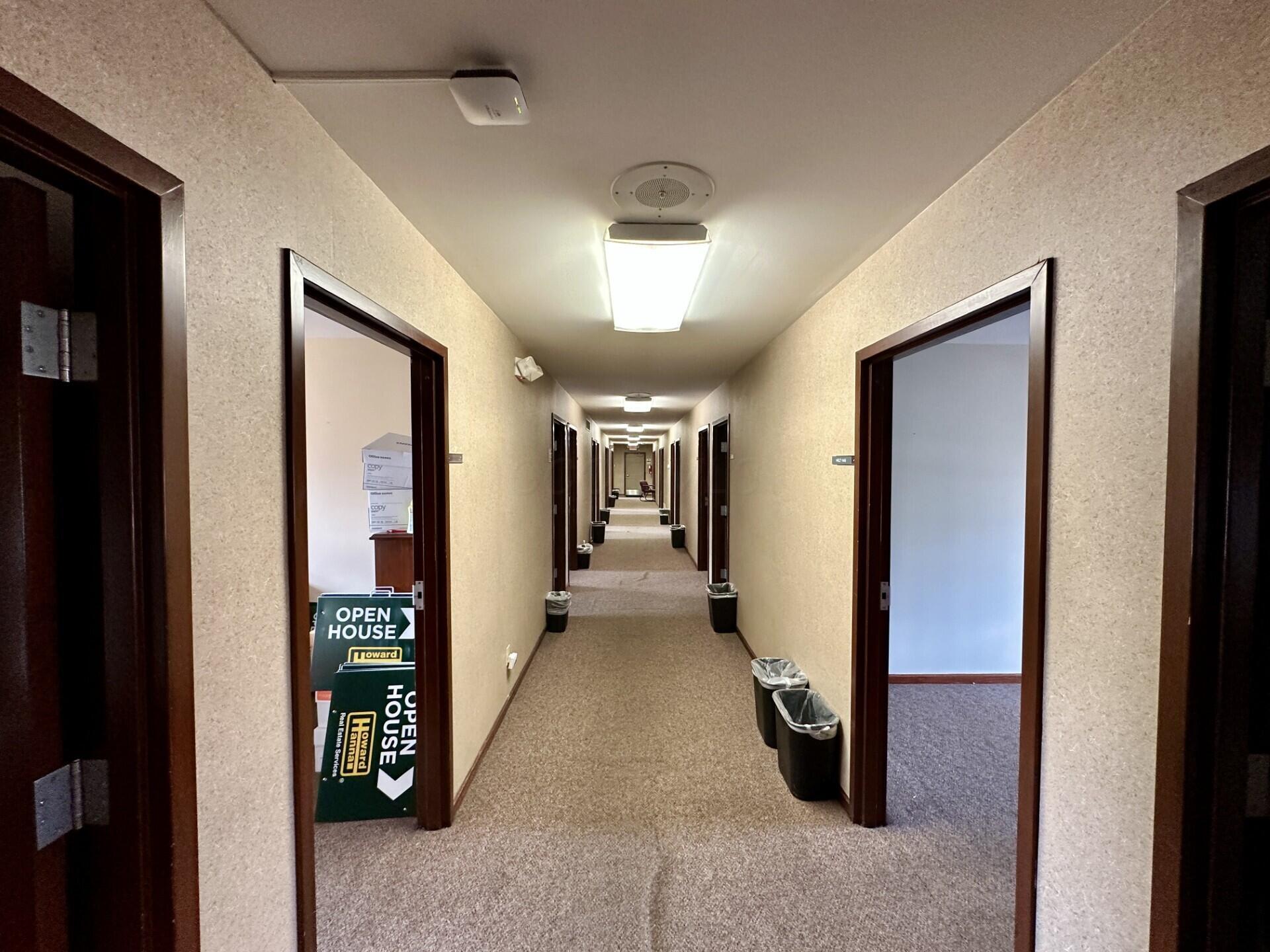 Two-story office space with prominent signage and ample parking.