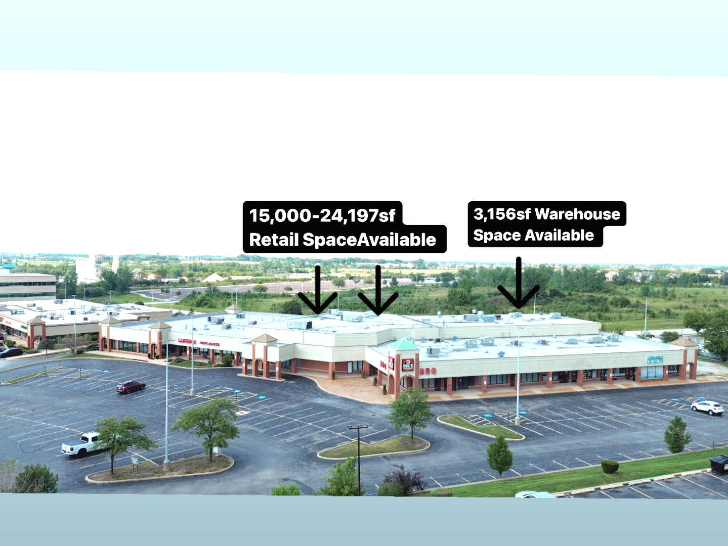 Retail center with showroom, office, and warehouse space available for rent.