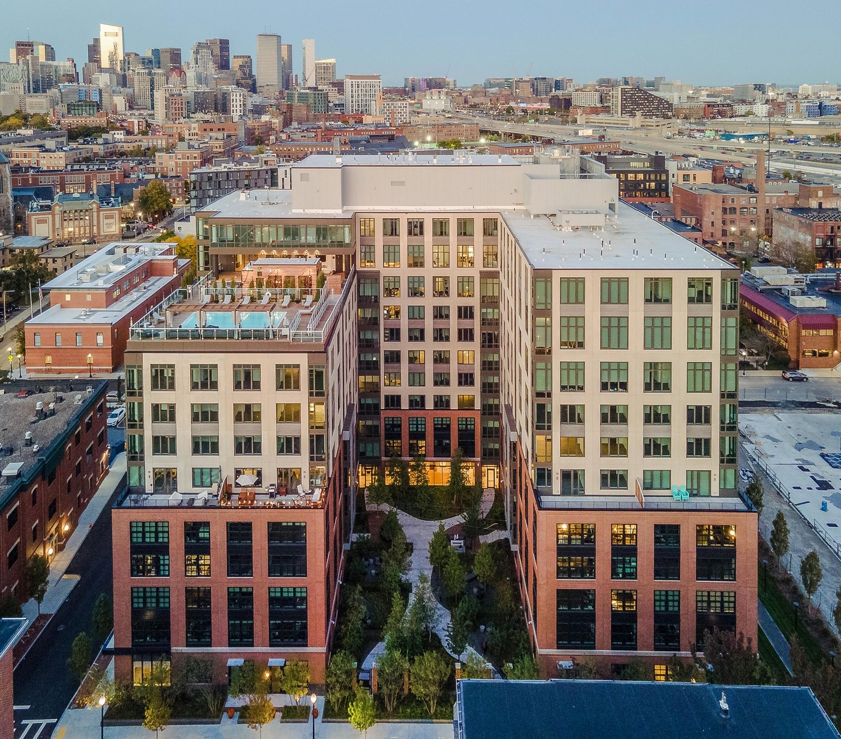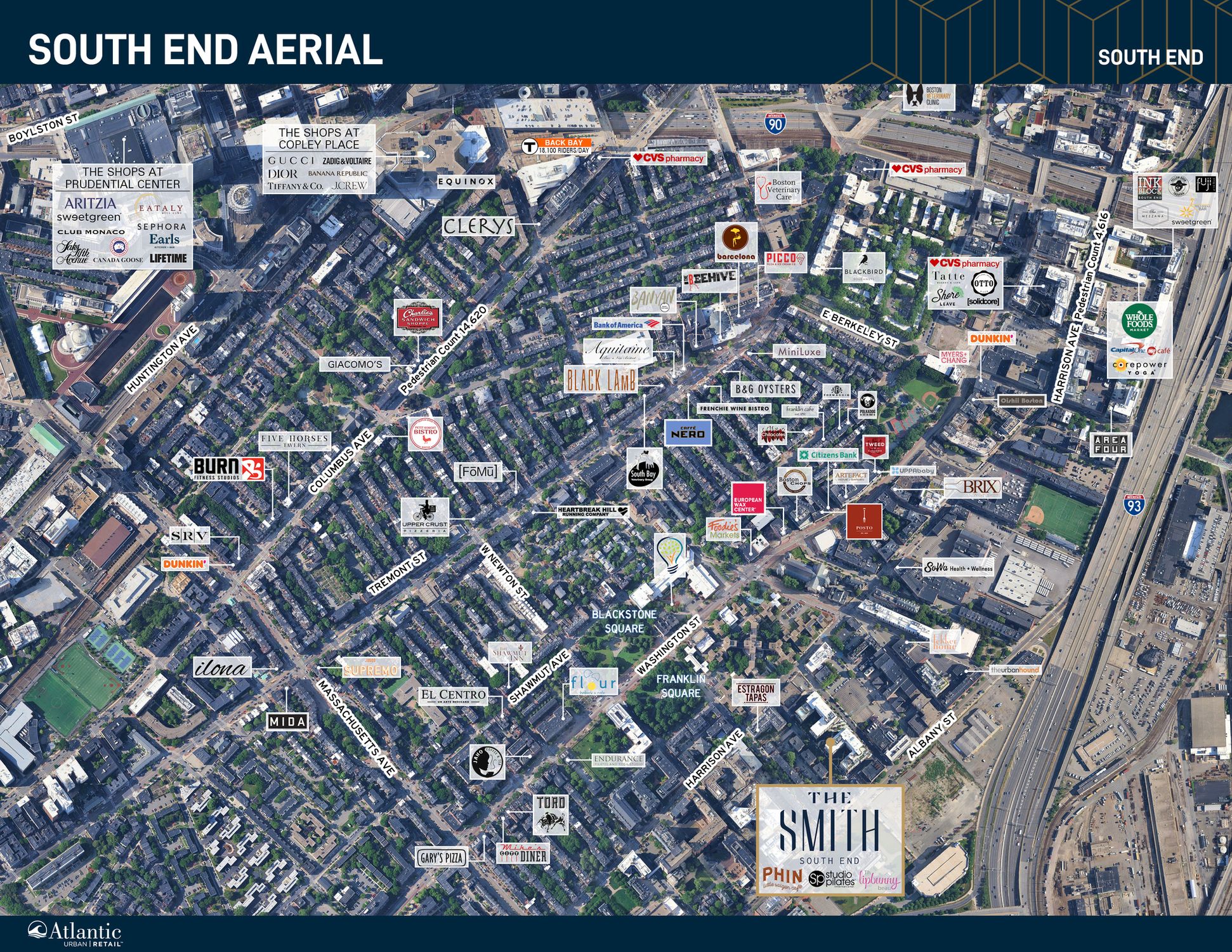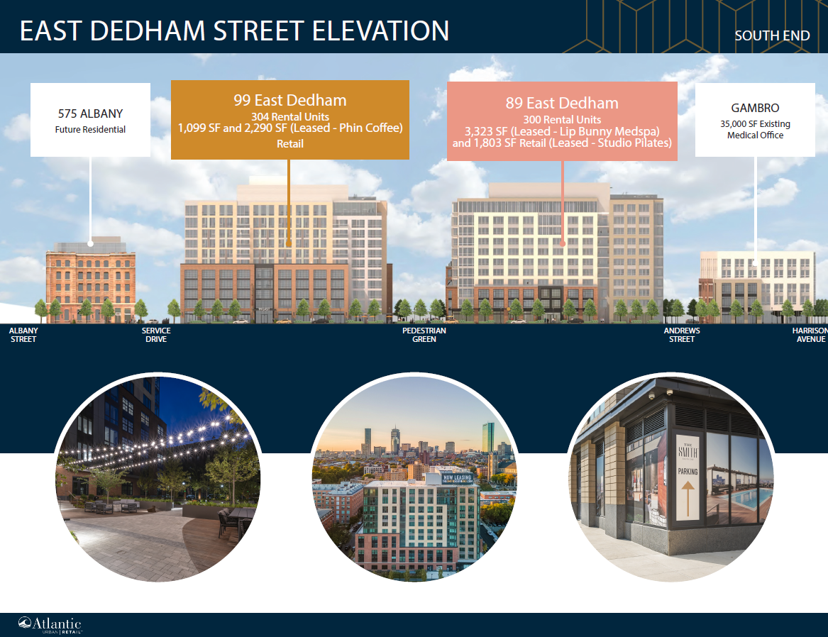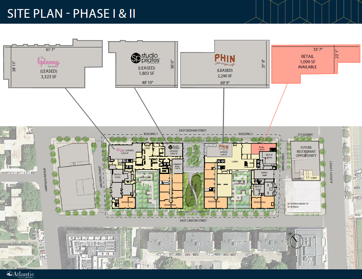 One retail space remains, offering 1,099 square feet. It is located at the base of two high-end residential buildings containing a total of 604 new units. The space is available now. The location offers ample outdoor seating for dedicated patios and impressive storefronts facing East Dedham Street. Current tenants include Lip Bunny Medspa, Studio Pilates, and Phin Coffee. There is below-grade parking available with 414 car spaces.