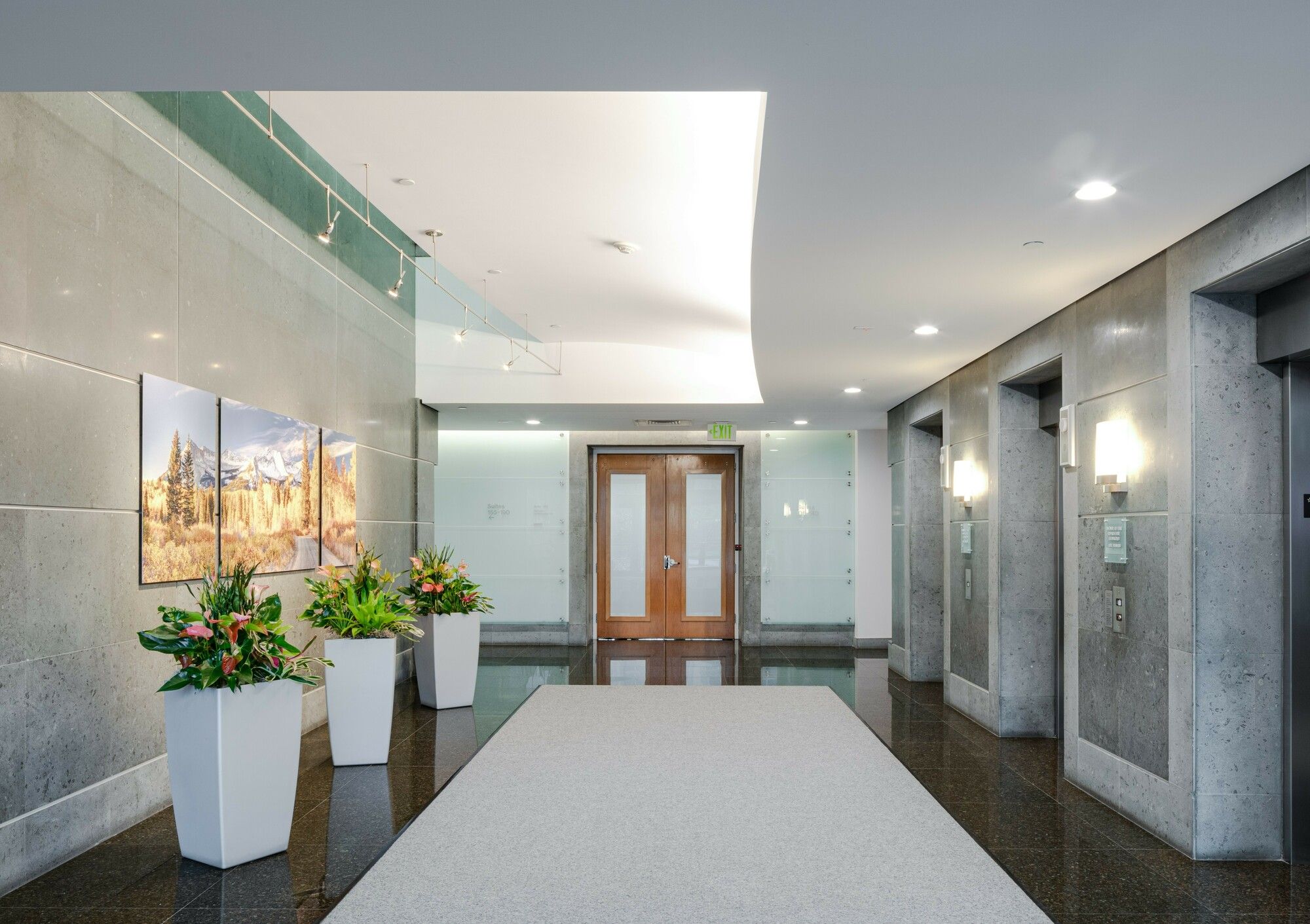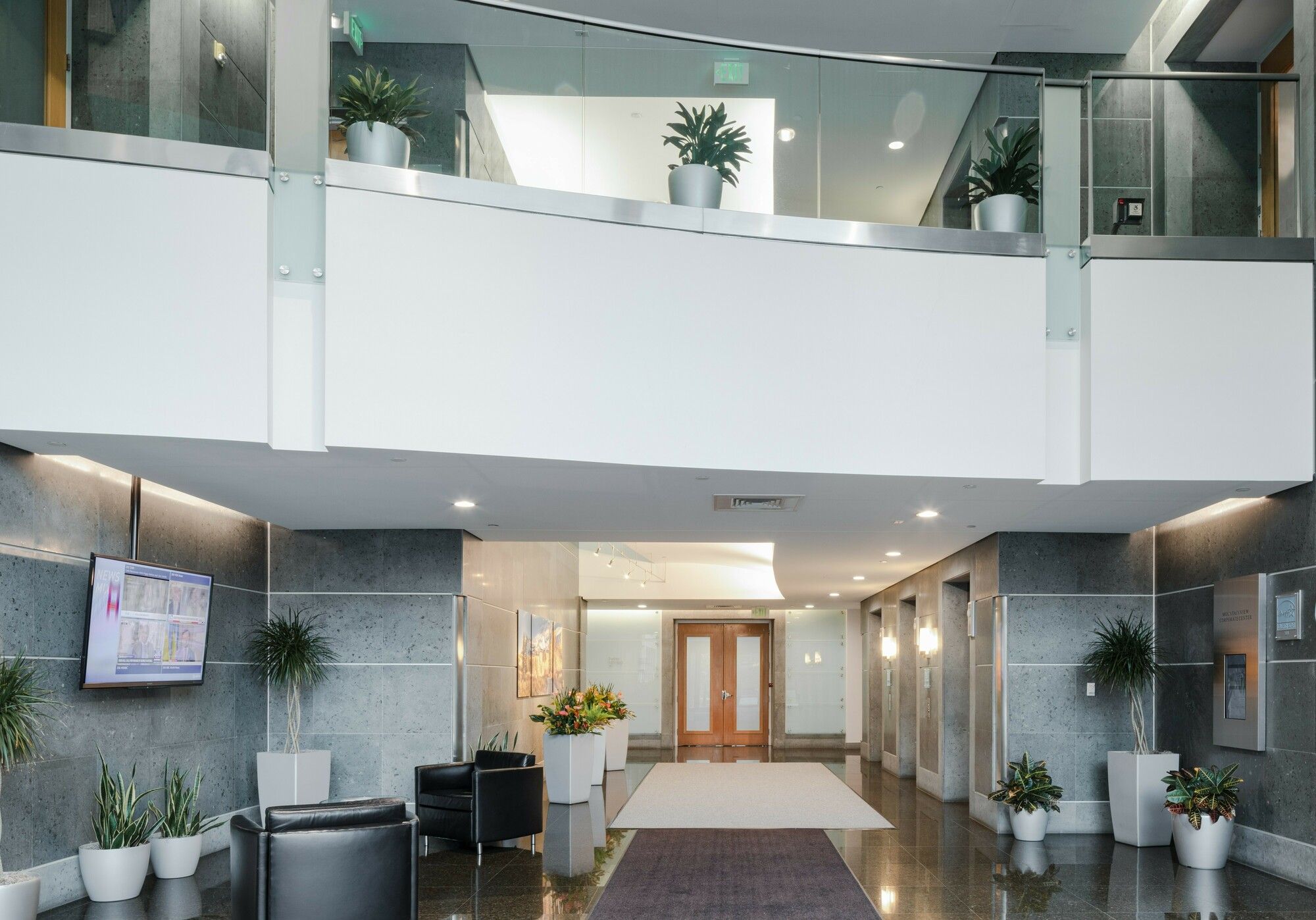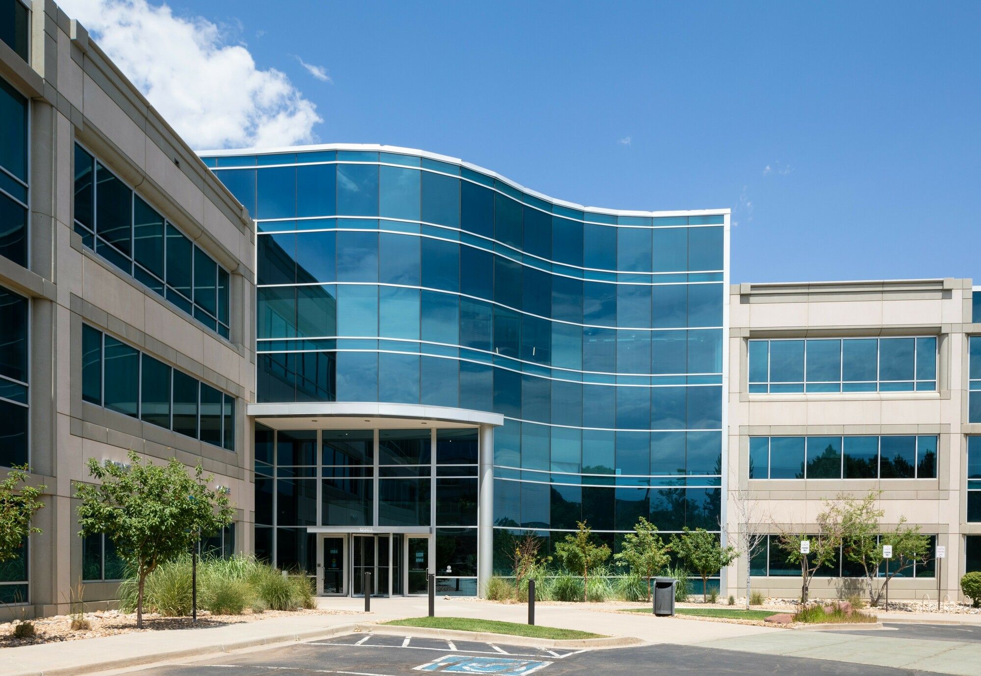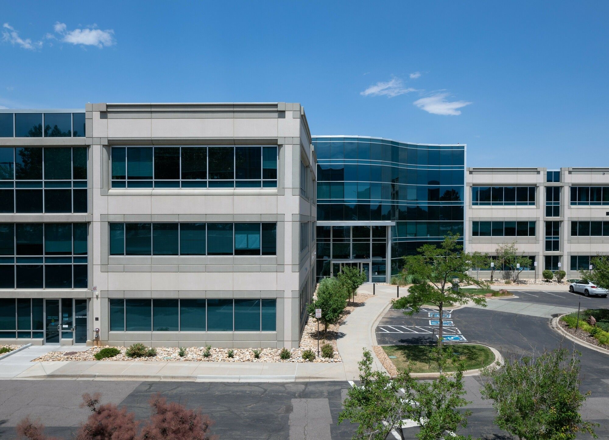 Office space in a four-building complex with mountain views.