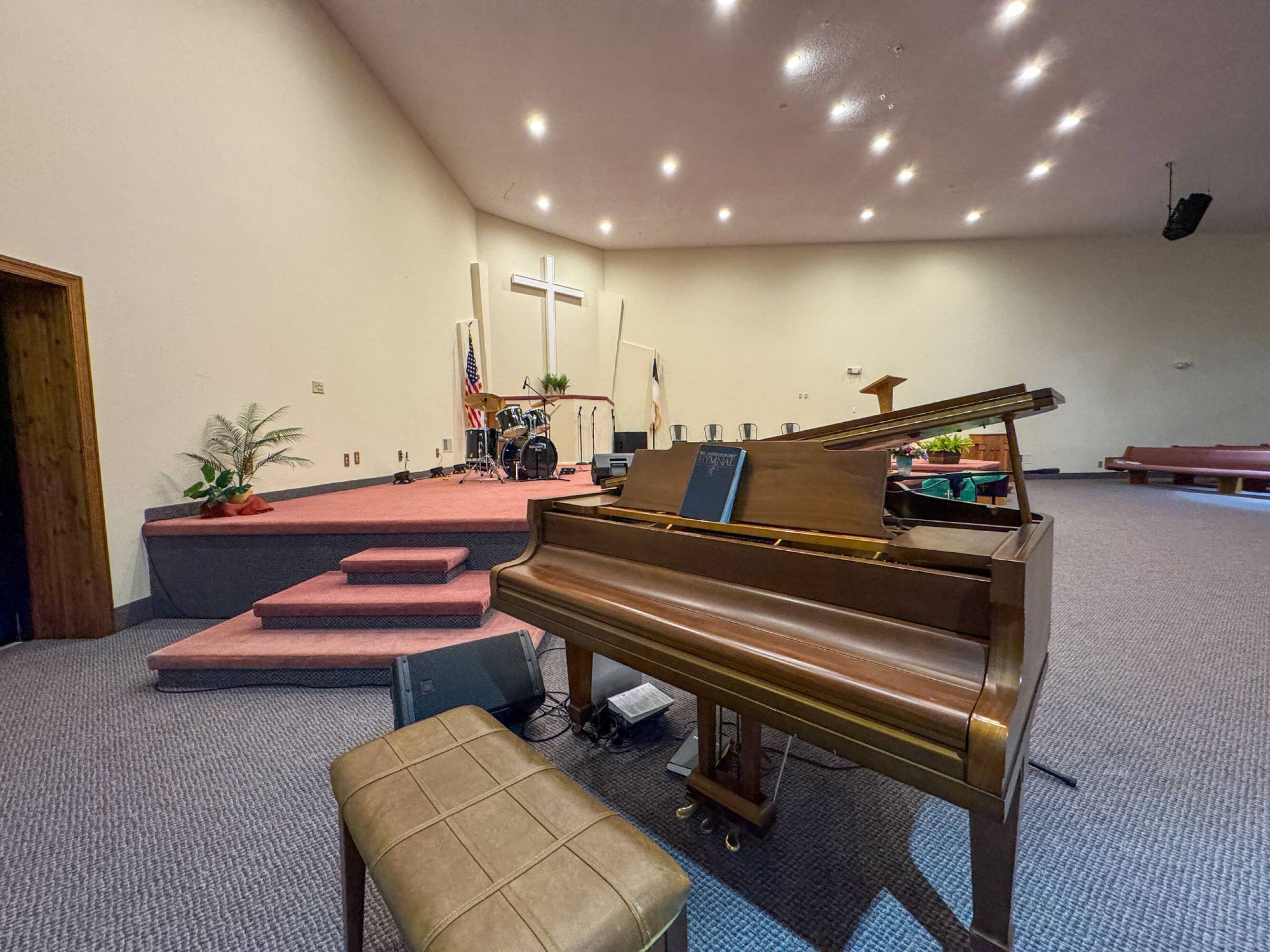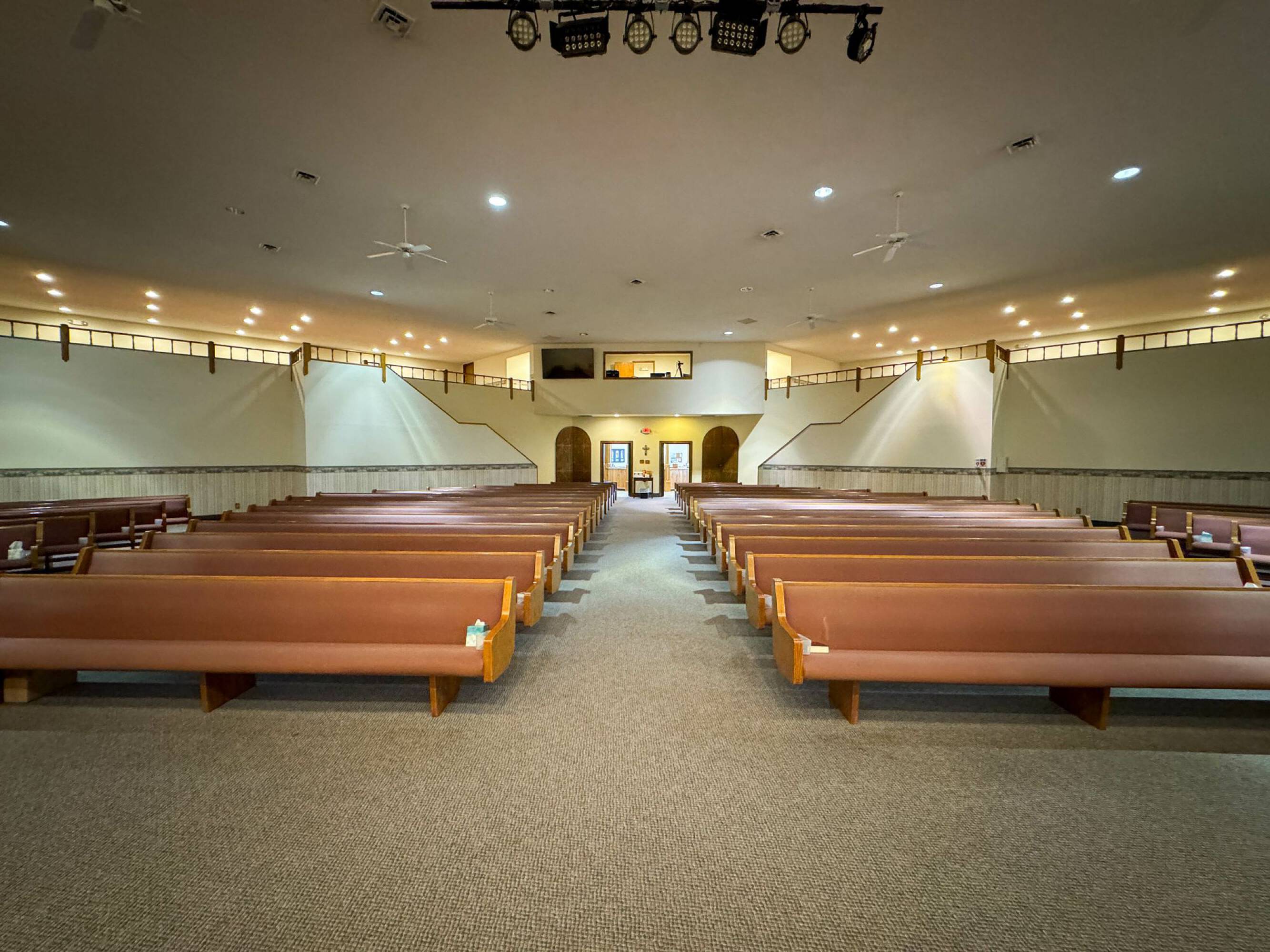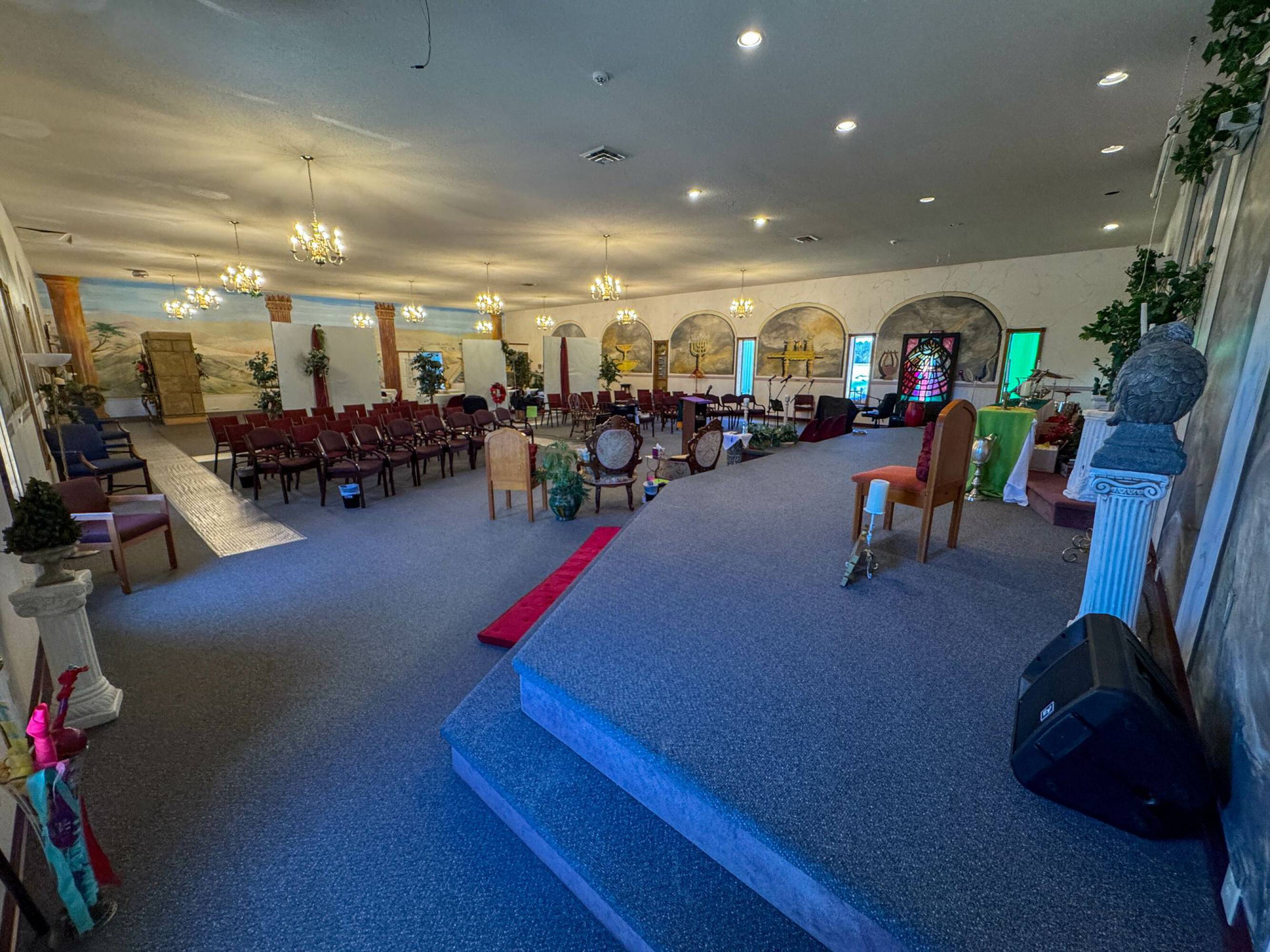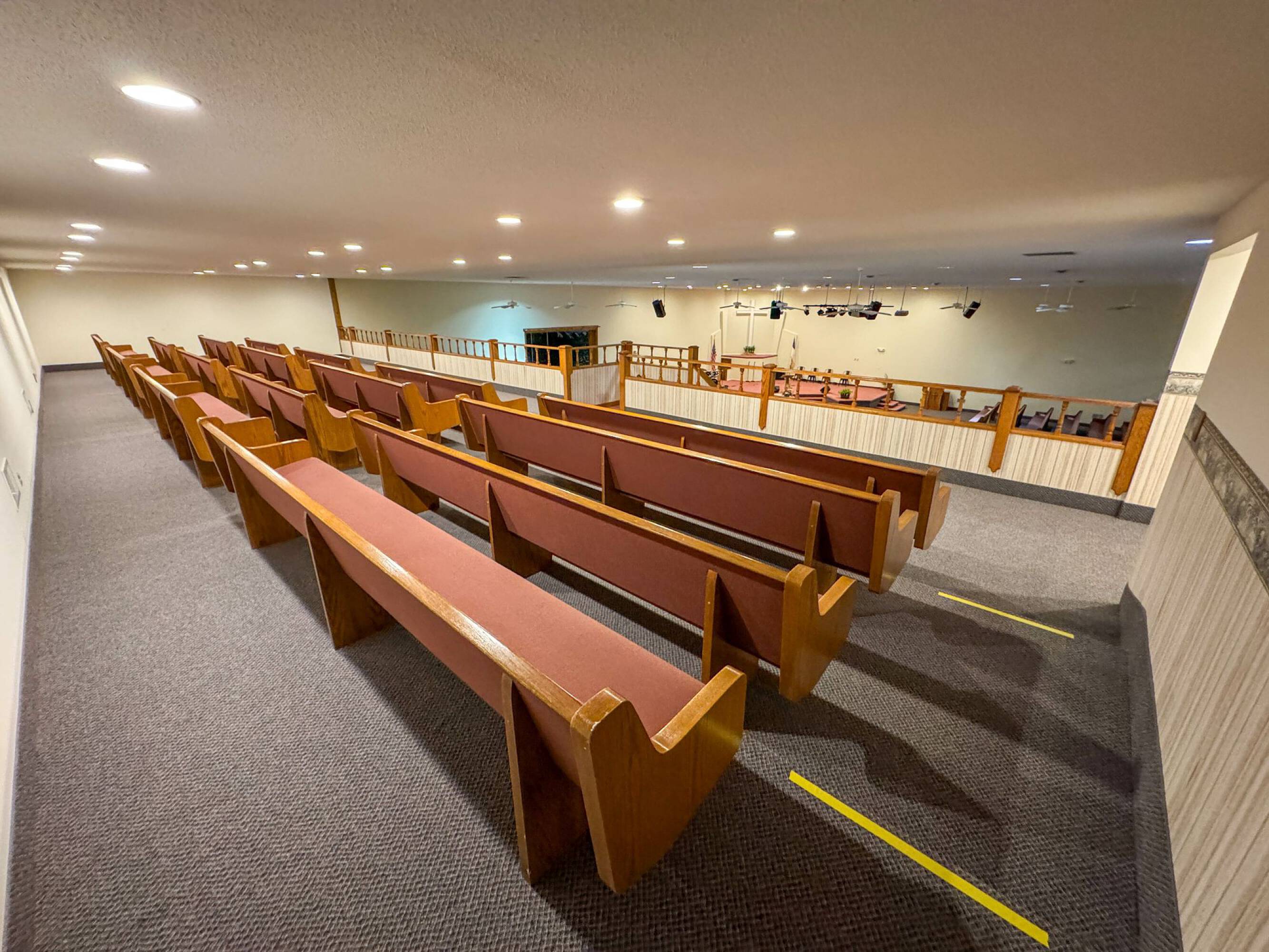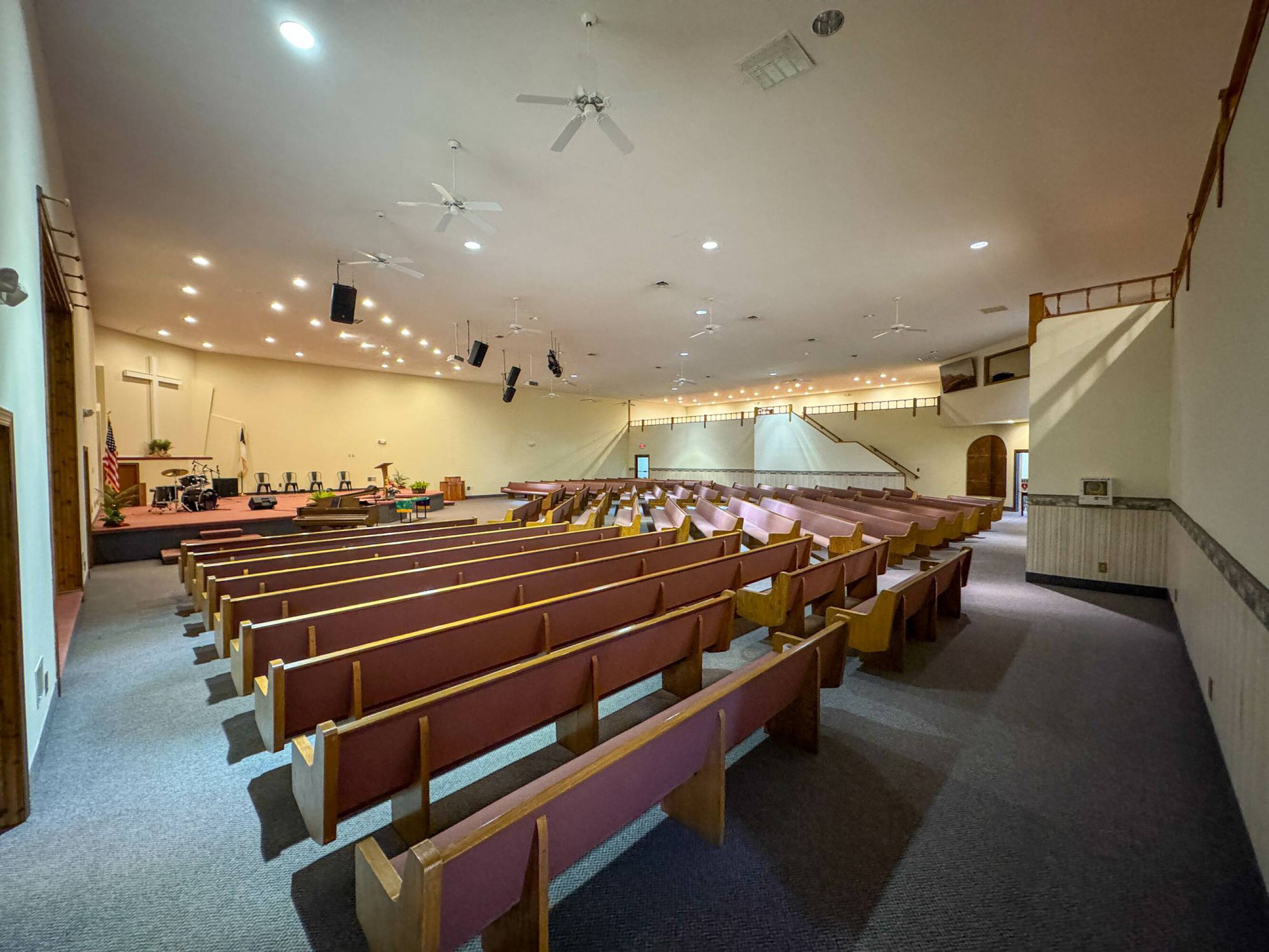 This property features: 8.52‑acre property with multiple buildings.; Main building: **24,908 sq ft with two sanctuaries (seats 700 in main sanctuary)**.; Includes a +/- 1,500 SF warehouse with bay door.