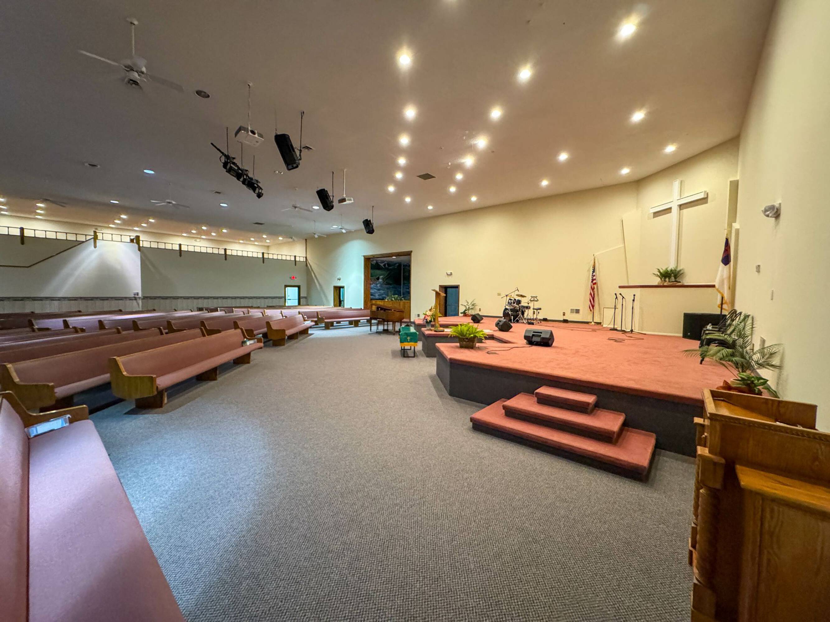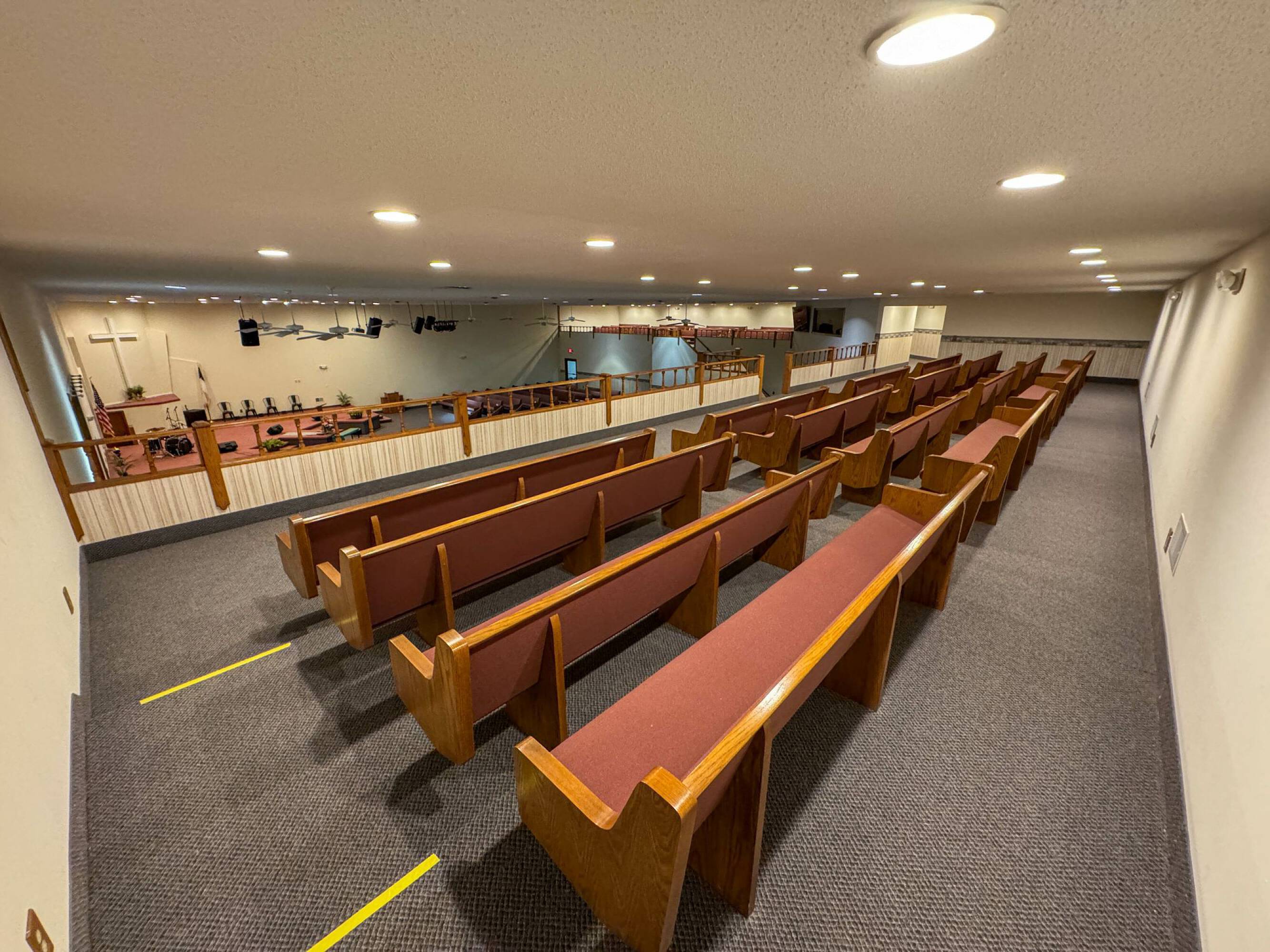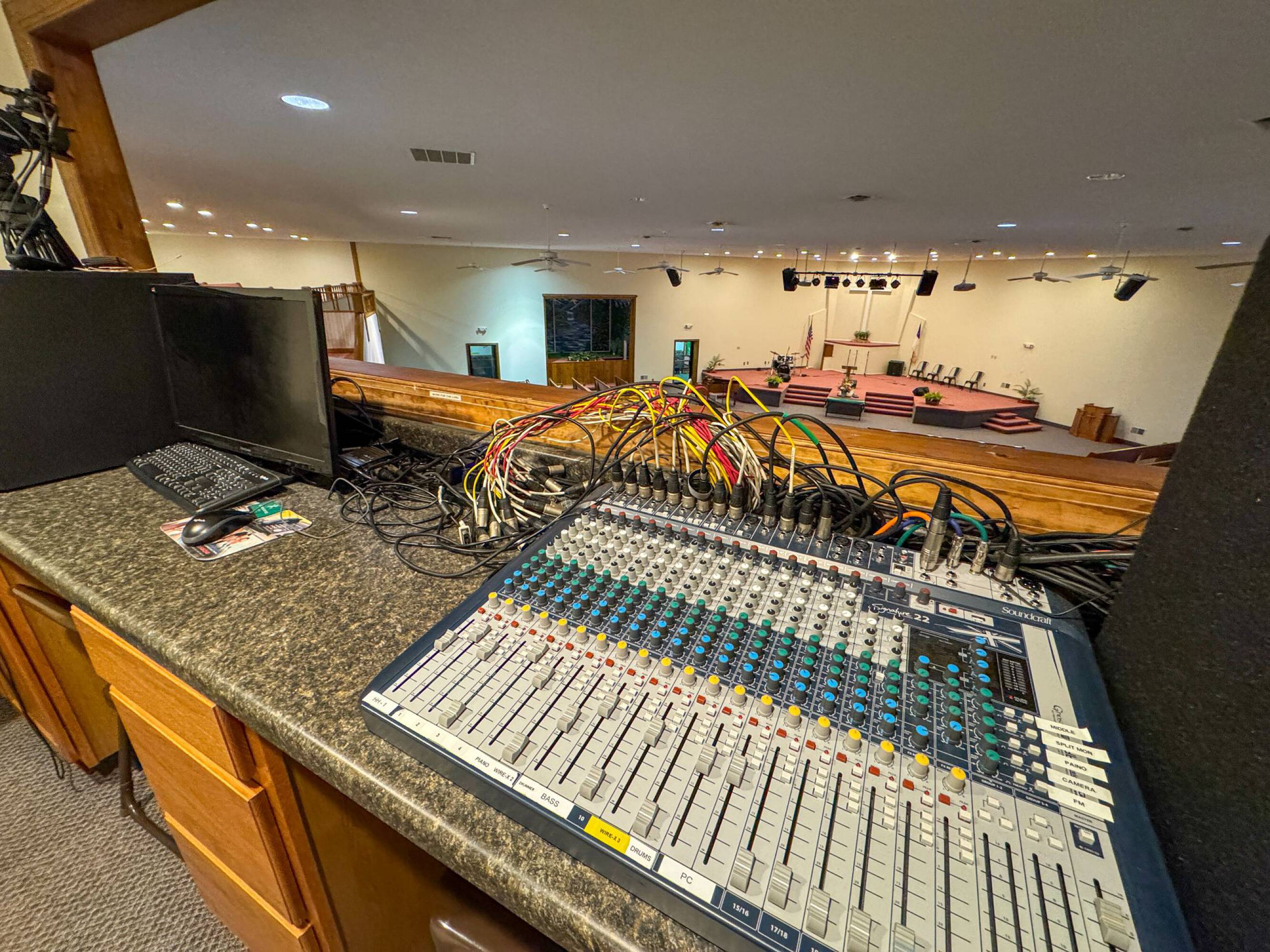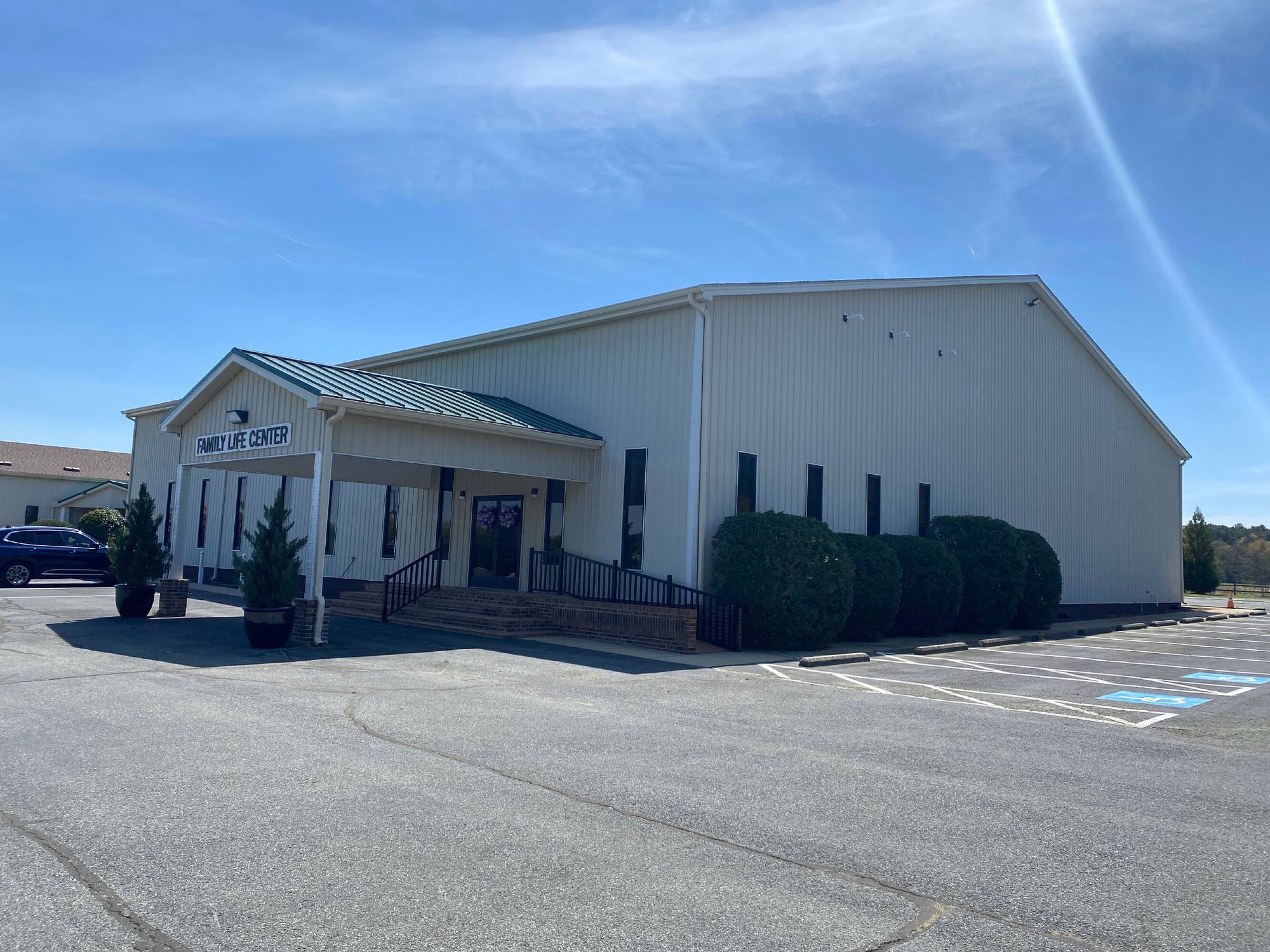 This property features: 8.52‑acre property with multiple buildings.; Main building: **24,908 sq ft with two sanctuaries (seats 700 in main sanctuary)**.; Includes a +/- 1,500 SF warehouse with bay door.