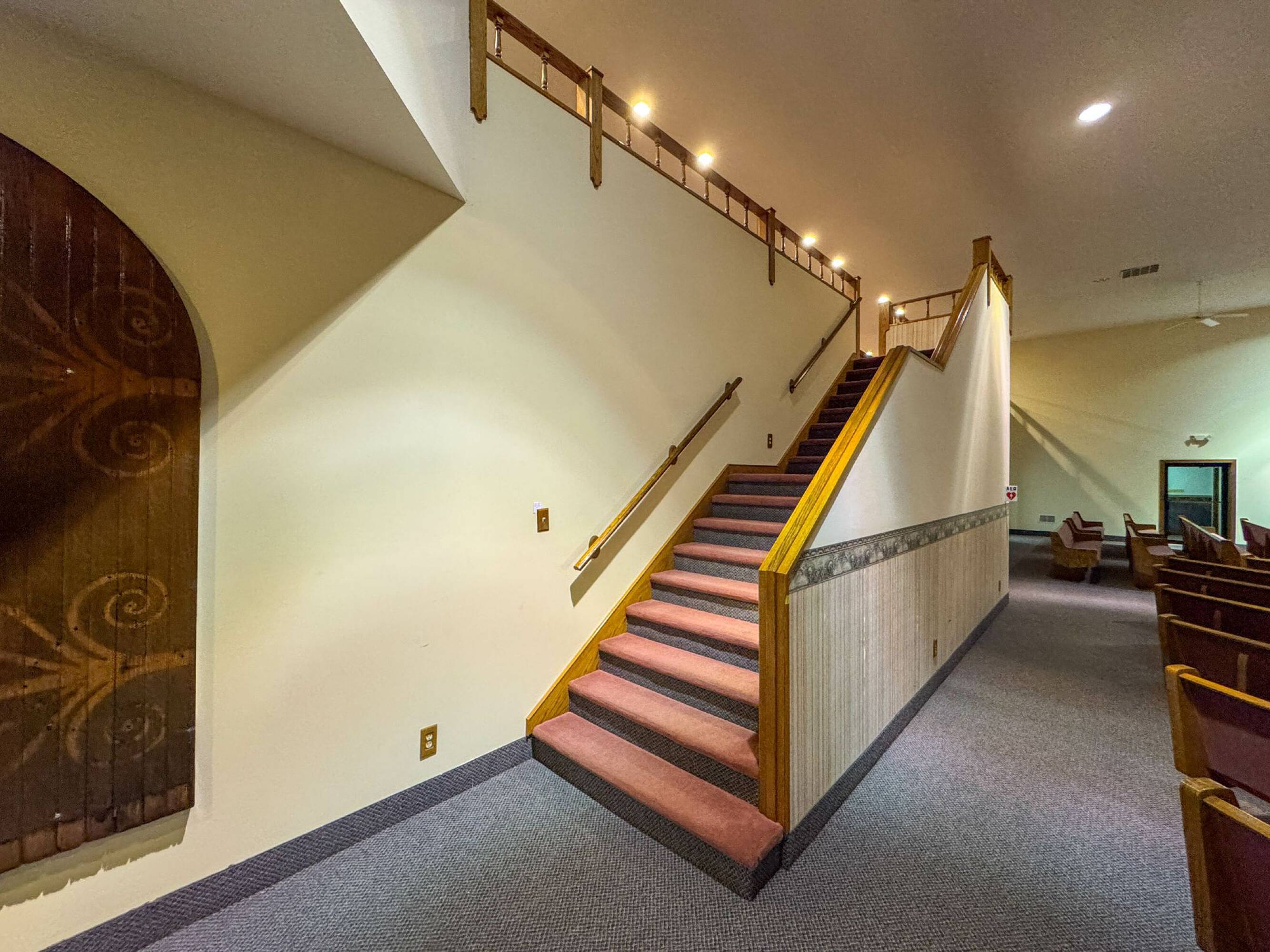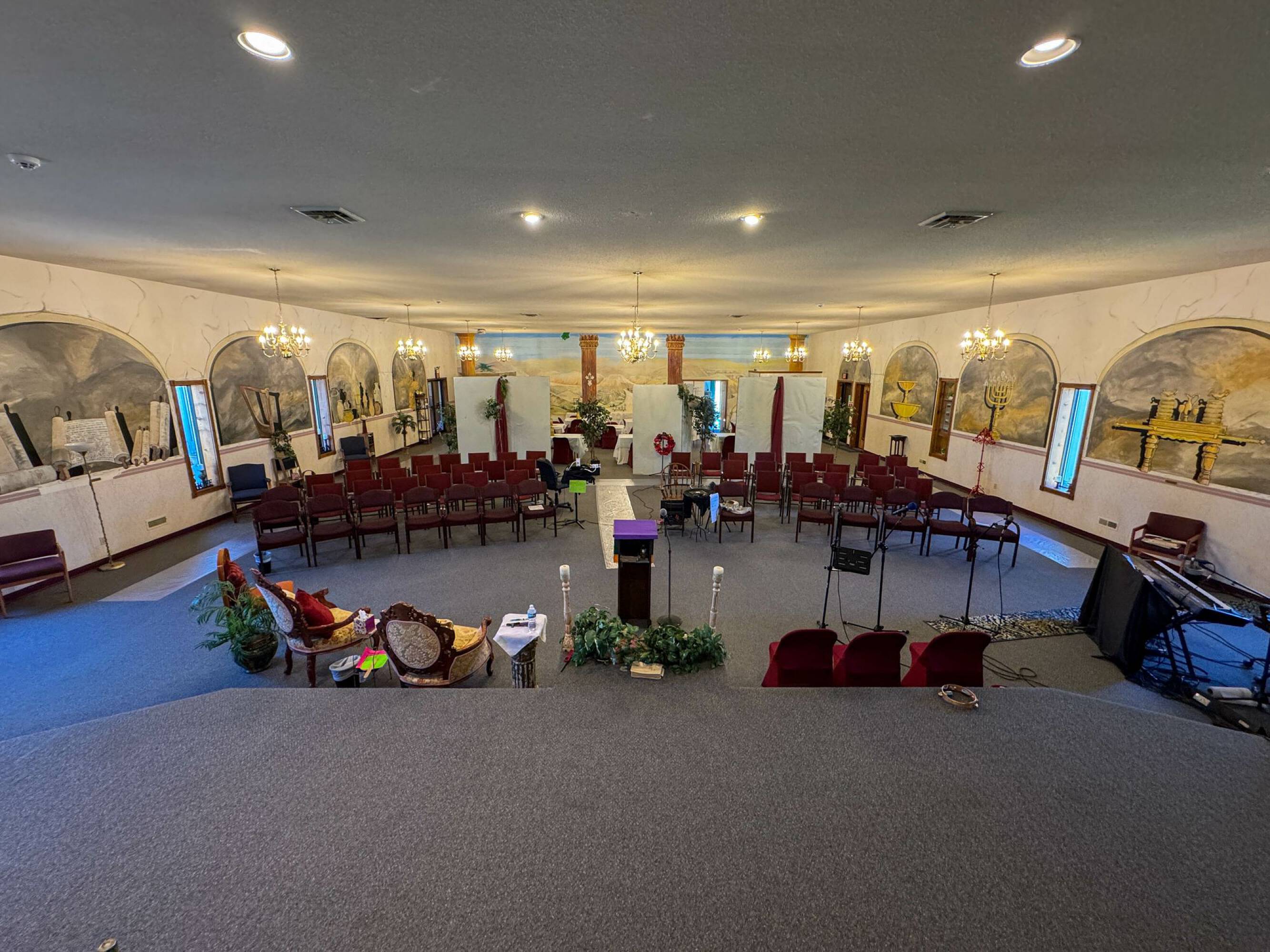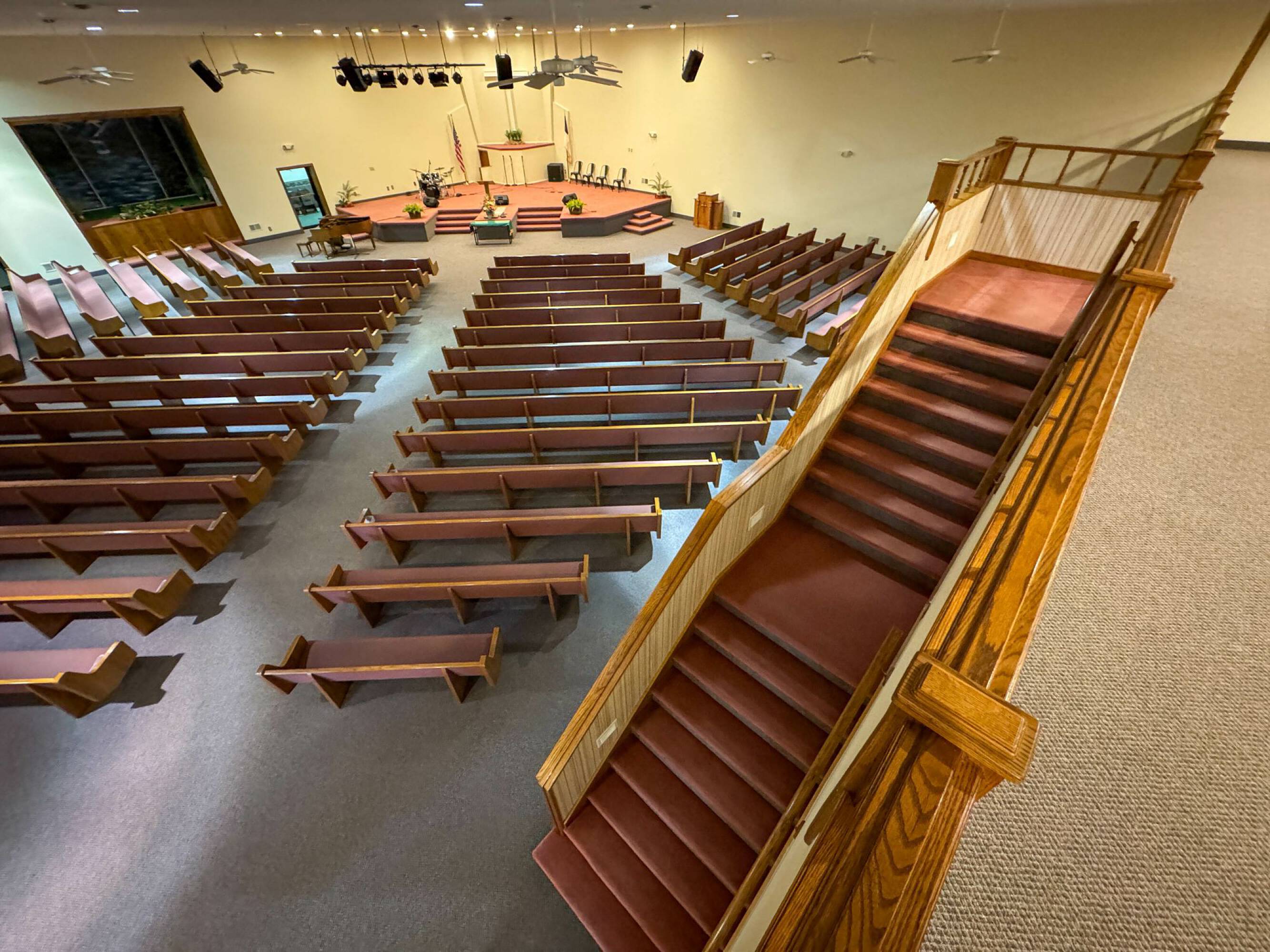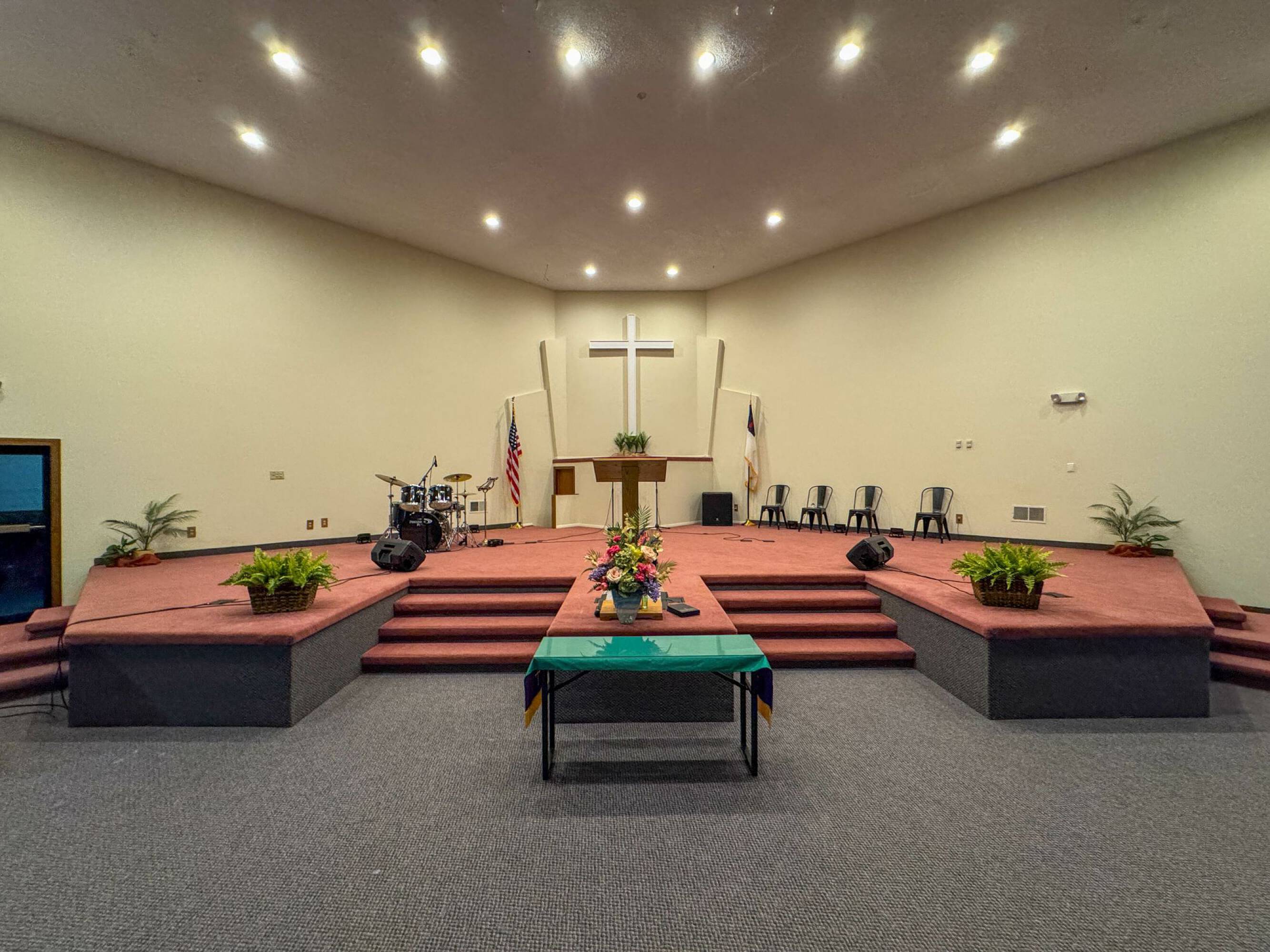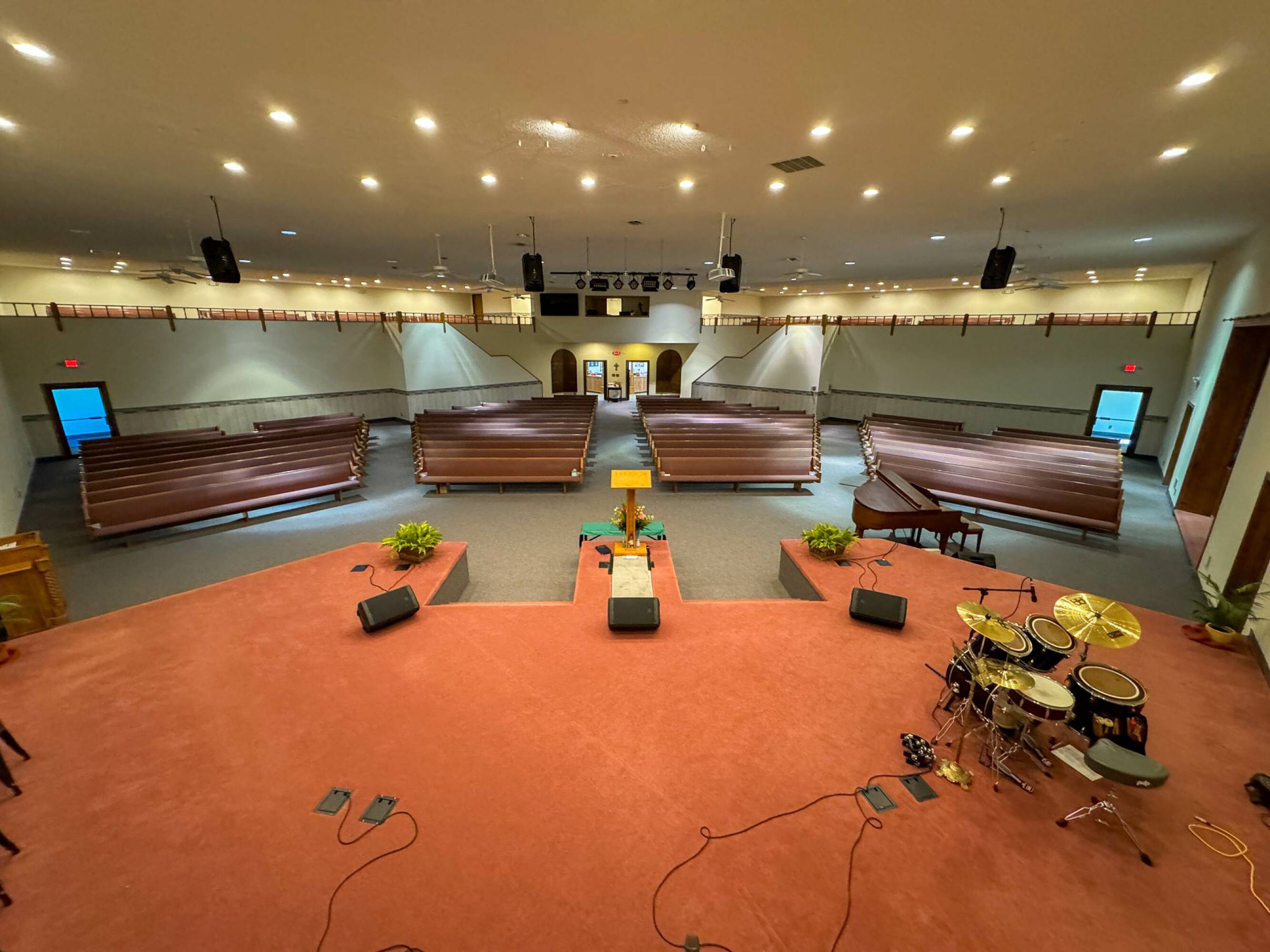 This property features: 8.52‑acre property with multiple buildings.; Main building: **24,908 sq ft with two sanctuaries (seats 700 in main sanctuary)**.; Includes a +/- 1,500 SF warehouse with bay door.
