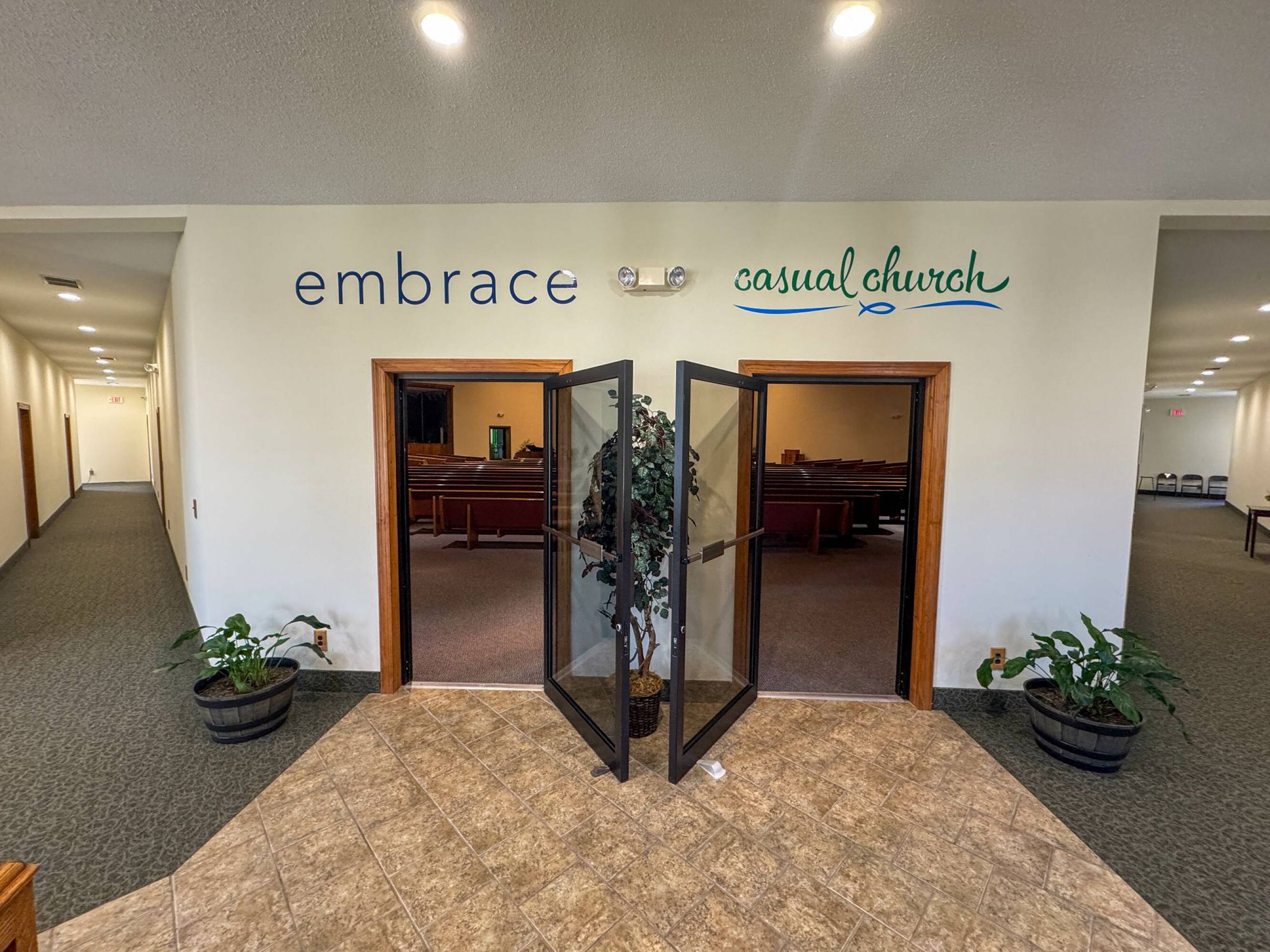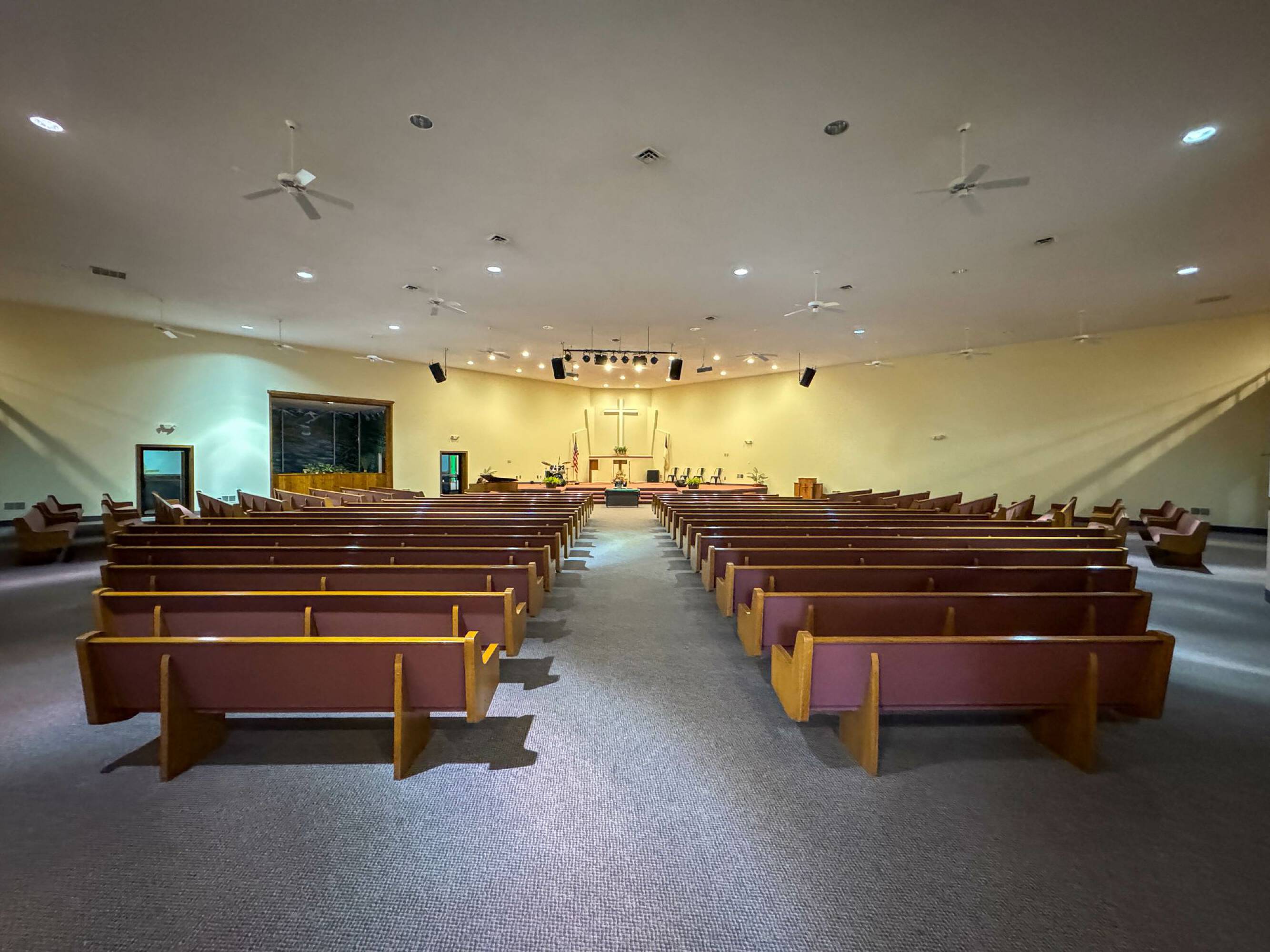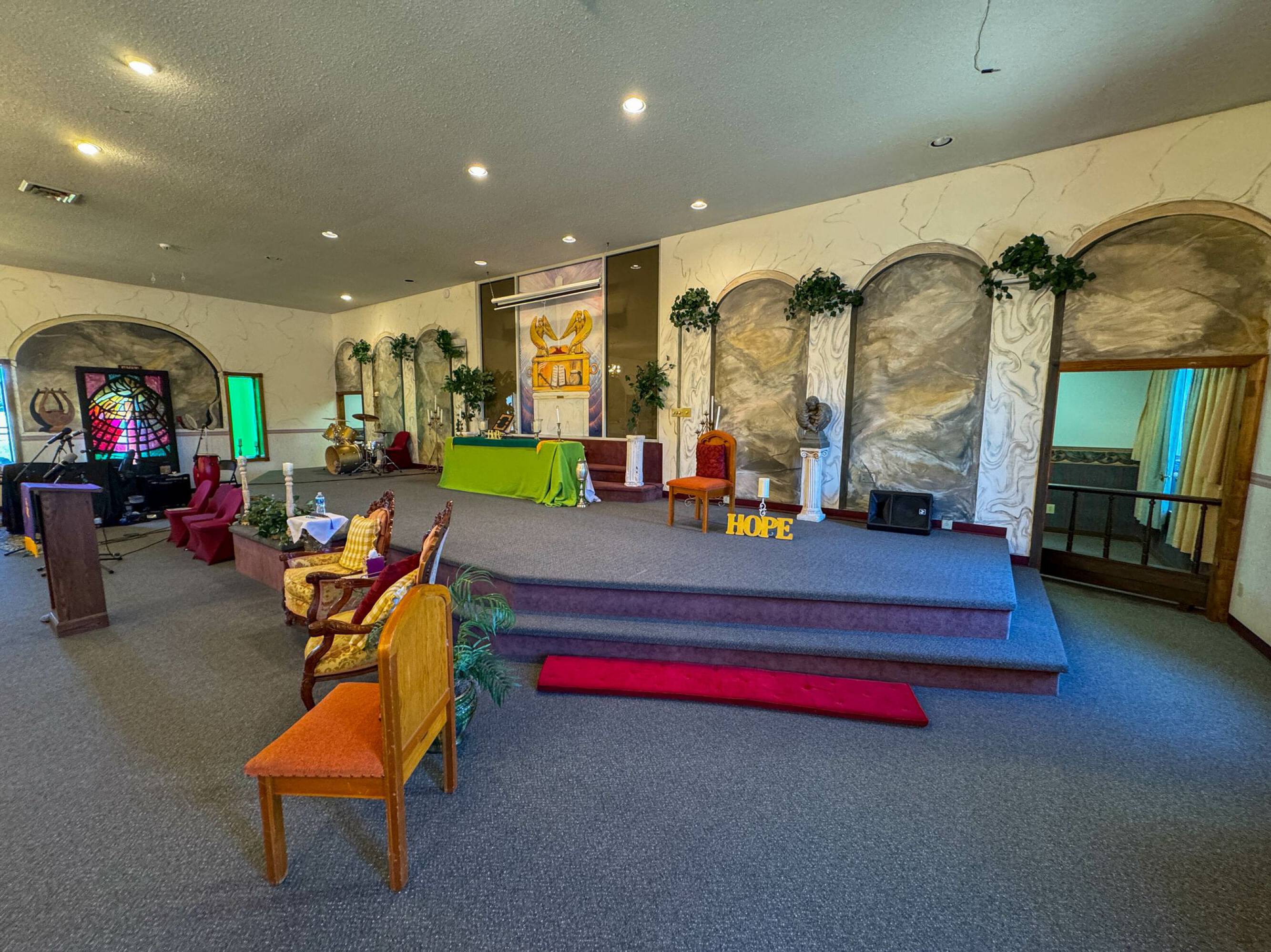 Church facility with sanctuaries, kitchen, offices, warehouse, and house.