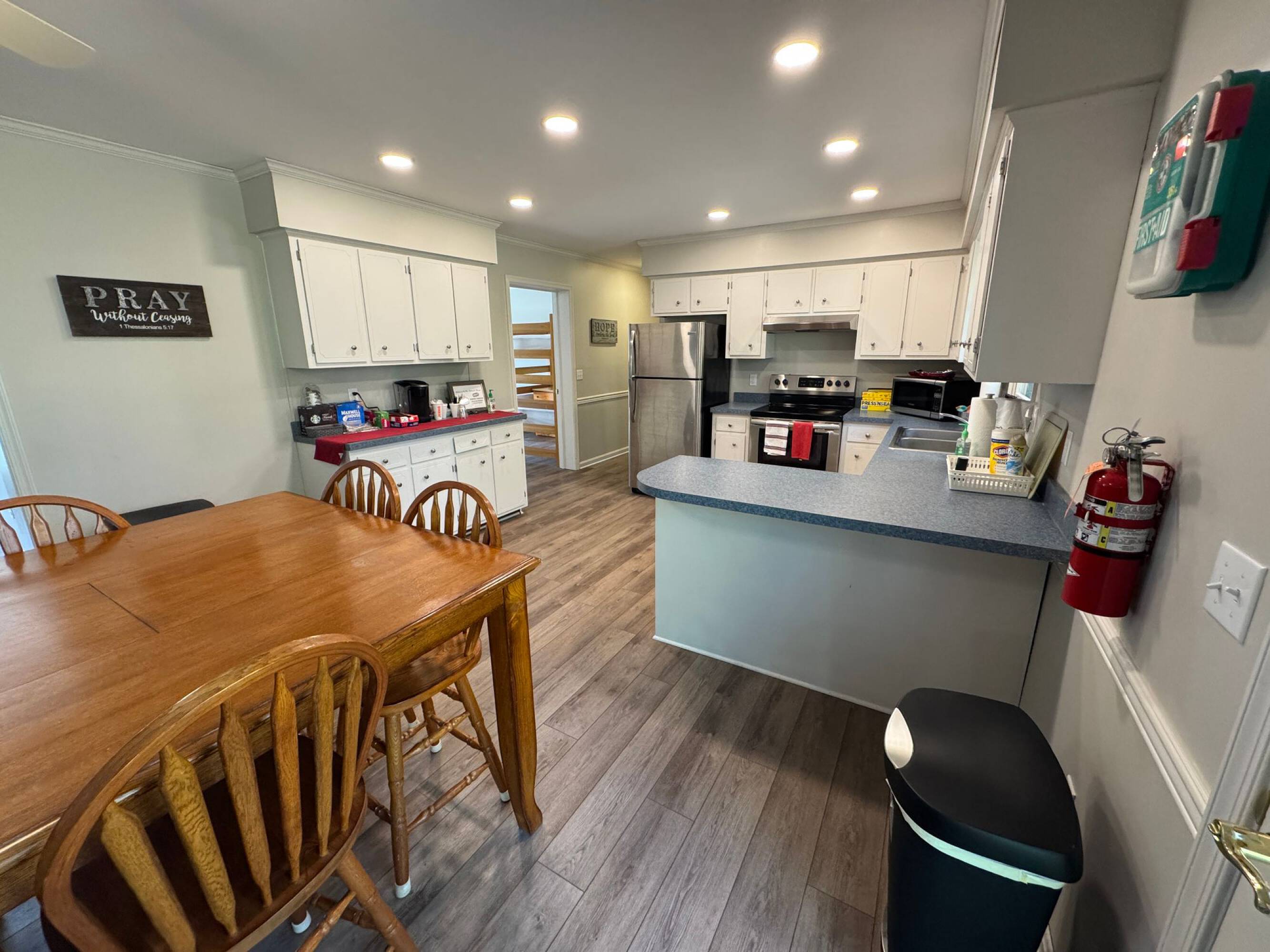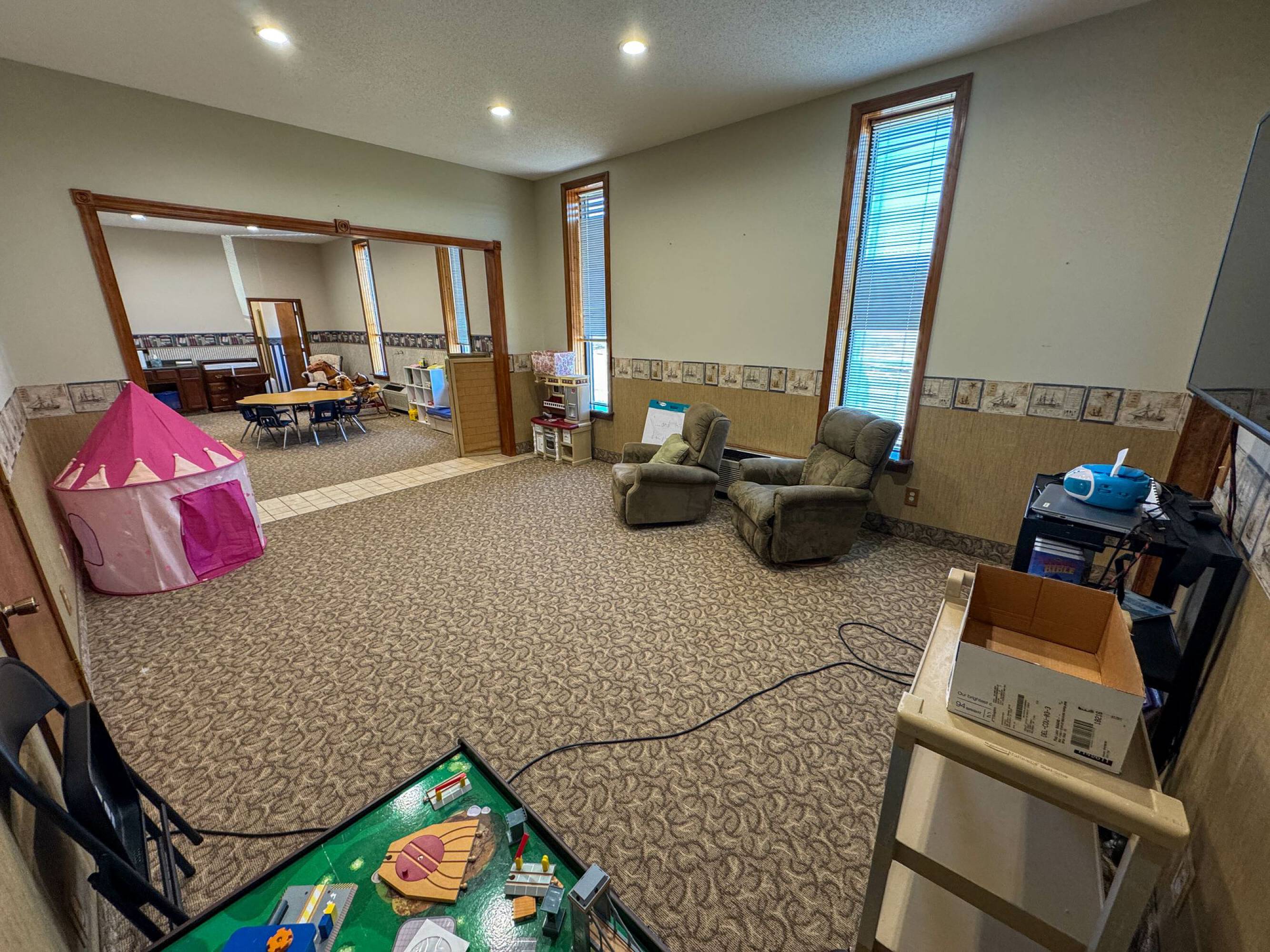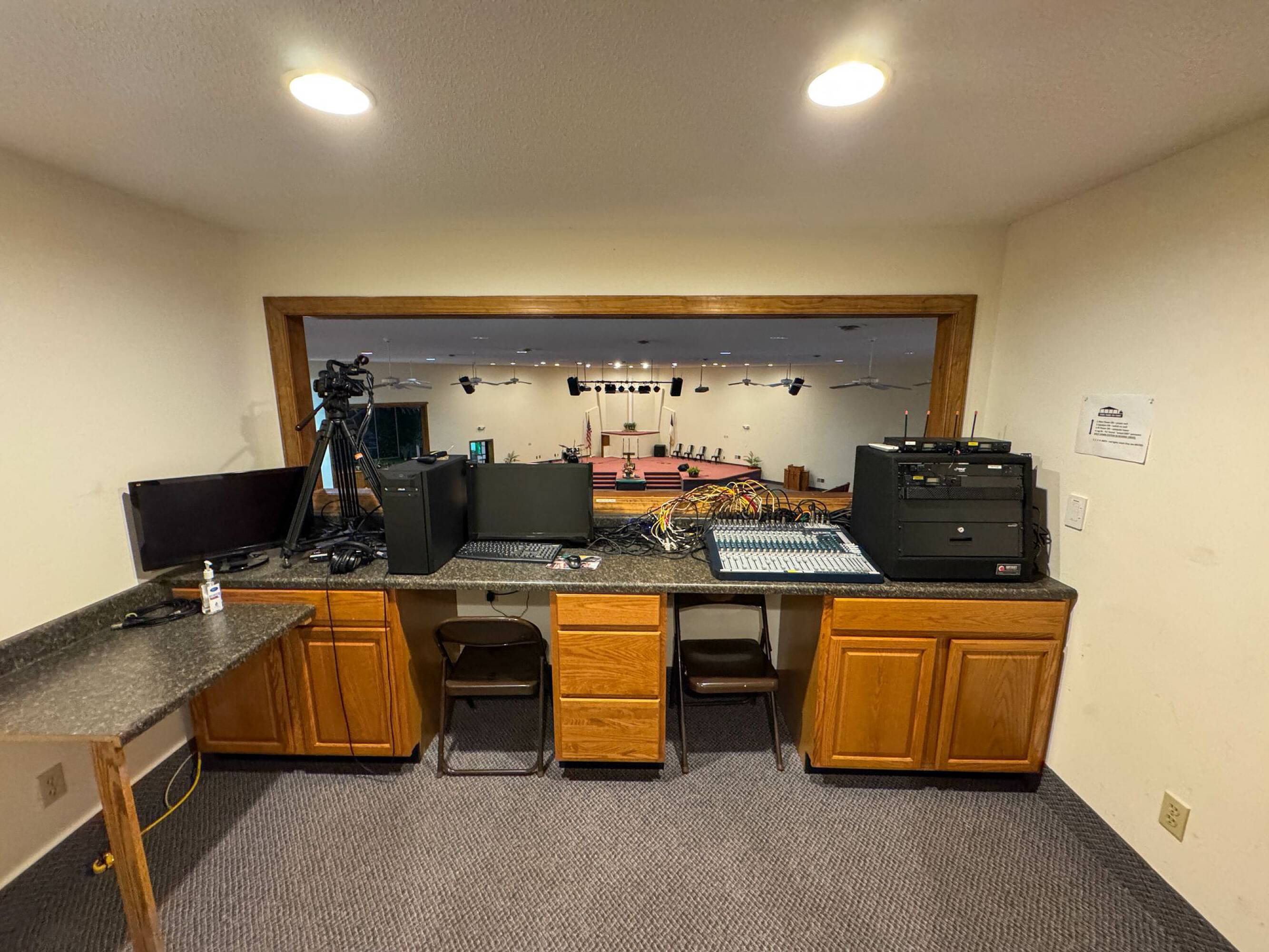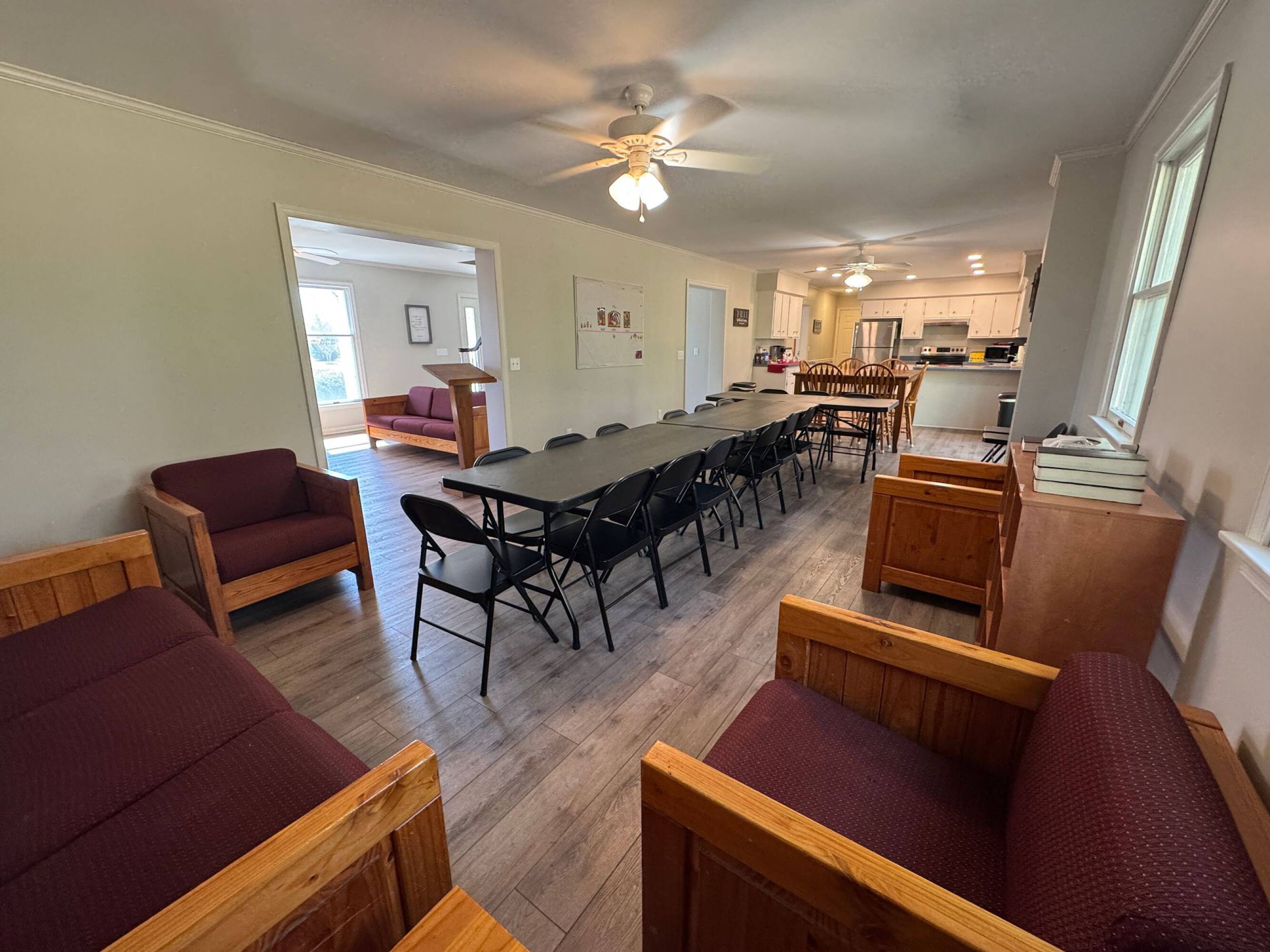 Church facility with sanctuaries, kitchen, offices, warehouse, and house.