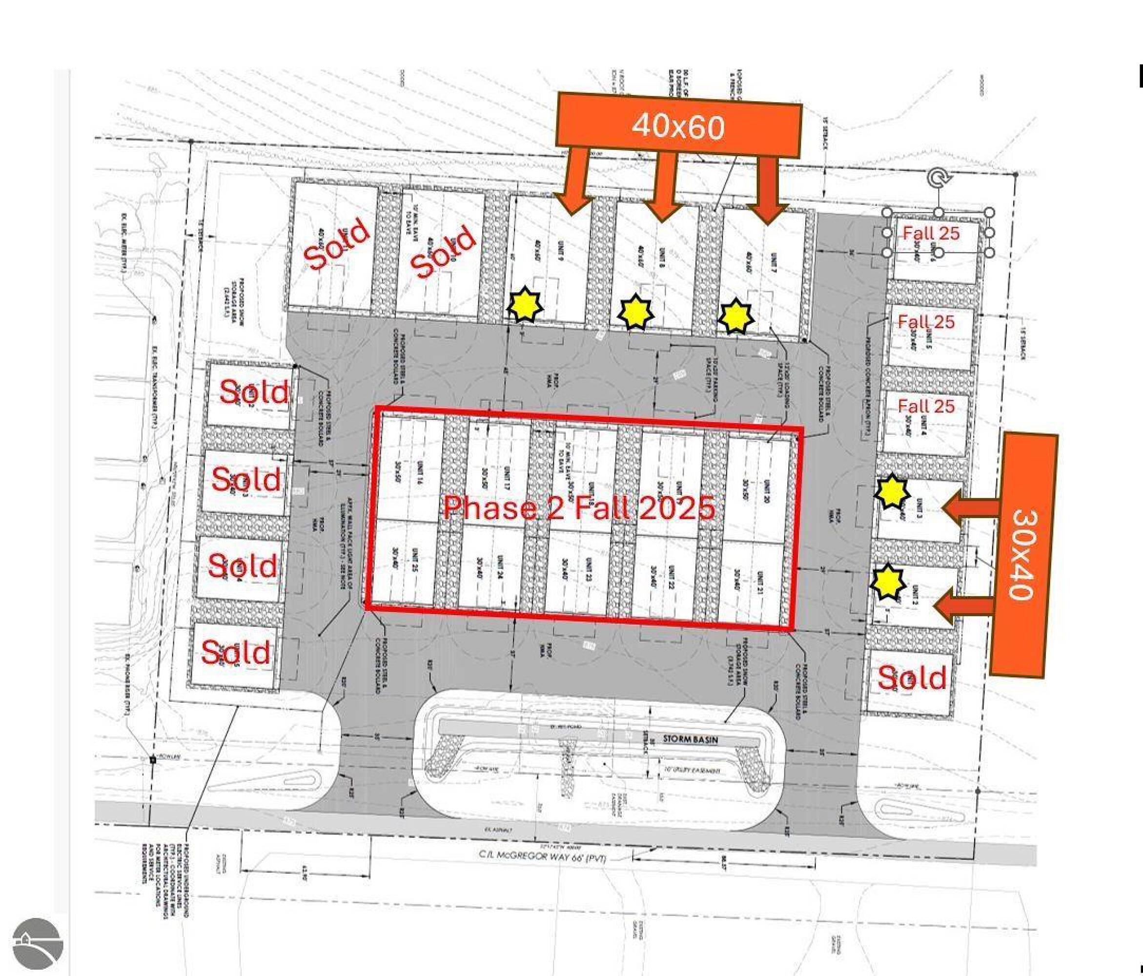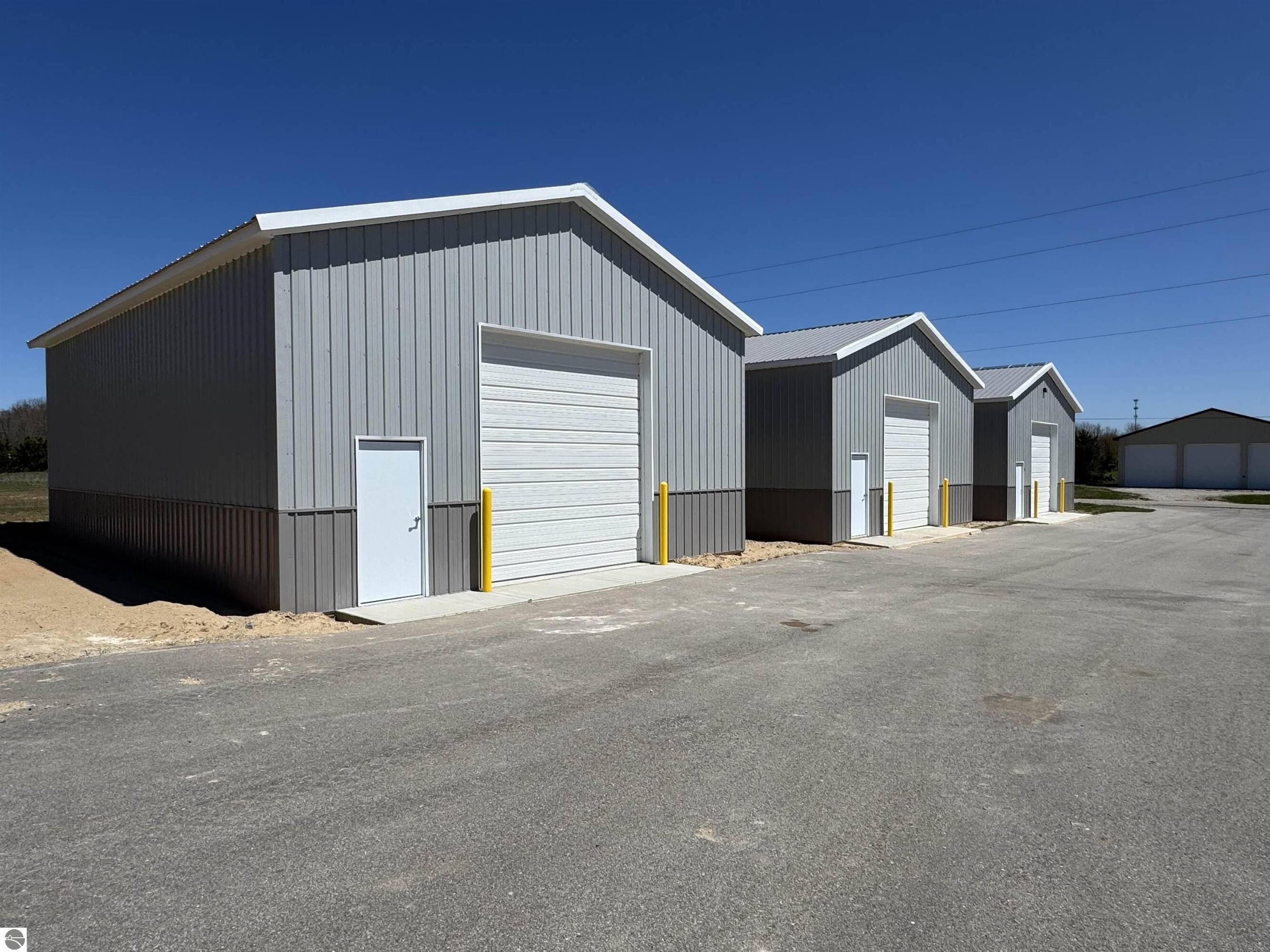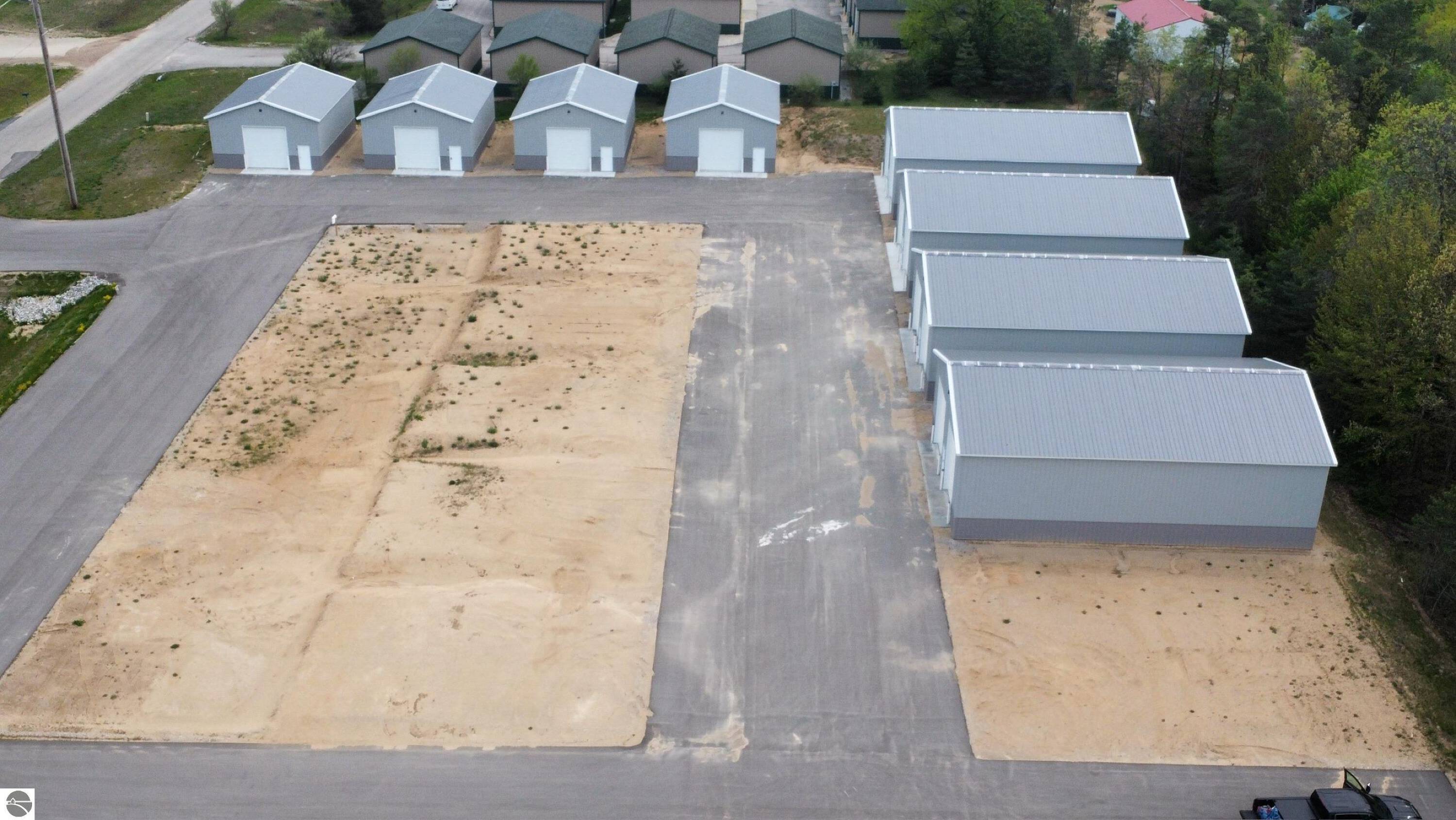 Newly constructed storage barns are available, each measuring 40x60, totaling 2,400 square feet. Each unit includes 16-foot doors, a utility door, 4-inch concrete flooring, and a 200-amp electrical panel. The property is located approximately 10 miles from downtown Traverse City and 4.5 miles from Interlochen. The storage units are situated on the left side towards the end of McGregor Way, accessible by traveling west on US 31 from Chums Corners towards Interlochen and then turning right onto McGregor Way. The property is suitable for use as self-storage facilities, industrial properties, or other commercial real estate ventures.
