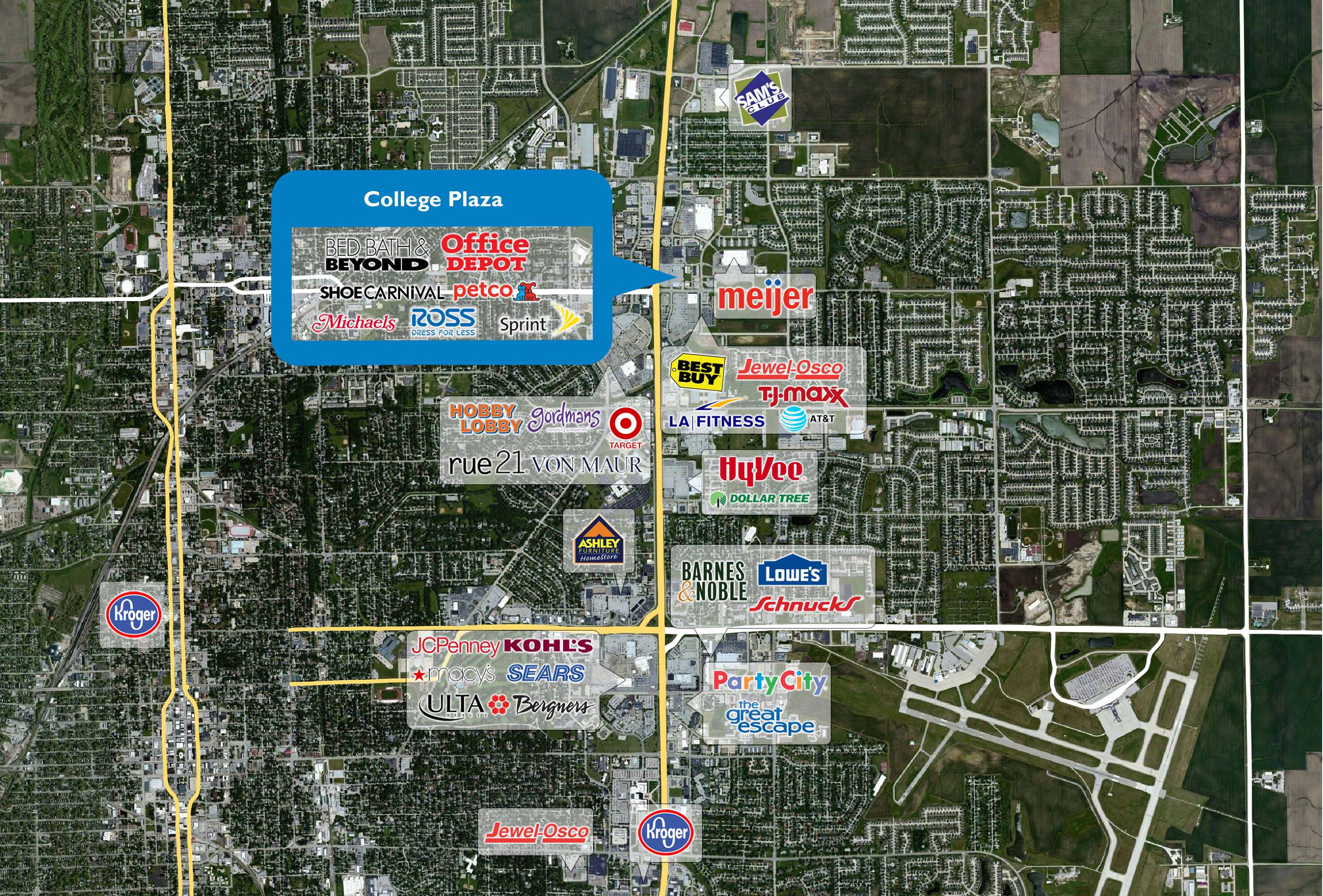 This property features: High‑traffic location at the intersection of Veterans Parkway and College Avenue.; Located in the Normal‑Bloomington retail corridor.; Opportunity to join established retailers such as Ross, Michaels, Sierra, and Office Depot.