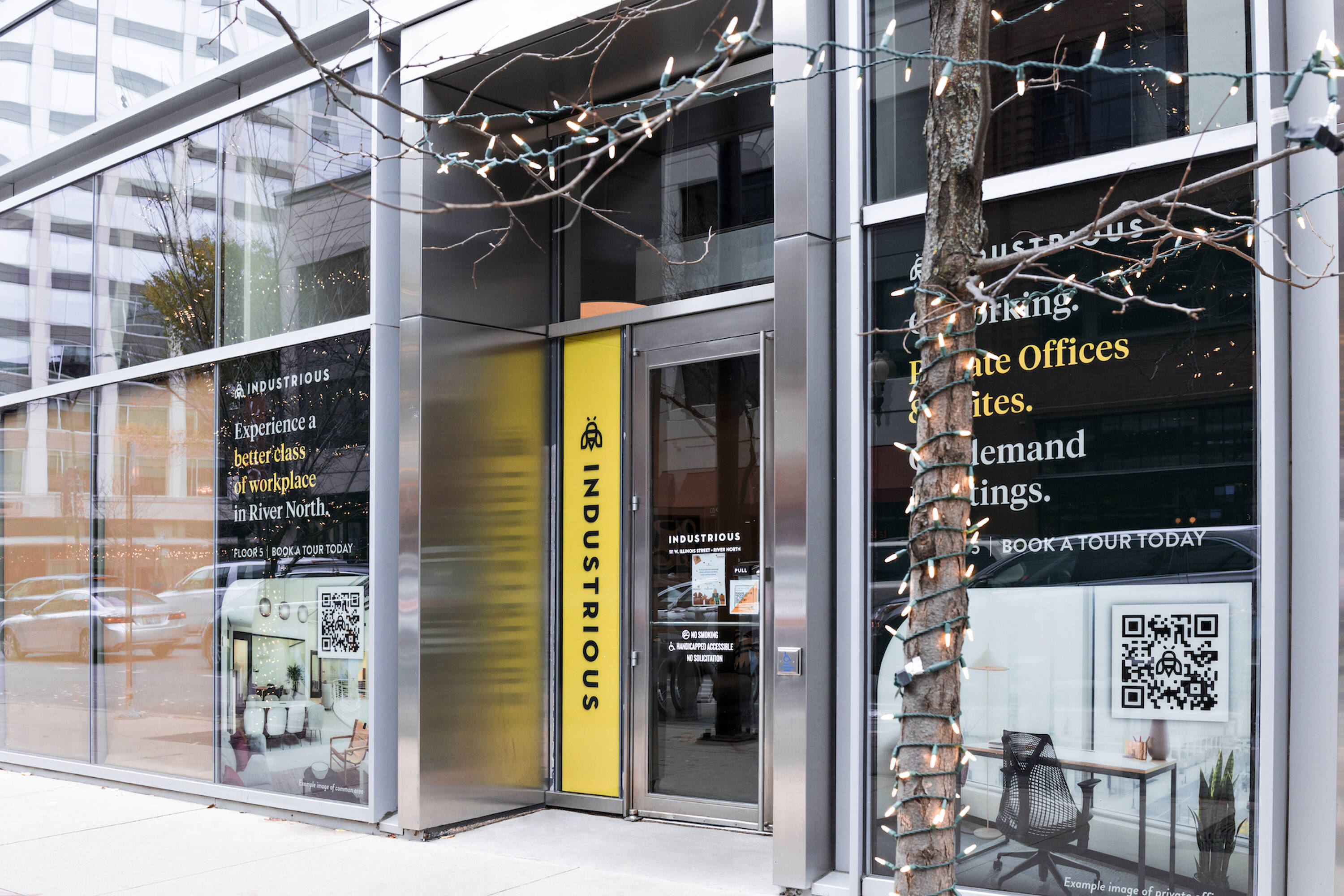 Coworking and private offices in a modern glass building.