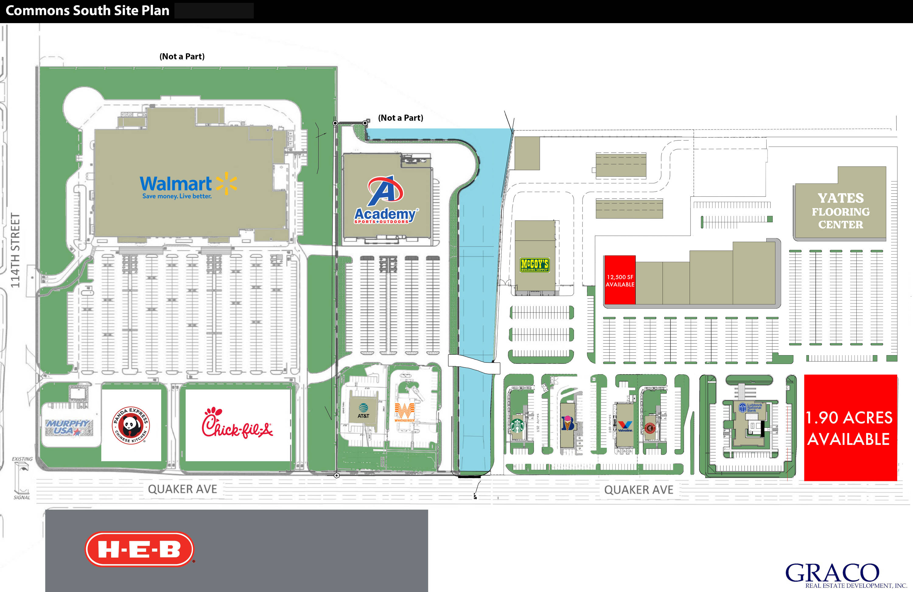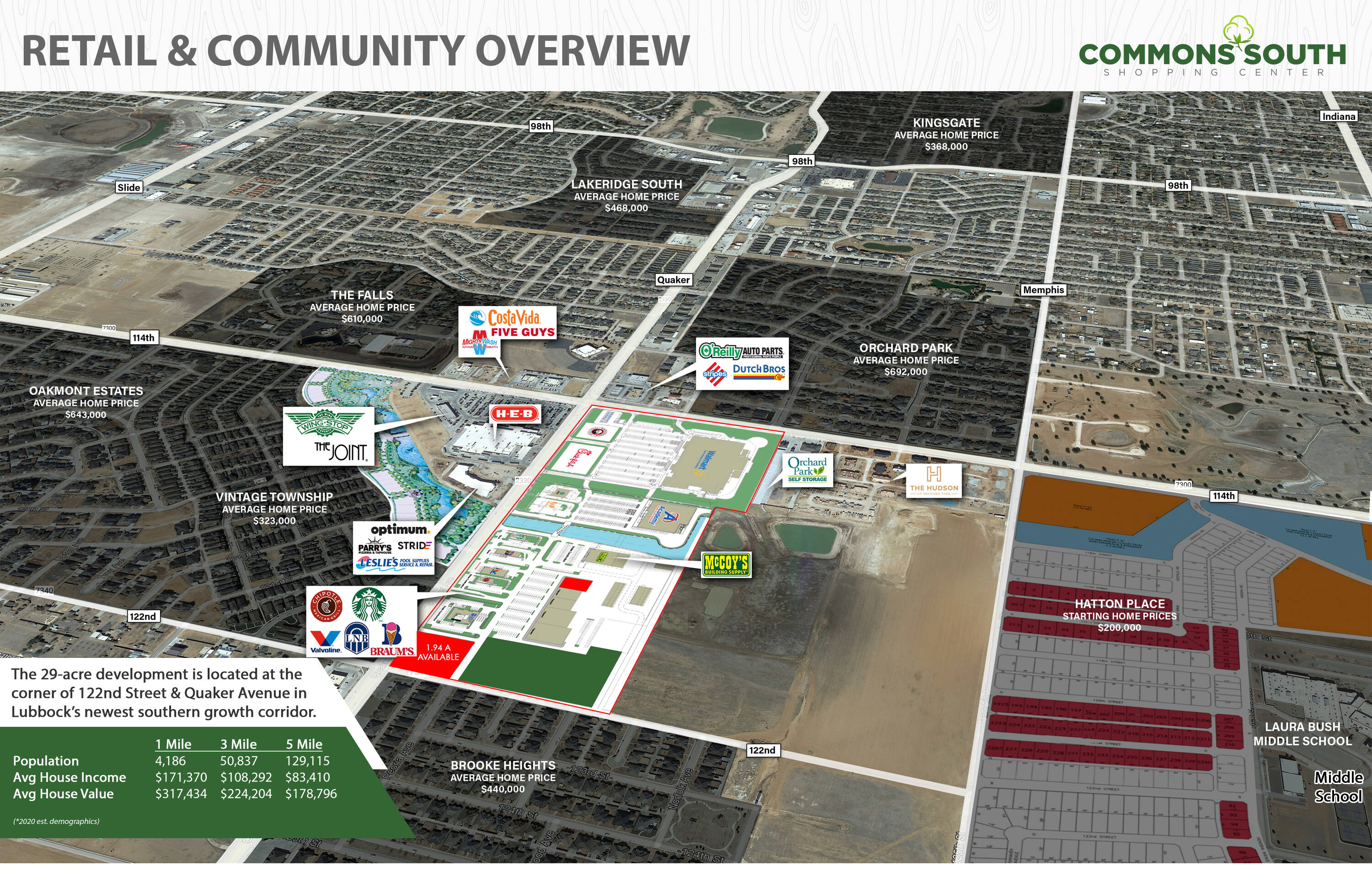 This property features: Premier retail development in South Lubbock.; Located at the high‑traffic corner of 122nd Street & Quaker Avenue.; Situated in Lubbock’s southern growth corridor.